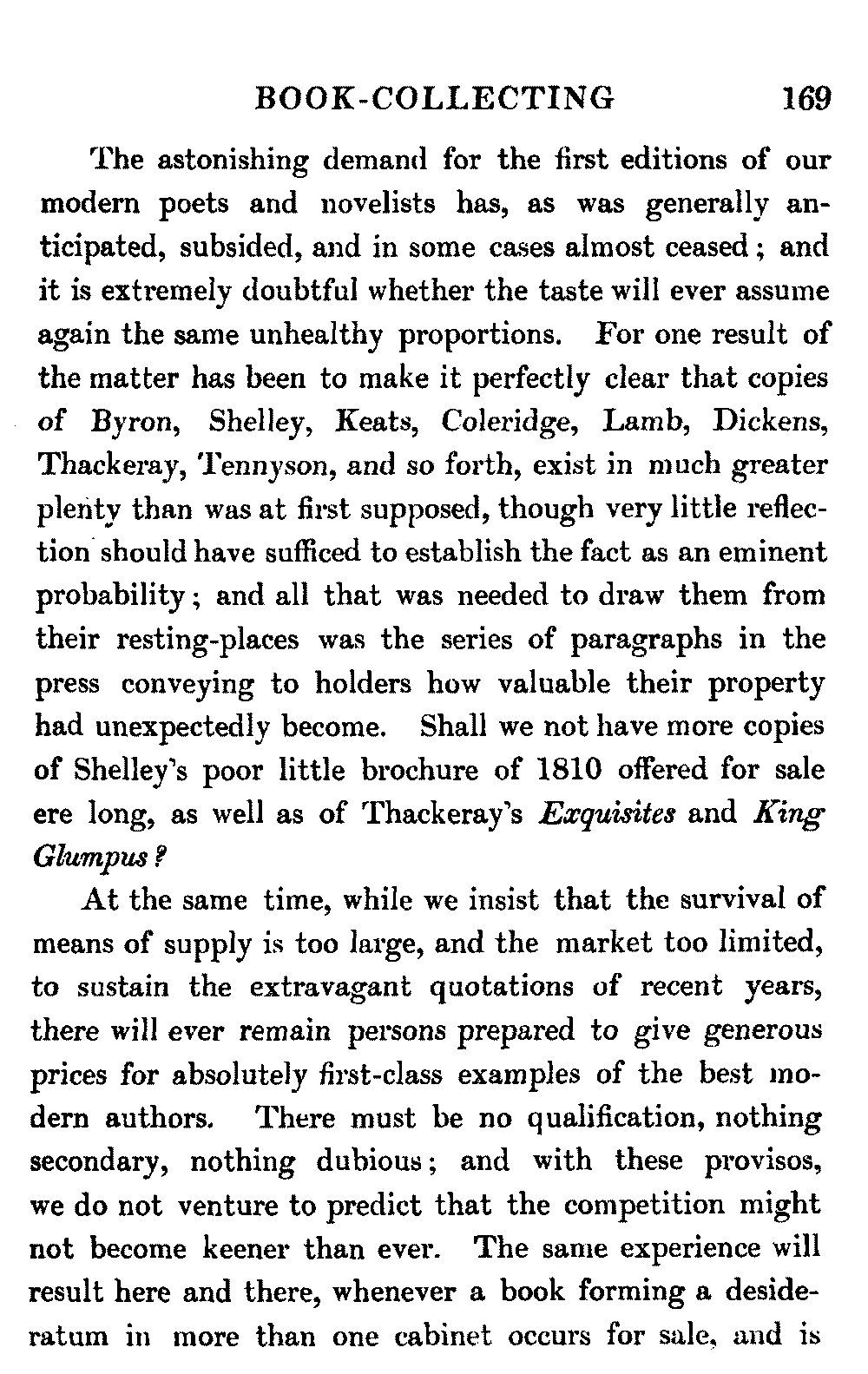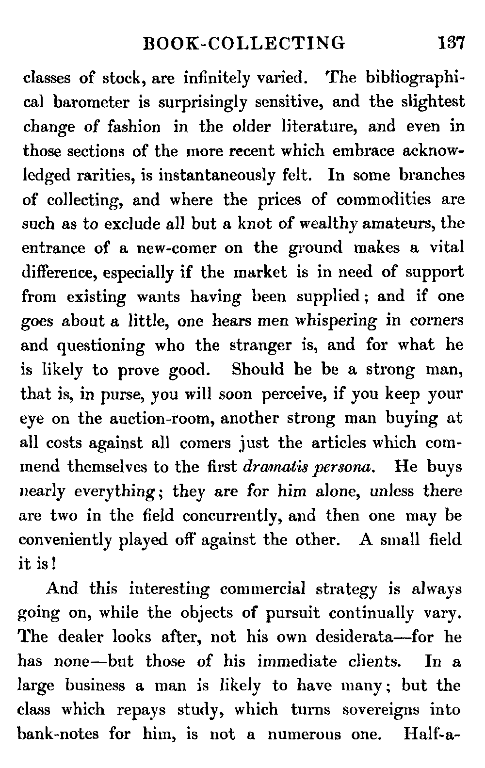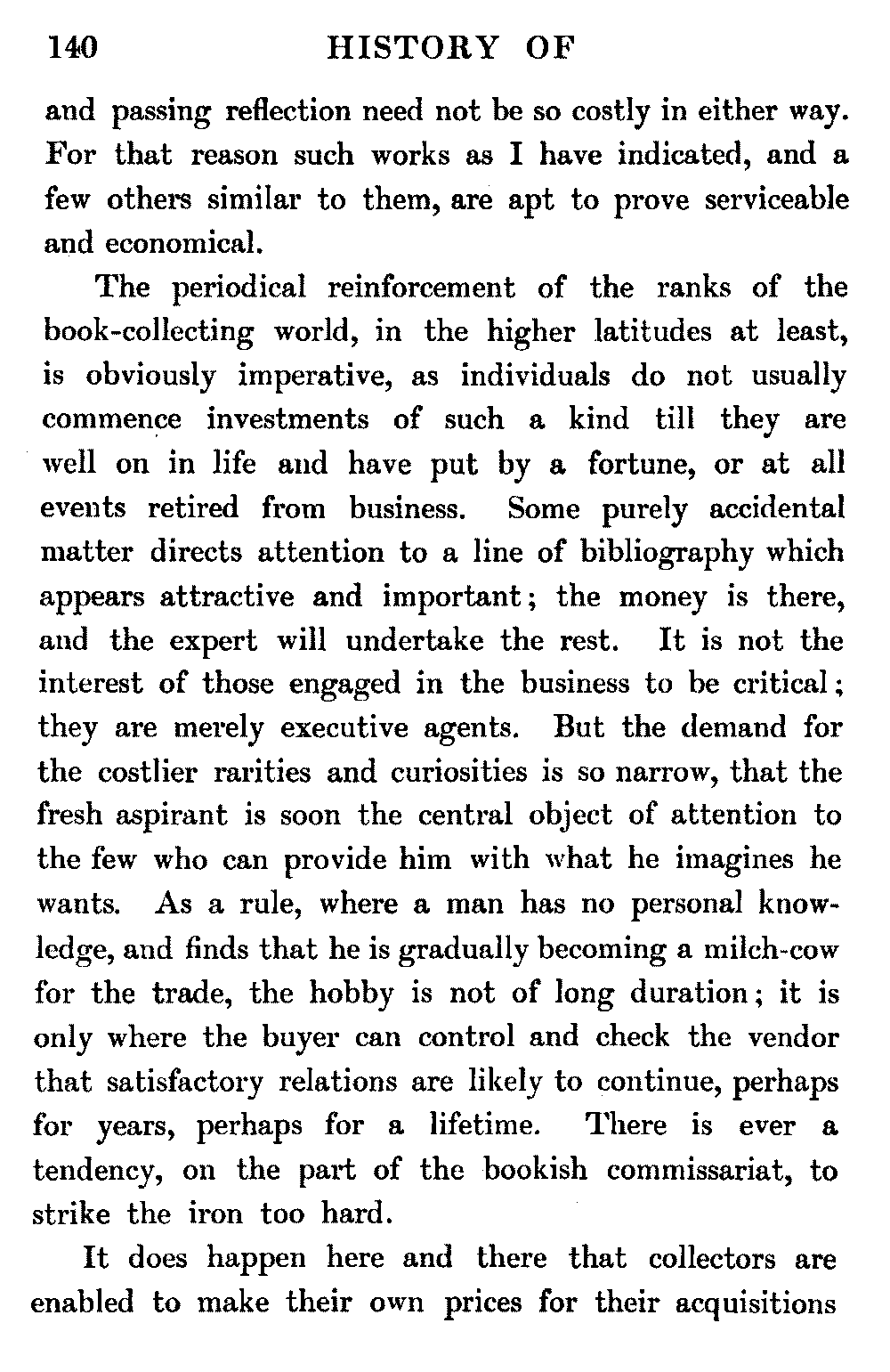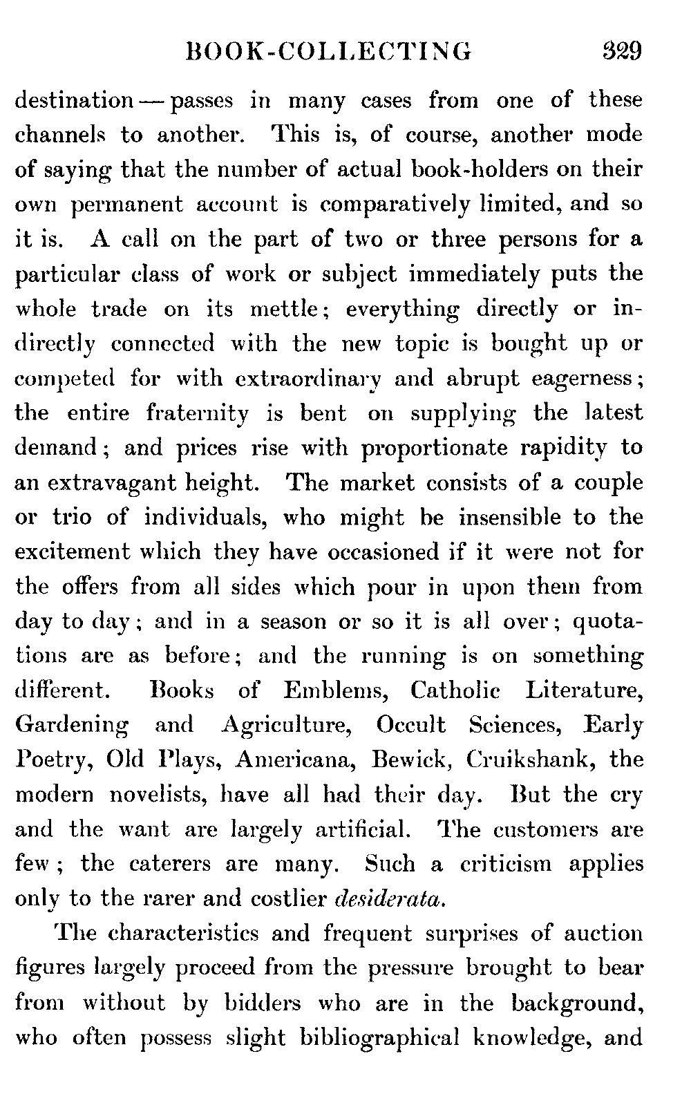 The names in the booksellers' ledgers and in the auctioneers' catalogues as buyers of old or scarce literature are not by any means necessarily always the names of collectors. They are often those of middlemen, through whose hands a volume passes before it reaches its ultimate[329] destination—passes in many cases from one of these channels to another. This is, of course, another mode of saying that the number of actual book-holders on their own permanent account is comparatively limited, and so it is. A call on the part of two or three persons for a particular class of work or subject immediately puts the whole trade on its mettle; everything directly or indirectly connected with the new topic is bought up or competed for with extraordinary and abrupt eagerness; the entire fraternity is bent on supplying the latest demand; and prices rise with proportionate rapidity to an extravagant height. The market consists of a couple or trio of individuals, who might be insensible to the excitement which they have occasioned if it were not for the offers from all sides which pour in upon them from day to day; and in a season or so it is all over; quotations are as before; and the running is on something different. Books of Emblems, Catholic Literature, Gardening and Agriculture, Occult Sciences, Early Poetry, Old Plays, Americana, Bewick, Cruikshank, the modern novelists, have all had their day. But the cry and the want are largely artificial. The customers are few; the caterers are many. Such a criticism applies only to the rarer and costlier desiderata.
