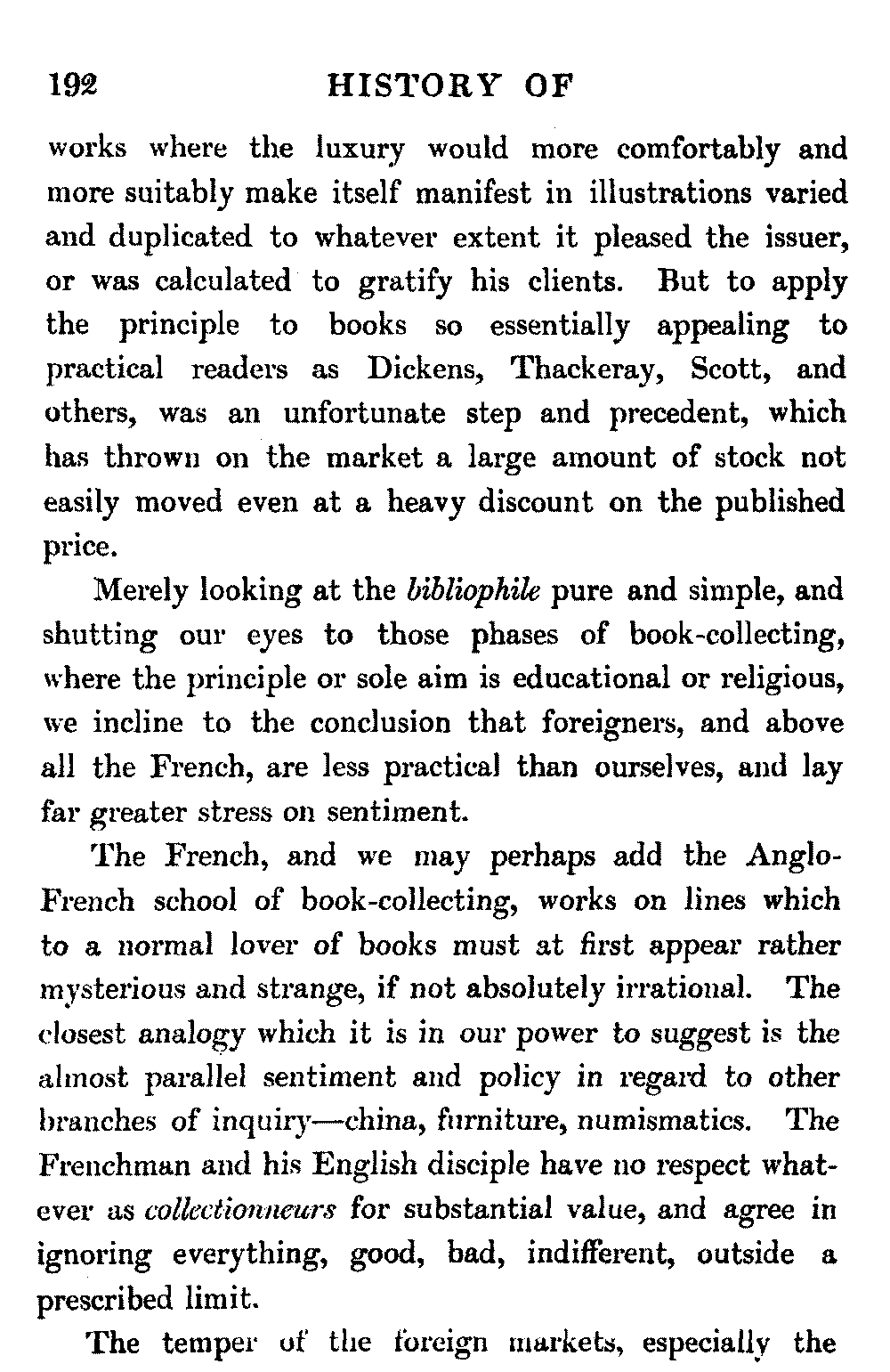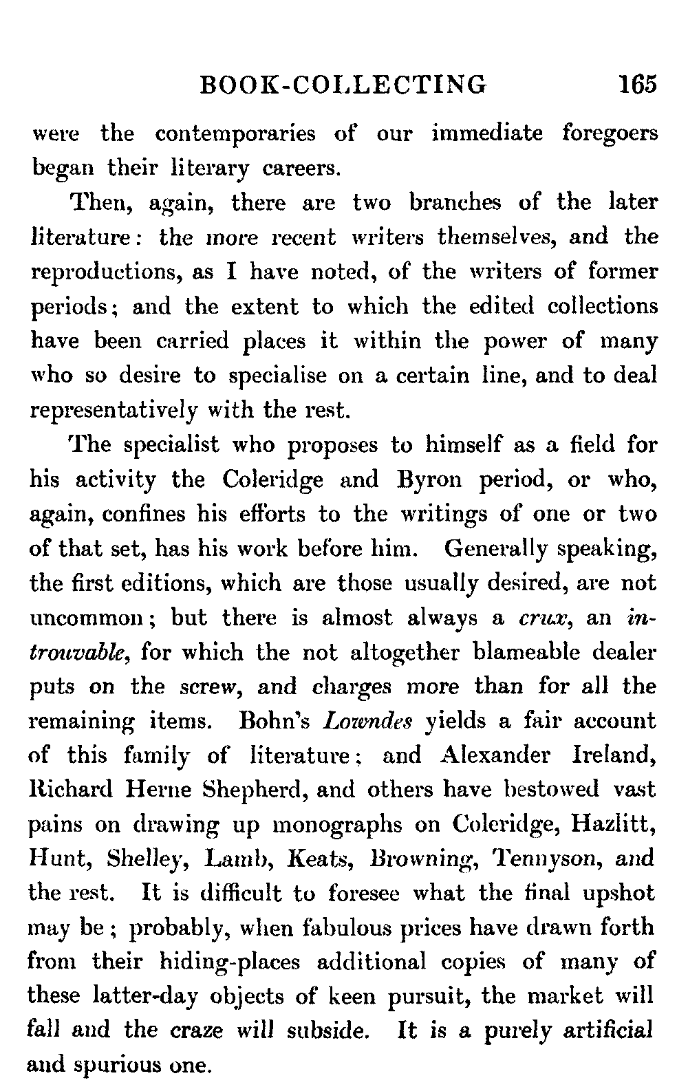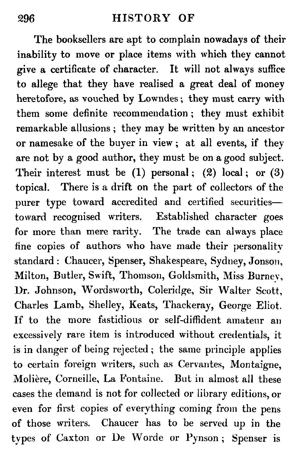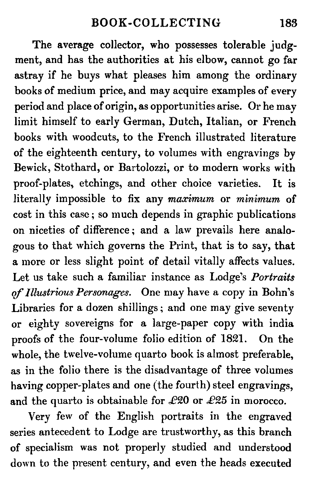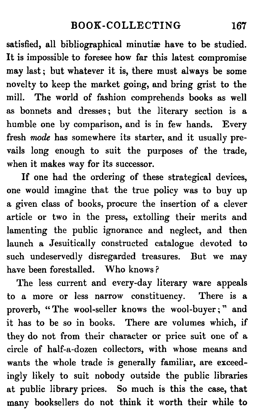 The names in the booksellers' ledgers and in the auctioneers' catalogues as buyers of old or scarce literature are not by any means necessarily always the names of collectors. They are often those of middlemen, through whose hands a volume passes before it reaches its ultimate[329] destination—passes in many cases from one of these channels to another. This is, of course, another mode of saying that the number of actual book-holders on their own permanent account is comparatively limited, and so it is. A call on the part of two or three persons for a particular class of work or subject immediately puts the whole trade on its mettle; everything directly or indirectly connected with the new topic is bought up or competed for with extraordinary and abrupt eagerness; the entire fraternity is bent on supplying the latest demand; and prices rise with proportionate rapidity to an extravagant height. The market consists of a couple or trio of individuals, who might be insensible to the excitement which they have occasioned if it were not for the offers from all sides which pour in upon them from day to day; and in a season or so it is all over; quotations are as before; and the running is on something different. Books of Emblems, Catholic Literature, Gardening and Agriculture, Occult Sciences, Early Poetry, Old Plays, Americana, Bewick, Cruikshank, the modern novelists, have all had their day. But the cry and the want are largely artificial. The customers are few; the caterers are many. Such a criticism applies only to the rarer and costlier desiderata.