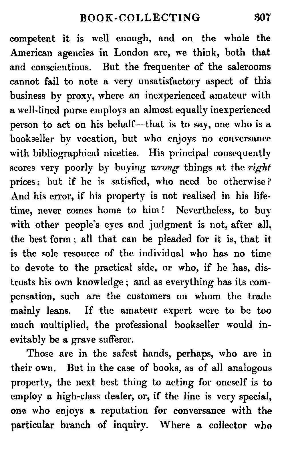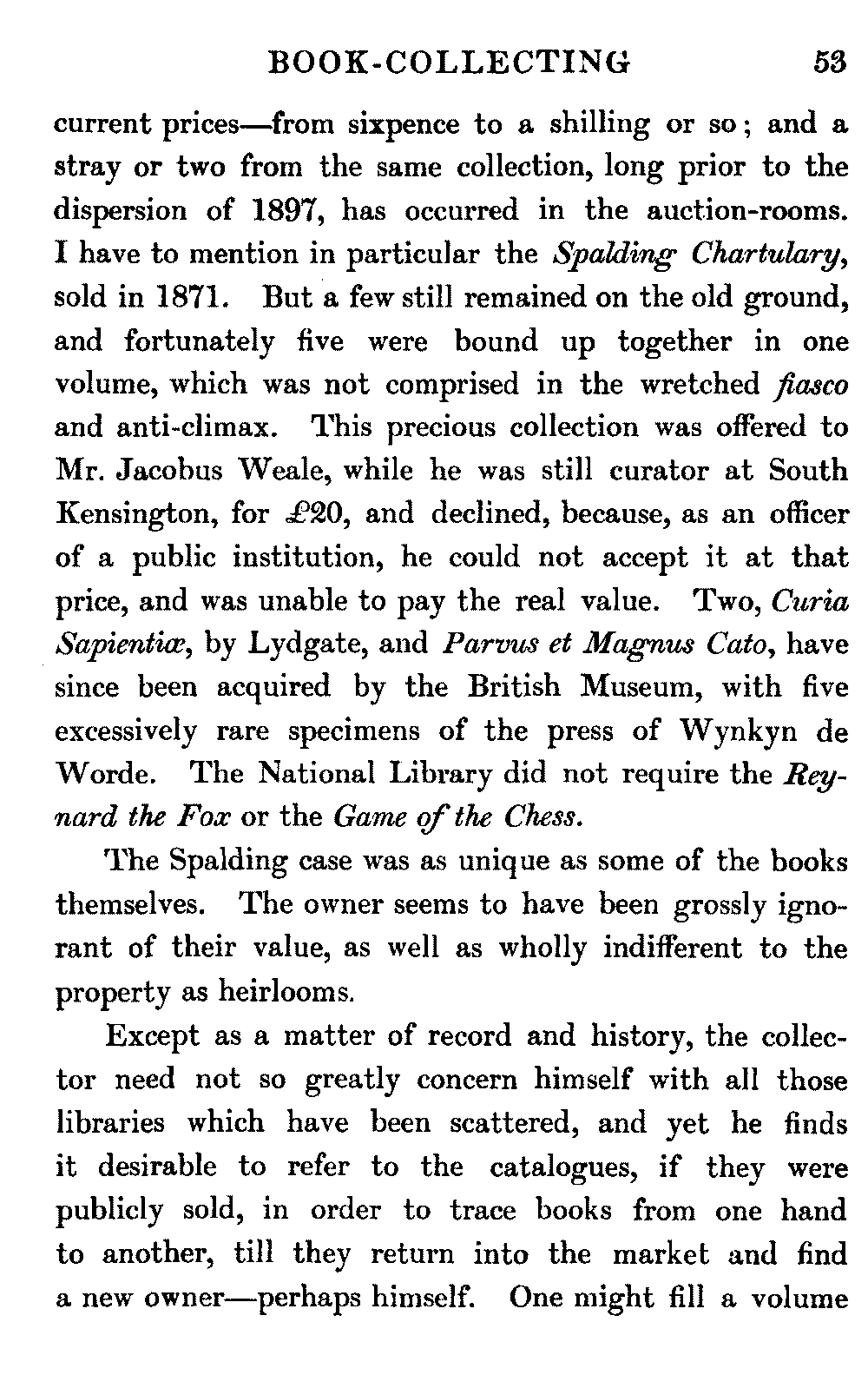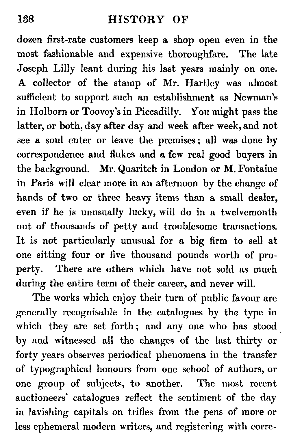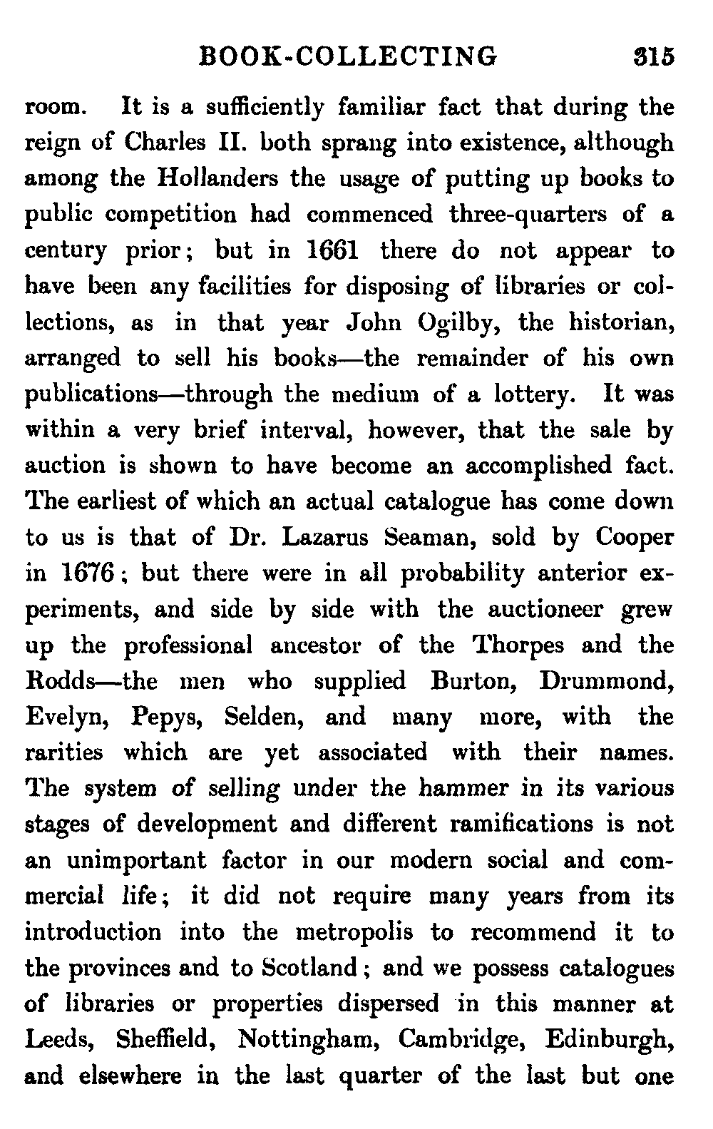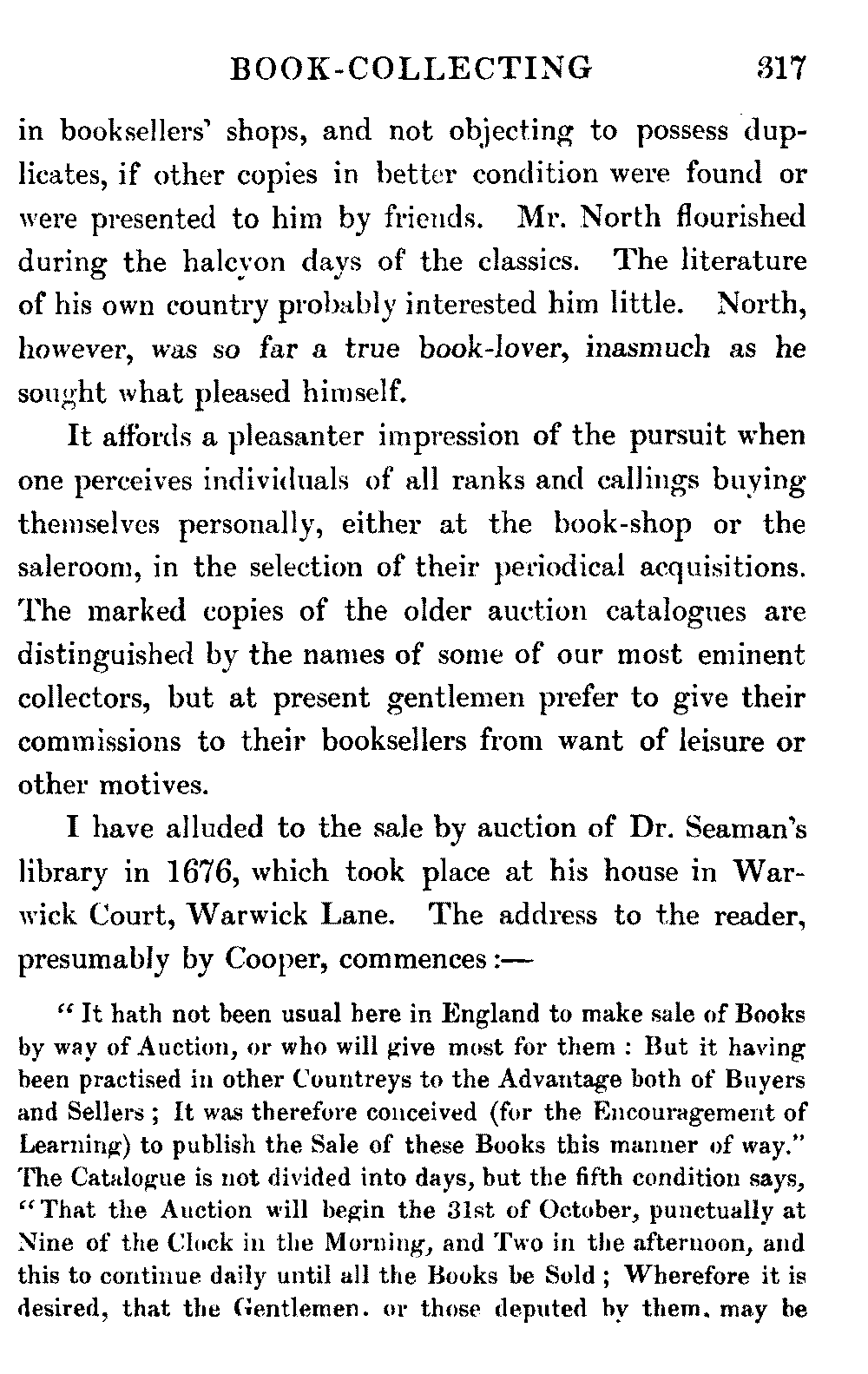 It affords a pleasanter impression of the pursuit when one perceives individuals of all ranks and callings buying themselves personally, either at the book-shop or the saleroom, in the selection of their periodical acquisitions. The marked copies of the older auction catalogues are distinguished by the names of some of our most eminent collectors, but at present gentlemen prefer to give their commissions to their booksellers from want of leisure or other motives.