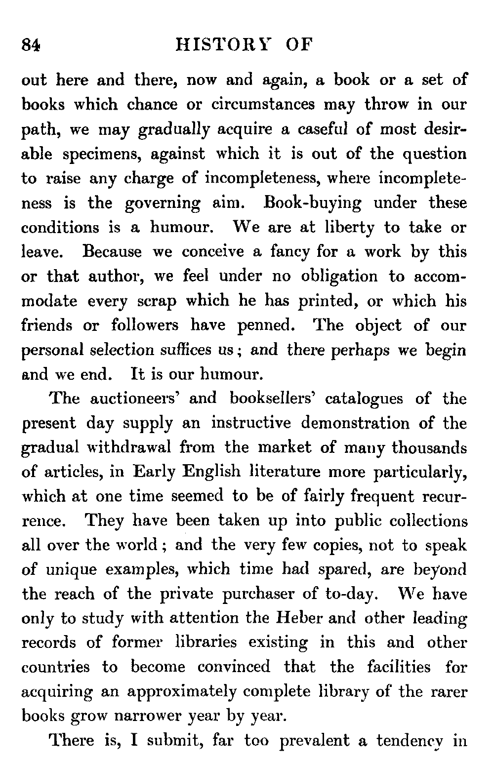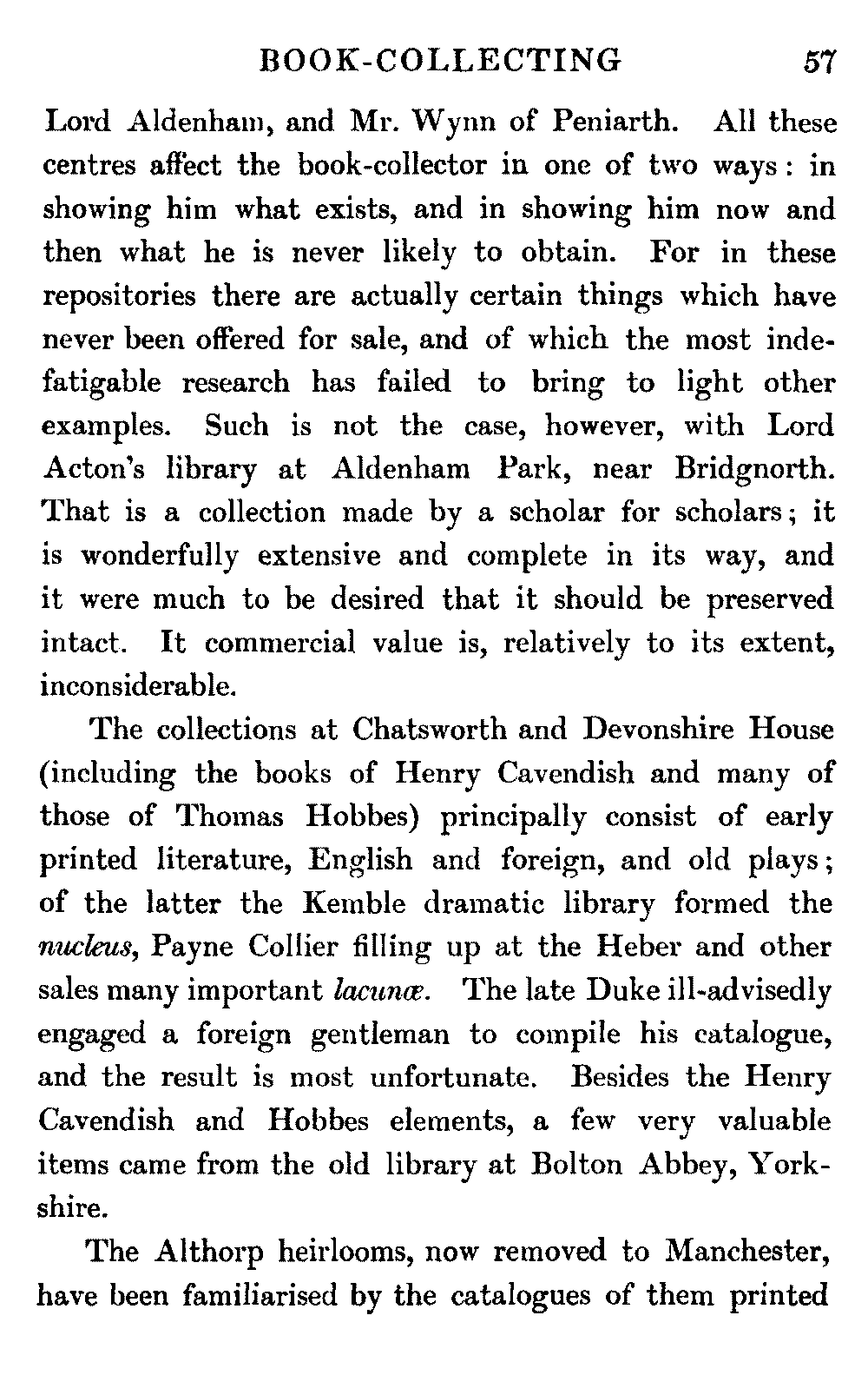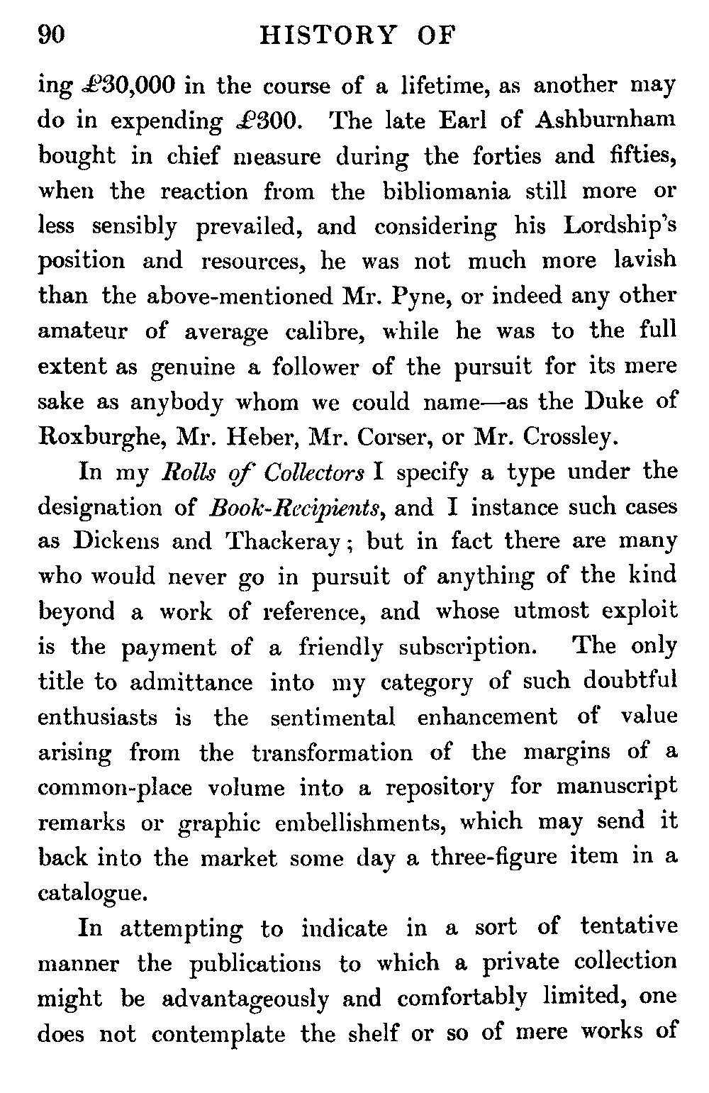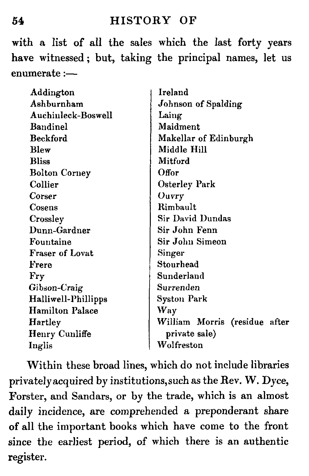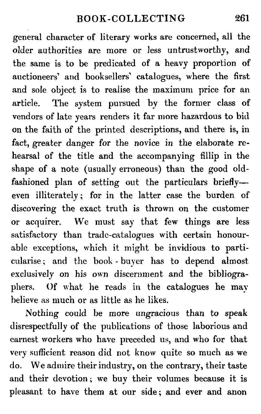 It affords a pleasanter impression of the pursuit when one perceives individuals of all ranks and callings buying themselves personally, either at the book-shop or the saleroom, in the selection of their periodical acquisitions. The marked copies of the older auction catalogues are distinguished by the names of some of our most eminent collectors, but at present gentlemen prefer to give their commissions to their booksellers from want of leisure or other motives.