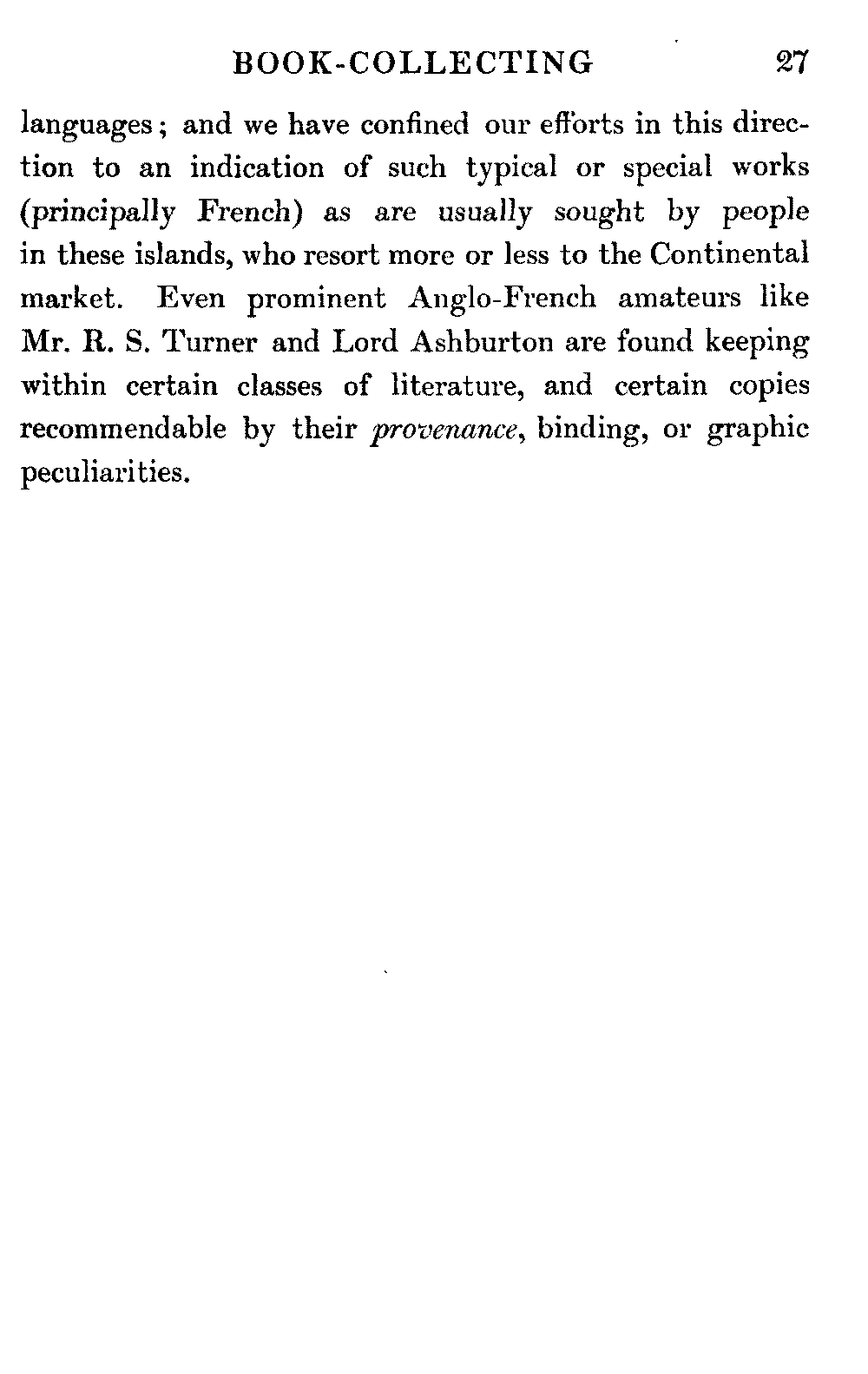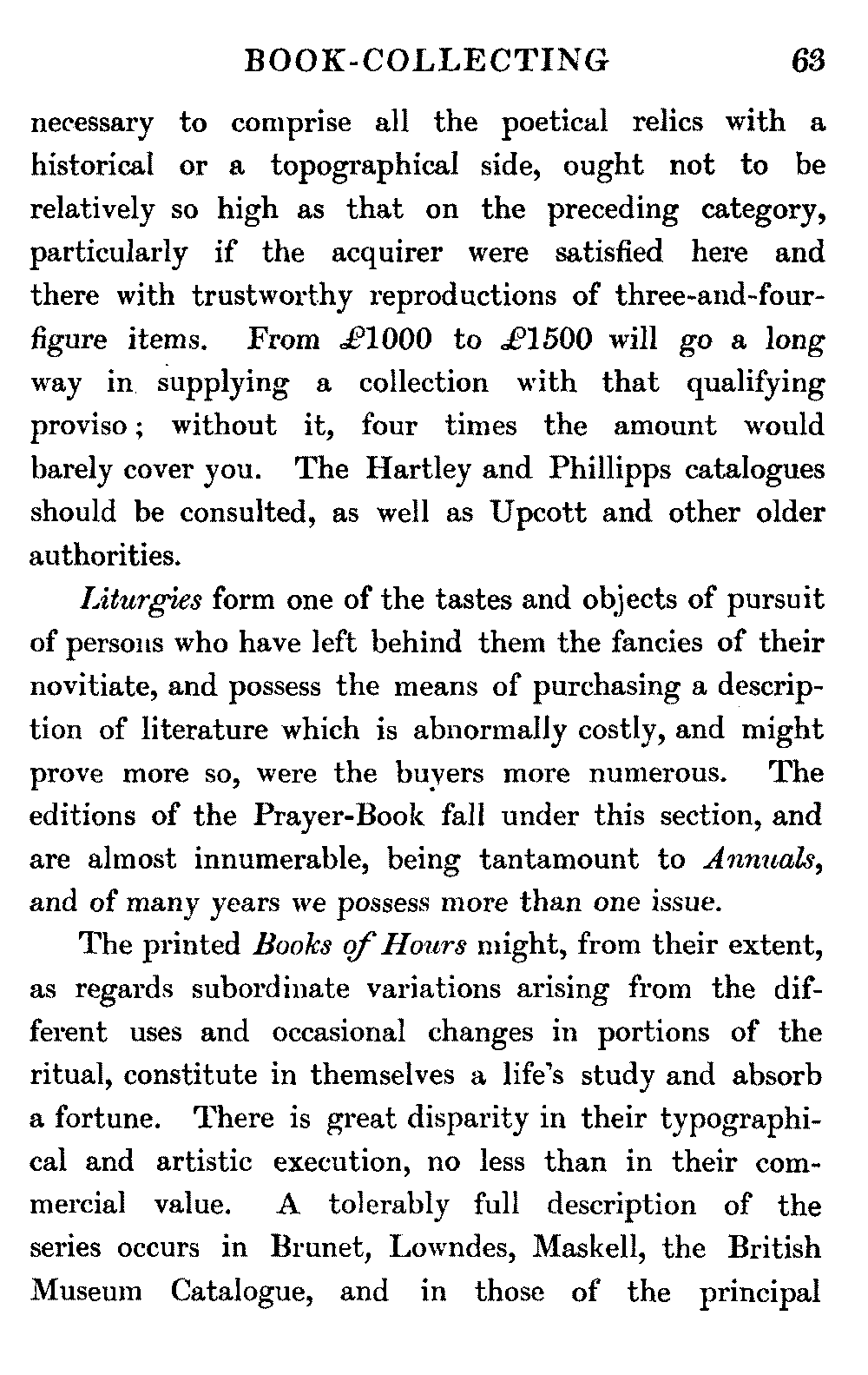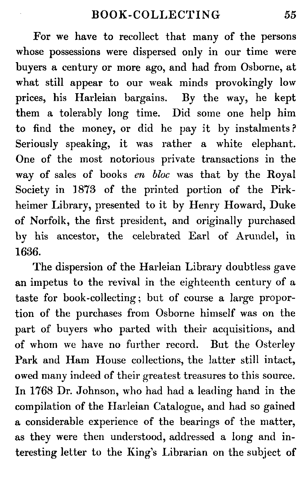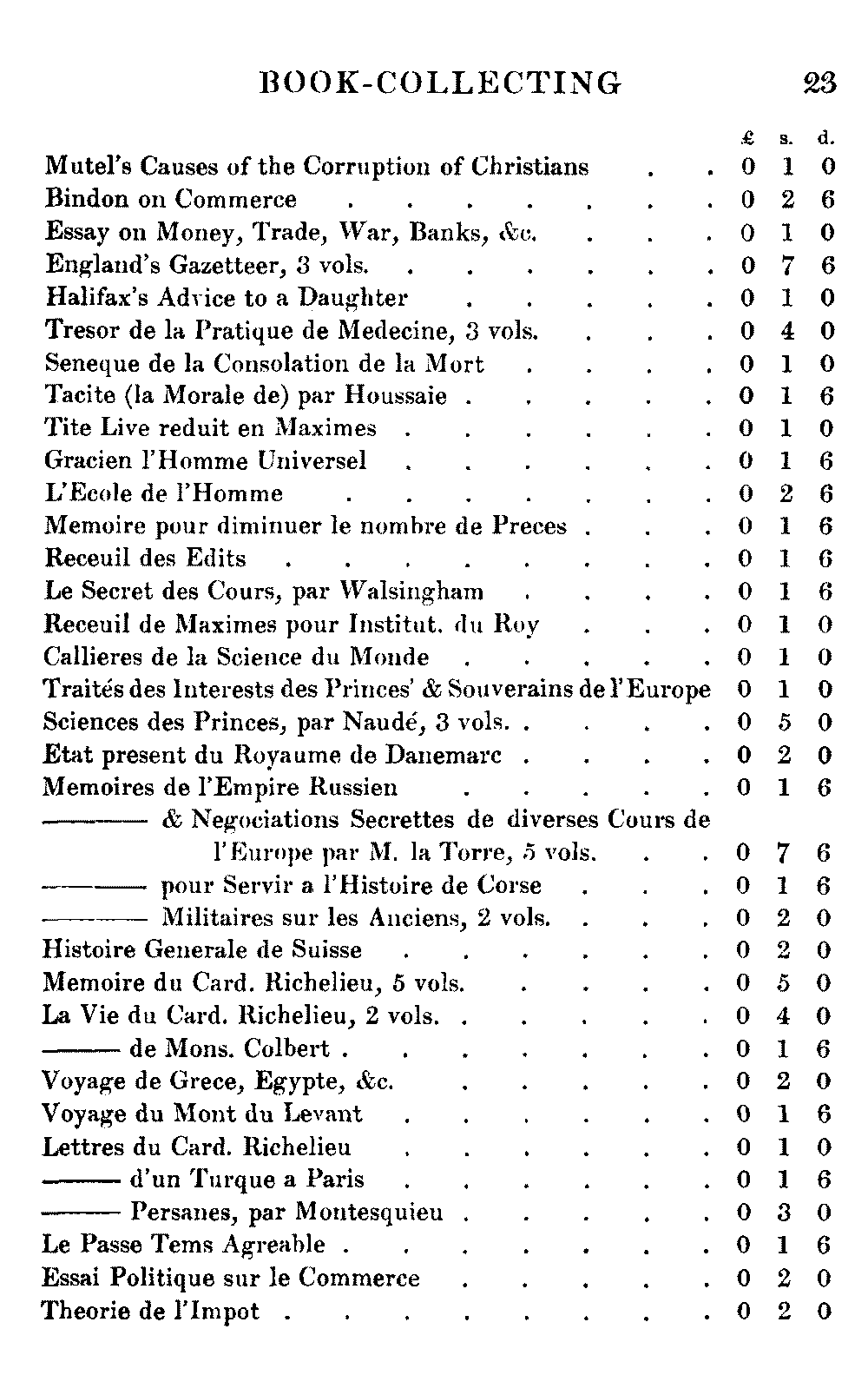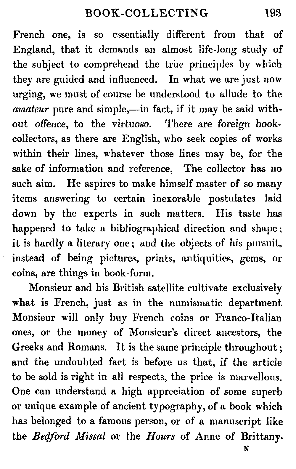 It affords a pleasanter impression of the pursuit when one perceives individuals of all ranks and callings buying themselves personally, either at the book-shop or the saleroom, in the selection of their periodical acquisitions. The marked copies of the older auction catalogues are distinguished by the names of some of our most eminent collectors, but at present gentlemen prefer to give their commissions to their booksellers from want of leisure or other motives.