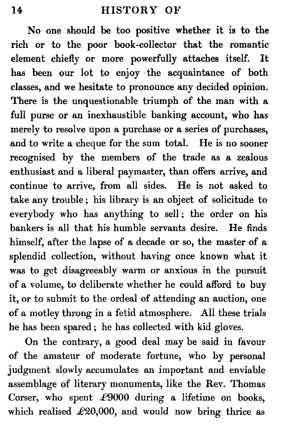 [14] No one should be too positive whether it is to the rich or to the poor book-collector that the romantic element chiefly or more powerfully attaches itself. It has been our lot to enjoy the acquaintance of both classes, and we hesitate to pronounce any decided opinion. There is the unquestionable triumph of the man with a full purse or an inexhaustible banking account, who has merely to resolve upon a purchase or a series of purchases, and to write a cheque for the sum total. He is no sooner recognised by the members of the trade as a zealous enthusiast and a liberal paymaster, than offers arrive, and continue to arrive, from all sides. He is not asked to take any trouble; his library is an object of solicitude to everybody who has anything to sell; the order on his bankers is all that his humble servants desire. He finds himself, after the lapse of a decade or so, the master of a splendid collection, without having once known what it was to get disagreeably warm or anxious in the pursuit of a volume, to deliberate whether he could afford to buy it, or to submit to the ordeal of attending an auction, one of a motley throng in a fetid atmosphere. All these trials he has been spared; he has collected with kid gloves.