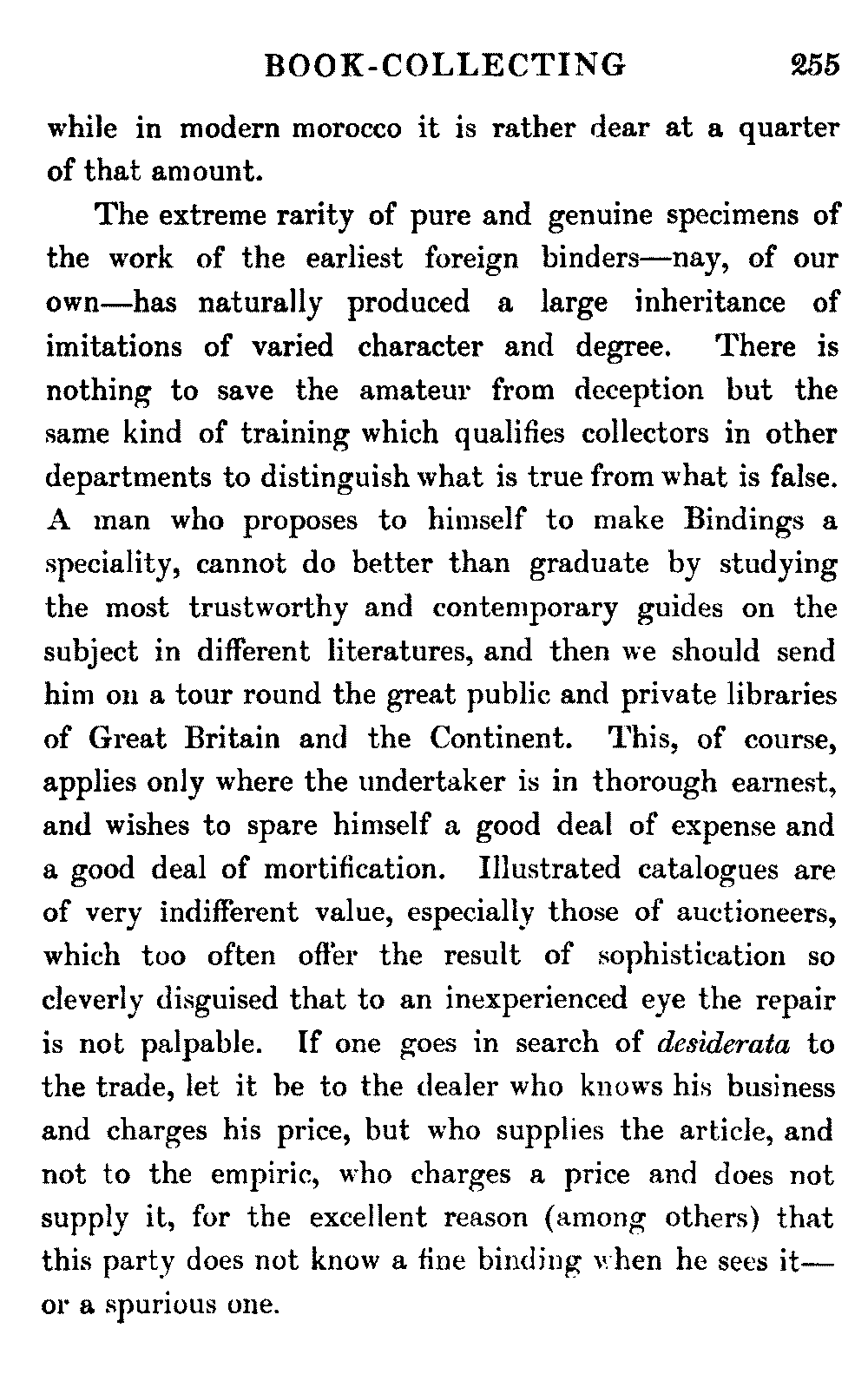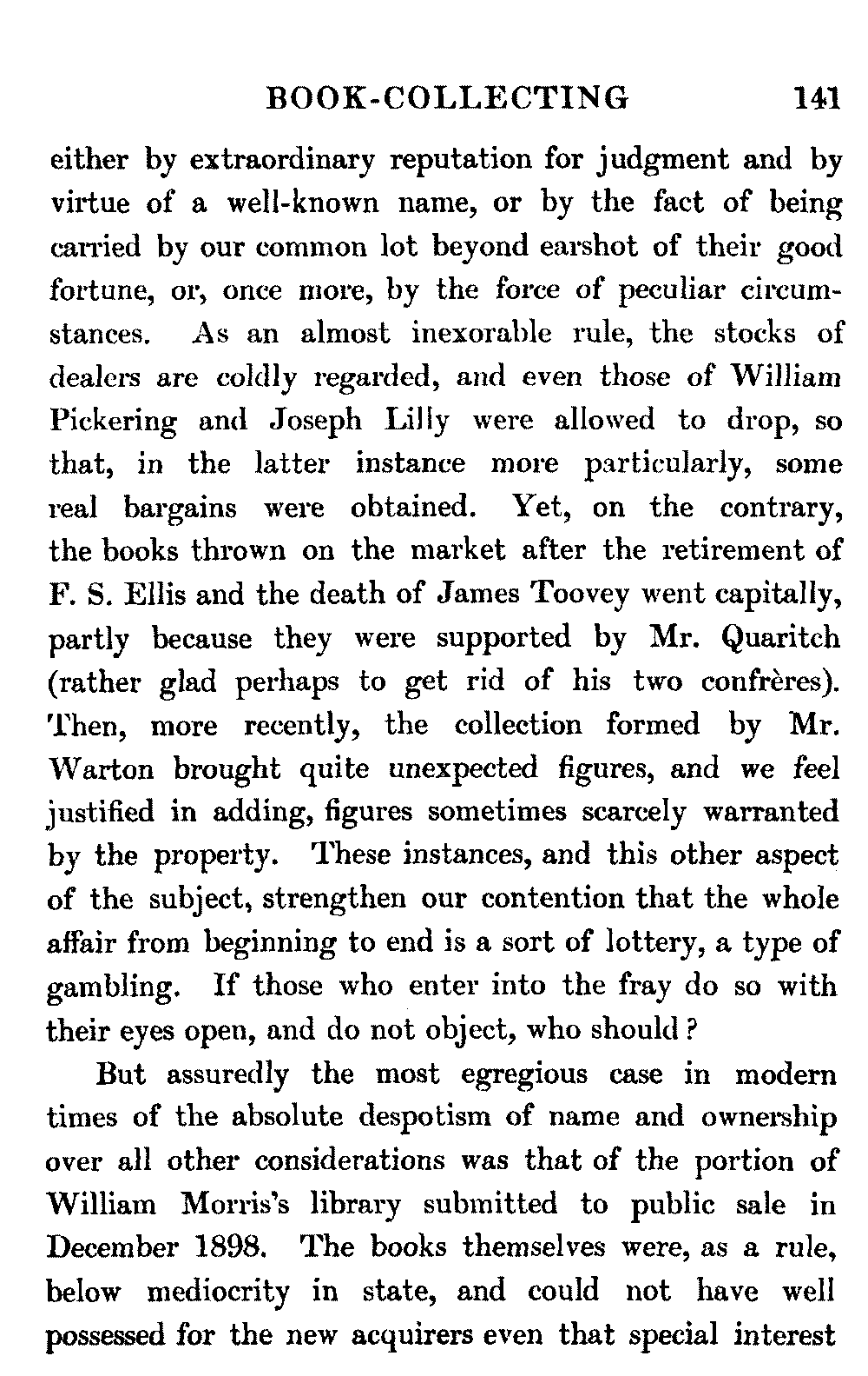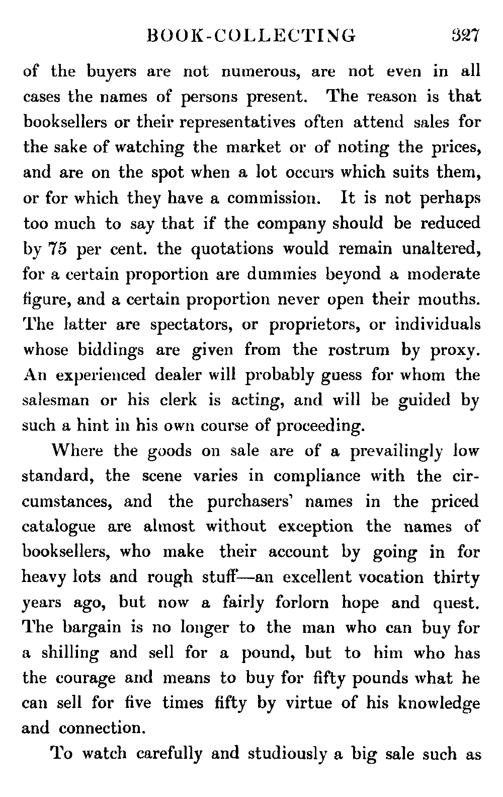 Where the goods on sale are of a prevailingly low standard, the scene varies in compliance with the circumstances, and the purchasers' names in the priced catalogue are almost without exception the names of booksellers, who make their account by going in for heavy lots and rough stuff—an excellent vocation thirty years ago, but now a fairly forlorn hope and quest. The bargain is no longer to the man who can buy for a shilling and sell for a pound, but to him who has the courage and means to buy for fifty pounds what he can sell for five times fifty by virtue of his knowledge and connection.