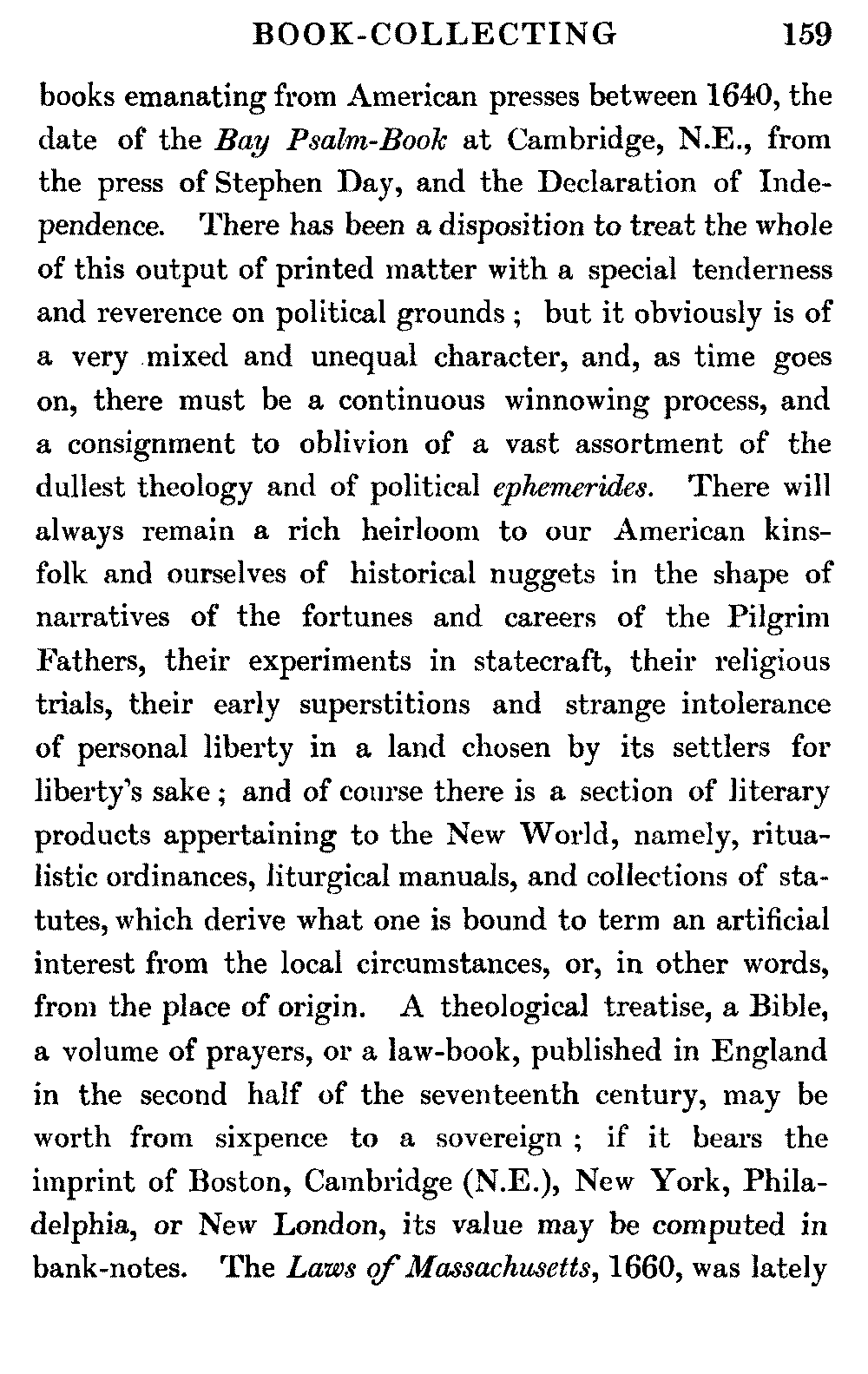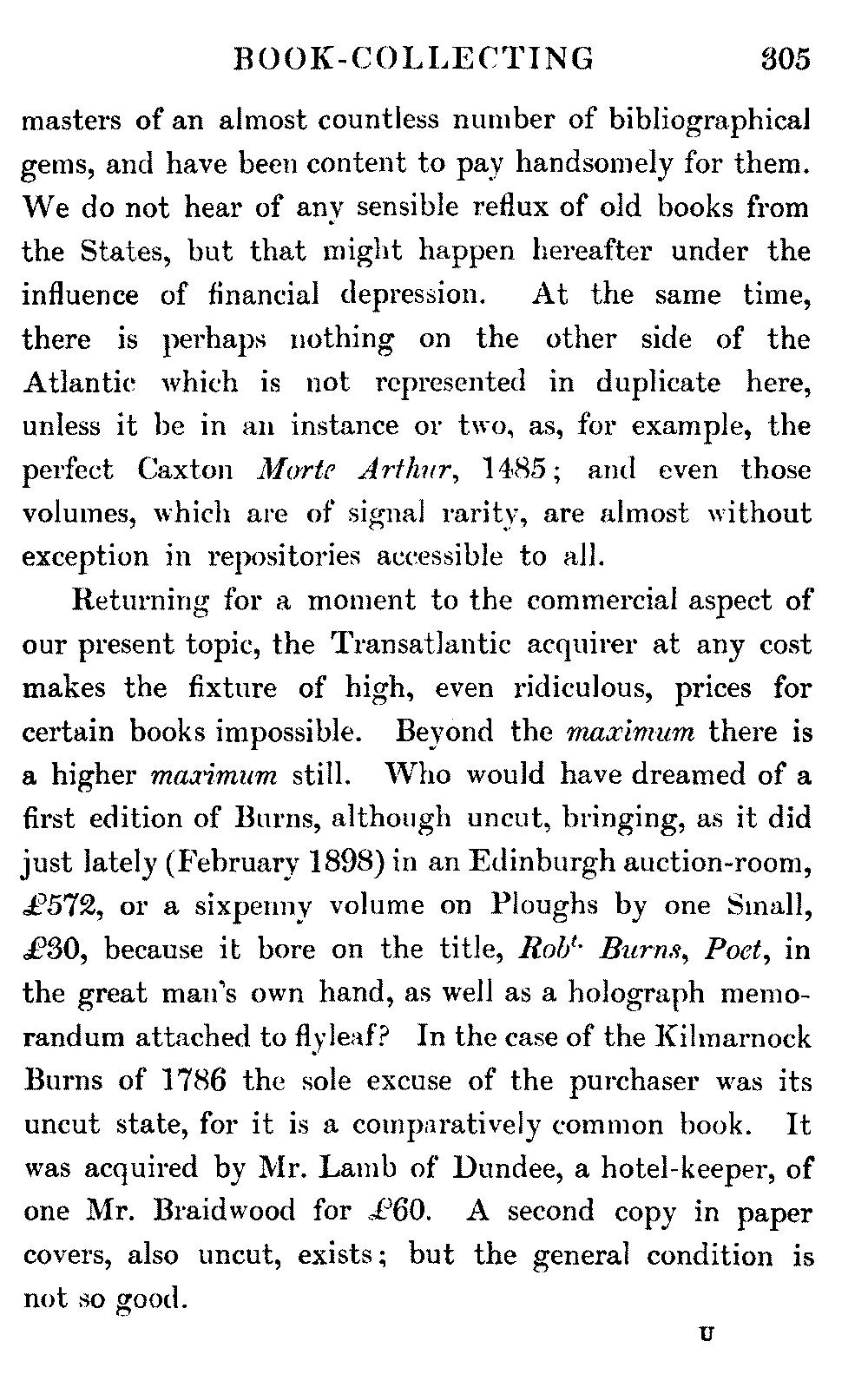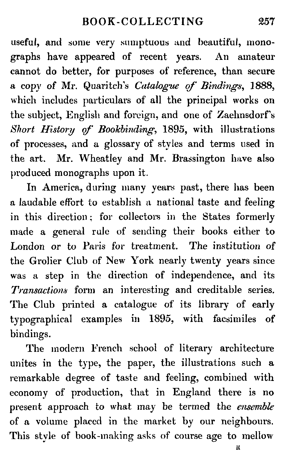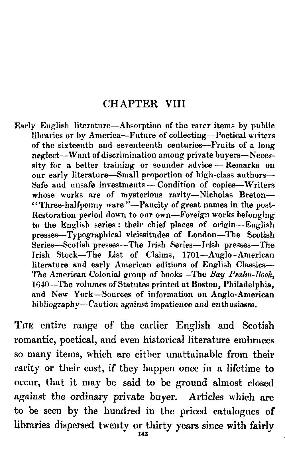 After all said, much as we at home here in Britain need to be better instructed in the art of Book-Collecting, our American cousins are still farther from having completed their education in this way—a few have not commenced it, I fancy. It is not generally realised in England that the American collector of loftier range is a type entirely distinct from the normal book-collector, whose limit is quickly reached. Those who buy books in the United States are by no means all Hoes and Morgans.