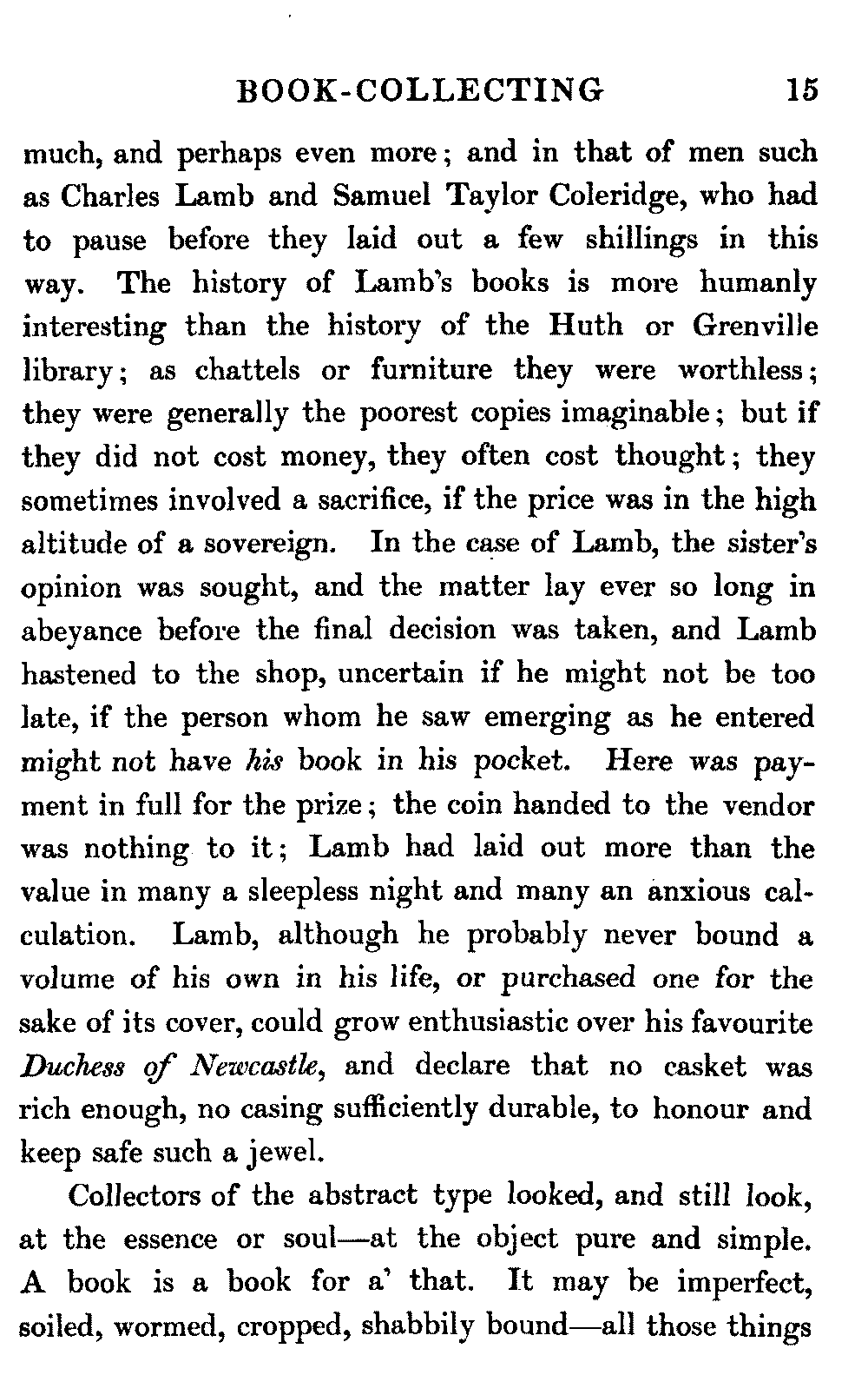 On the contrary, a good deal may be said in favour of the amateur of moderate fortune, who by personal judgment slowly accumulates an important and enviable assemblage of literary monuments, like the Rev. Thomas Corser, who spent £9000 during a lifetime on books, which realised £20,000, and would now bring thrice as[15] much, and perhaps even more; and in that of men such as Charles Lamb and Samuel Taylor Coleridge, who had to pause before they laid out a few shillings in this way. The history of Lamb's books is more humanly interesting than the history of the Huth or Grenville library; as chattels or furniture they were worthless; they were generally the poorest copies imaginable; but if they did not cost money, they often cost thought; they sometimes involved a sacrifice, if the price was in the high altitude of a sovereign. In the case of Lamb, the sister's opinion was sought, and the matter lay ever so long in abeyance before the final decision was taken, and Lamb hastened to the shop, uncertain if he might not be too late, if the person whom he saw emerging as he entered might not have his book in his pocket. Here was payment in full for the prize; the coin handed to the vendor was nothing to it; Lamb had laid out more than the value in many a sleepless night and many an anxious calculation. Lamb, although he probably never bound a volume of his own in his life, or purchased one for the sake of its cover, could grow enthusiastic over his favourite Duchess of Newcastle, and declare that no casket was rich enough, no casing sufficiently durable, to honour and keep safe such a jewel.