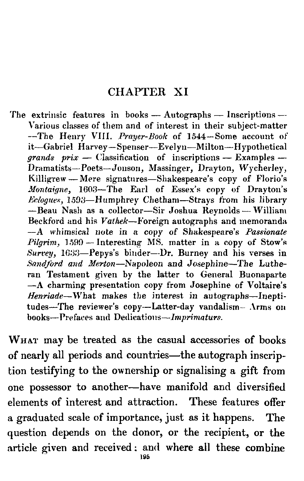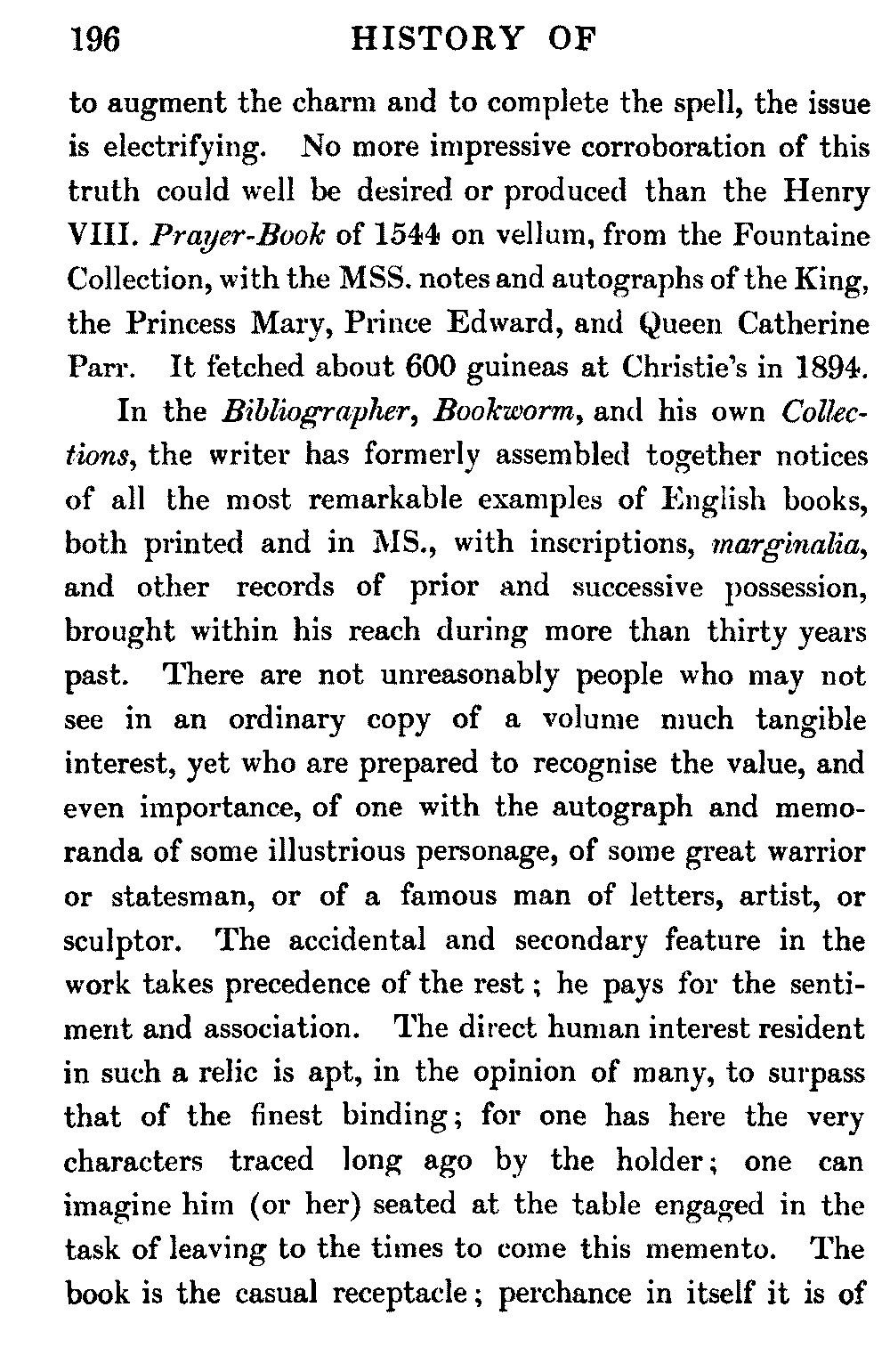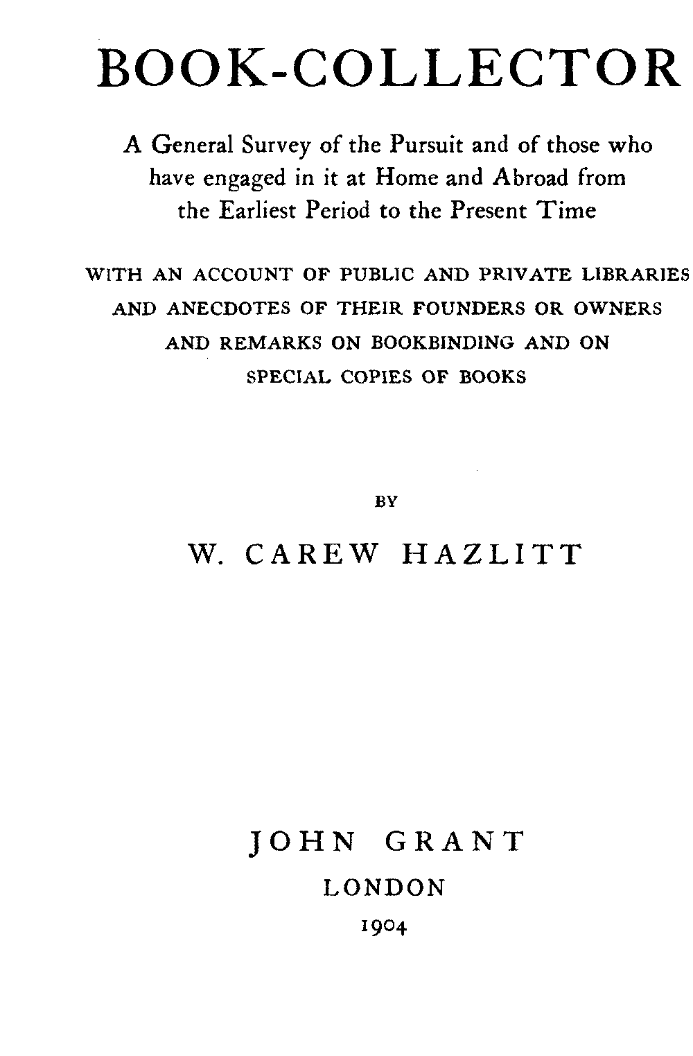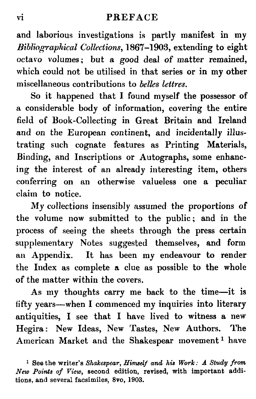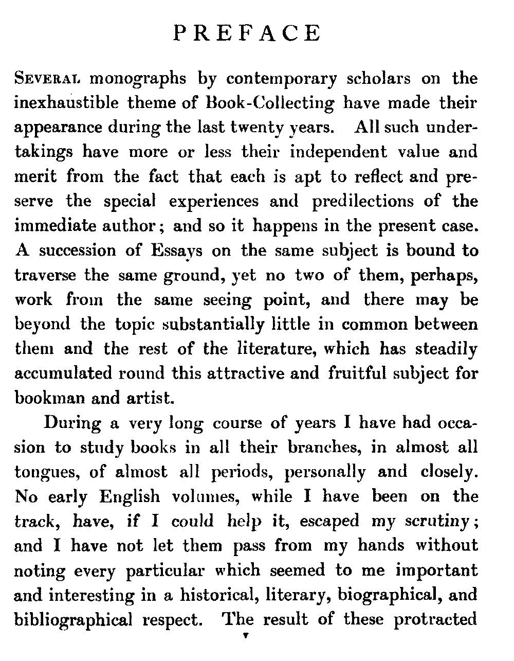 So it happened that I found myself the possessor of a considerable body of information, covering the entire field of Book-Collecting in Great Britain and Ireland and on the European continent, and incidentally illustrating such cognate features as Printing Materials, Binding, and Inscriptions or Autographs, some enhancing the interest of an already interesting item, others conferring on an otherwise valueless one a peculiar claim to notice.