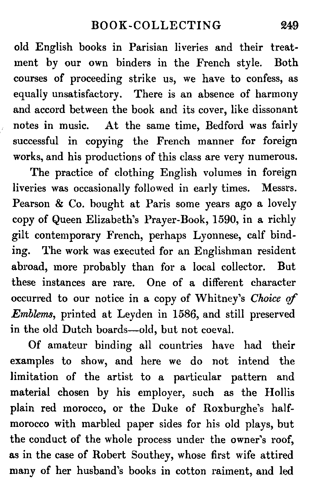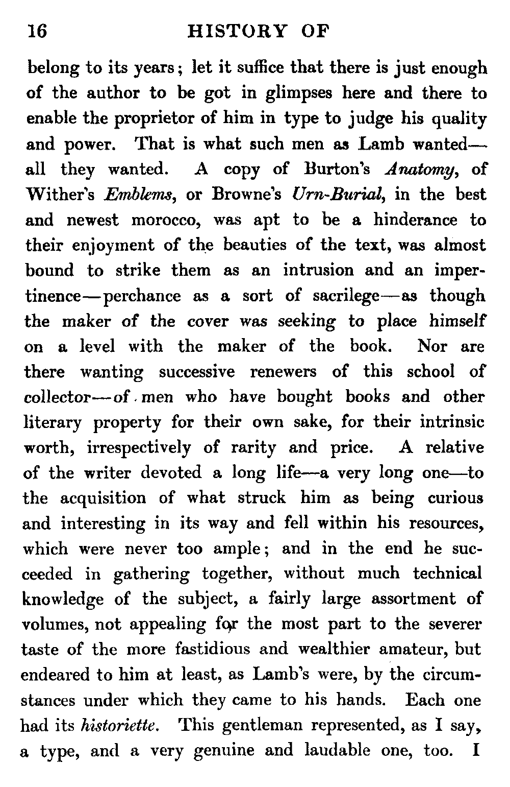 Collectors of the abstract type looked, and still look, at the essence or soul—at the object pure and simple. A book is a book for a' that. It may be imperfect, soiled, wormed, cropped, shabbily bound—all those things[16] belong to its years; let it suffice that there is just enough of the author to be got in glimpses here and there to enable the proprietor of him in type to judge his quality and power. That is what such men as Lamb wanted—all they wanted. A copy of Burton's Anatomy, of Wither's Emblems, or Browne's Urn-Burial, in the best and newest morocco, was apt to be a hinderance to their enjoyment of the beauties of the text, was almost bound to strike them as an intrusion and an impertinence—perchance as a sort of sacrilege—as though the maker of the cover was seeking to place himself on a level with the maker of the book. Nor are there wanting successive renewers of this school of collector—of men who have bought books and other literary property for their own sake, for their intrinsic worth, irrespectively of rarity and price. A relative of the writer devoted a long life—a very long one—to the acquisition of what struck him as being curious and interesting in its way and fell within his resources, which were never too ample; and in the end he succeeded in gathering together, without much technical knowledge of the subject, a fairly large assortment of volumes, not appealing for the most part to the severer taste of the more fastidious and wealthier amateur, but endeared to him at least, as Lamb's were, by the circumstances under which they came to his hands. Each one had its historiette. This gentleman represented, as I say, a type, and a very genuine and laudable one, too. I[17] admired, almost envied him, not in his possession, but in his enjoyment of these treasures; they were to him as the apple of his eye. When I speak of him as a type, I mean that the same phenomenon still exists. In a letter of 1898 from the extreme North of England there is the ensuing passage, which strongly impressed my fancy: "Ever since I had a house of my own—nearly twenty years—I have been a collector of books on a humble scale. . . . Still, by being continually on the look-out for 'bargains,' I have managed to gather between three and four thousand volumes together, chiefly of a poetical nature." Now, to my apprehension, the present aspect of the matter touches a higher or deeper chord than that reached by the owner of the most splendid library in the universe; for all this Heliconian harvest signified personal search and personal sacrifice.