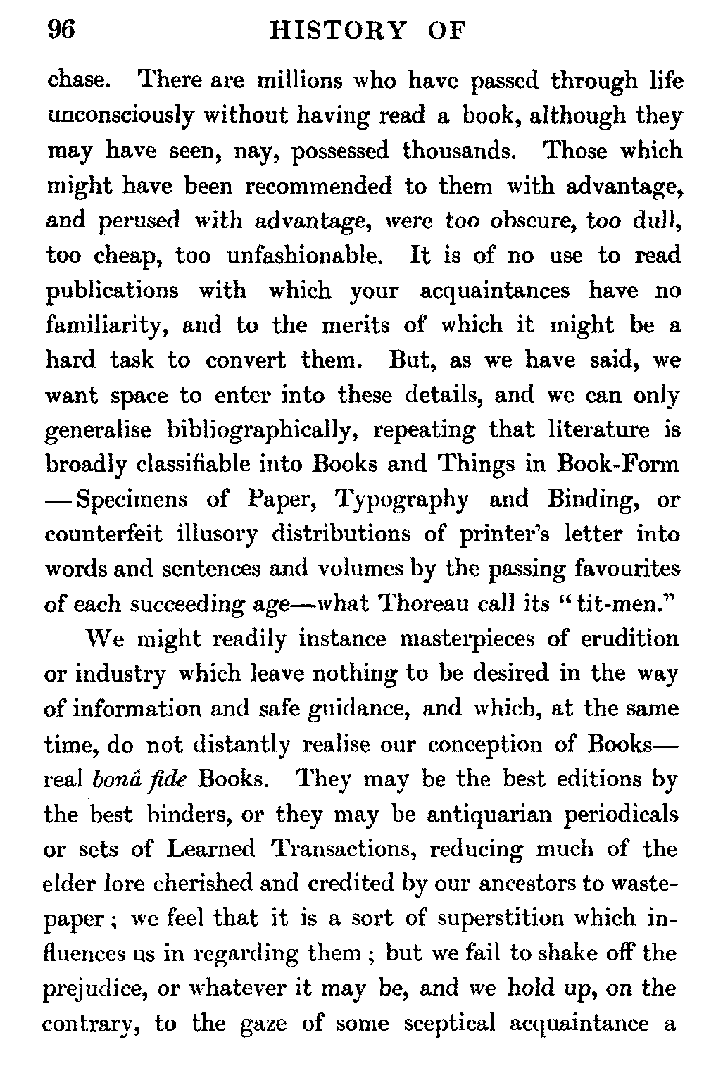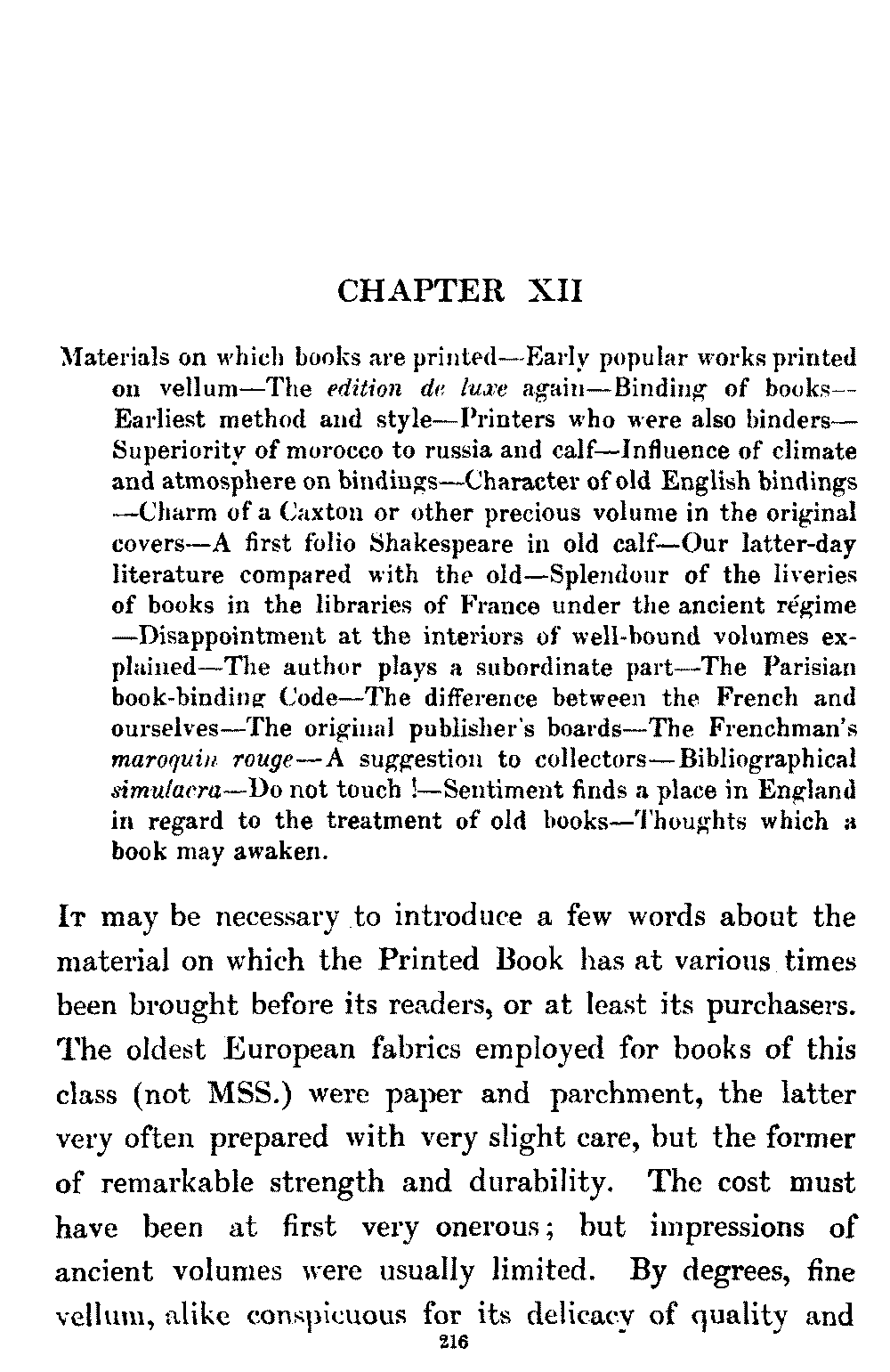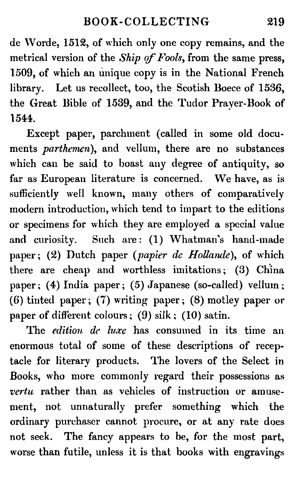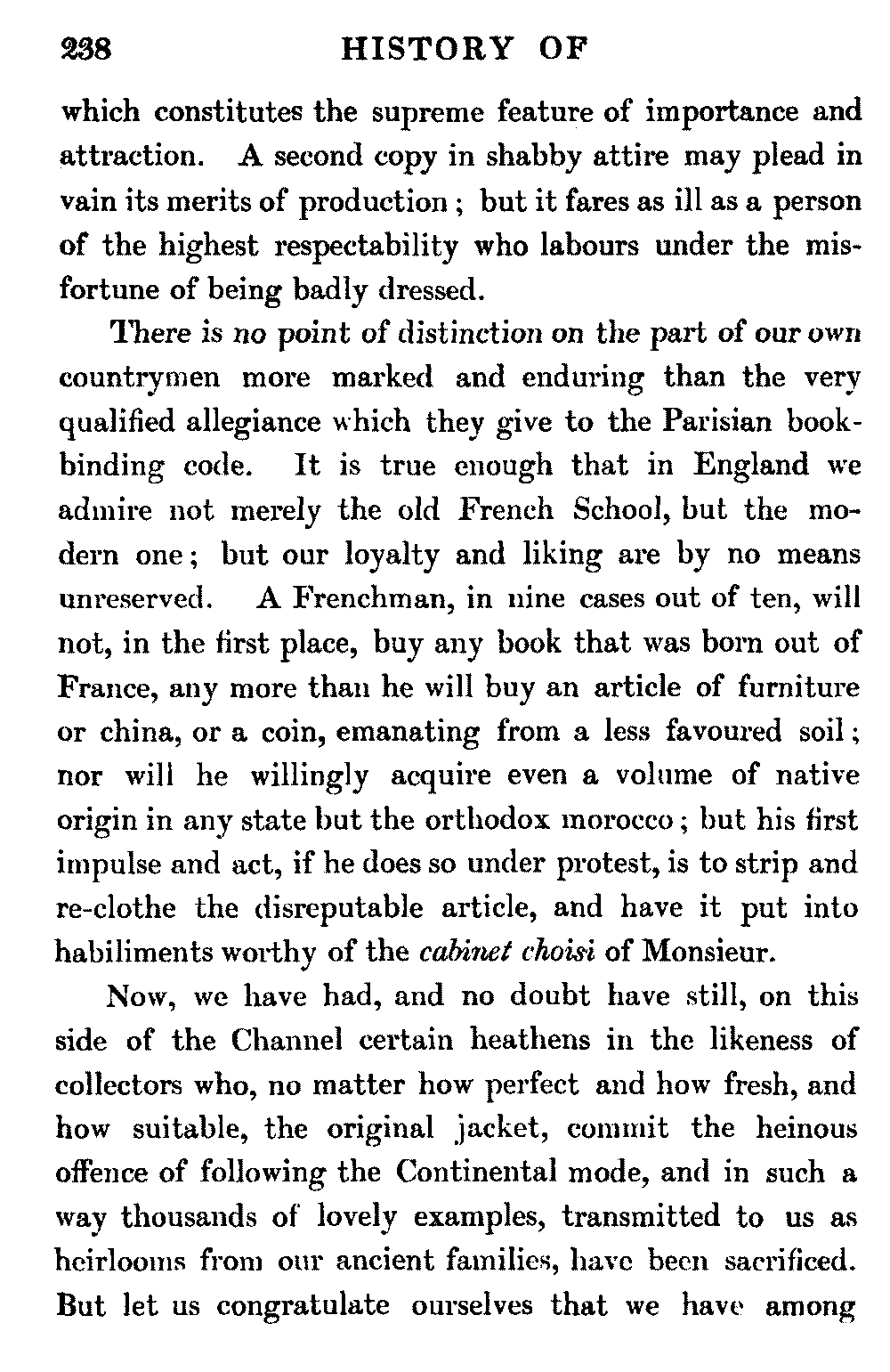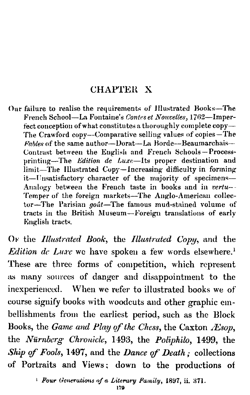 Such an enterprise as we offer, in the face of several which have already appeared under various titles and auspices, may at first sight seem redundant; but perhaps it is not really the case. A book of this class is, as a rule, written by a scholar for scholars; that is all very well, and very charming the result is capable of proving. Or, again, the book is addressed by a bibliographer to bibliographers; and here there may be, with a vast deal that is highly instructive, a tendency to bare[3] technique, which does not commend itself to many outside the professional or special lines. It was thought, under these circumstances, that a new volume, combining readability and a fair proportion of general interest with practical information and advice, was entitled to favourable consideration; and the peculiar training of the present writer during his whole life, at once as a litterateur and a practical bookman, encouraged the idea on his part that it might well be feasible for him to carry the plan into execution, and produce a view of a permanently interesting and important subject in all its branches and aspects, appealing not only to actual book-collectors, but to those who may naturally desire to learn to what the science and pursuit amount.