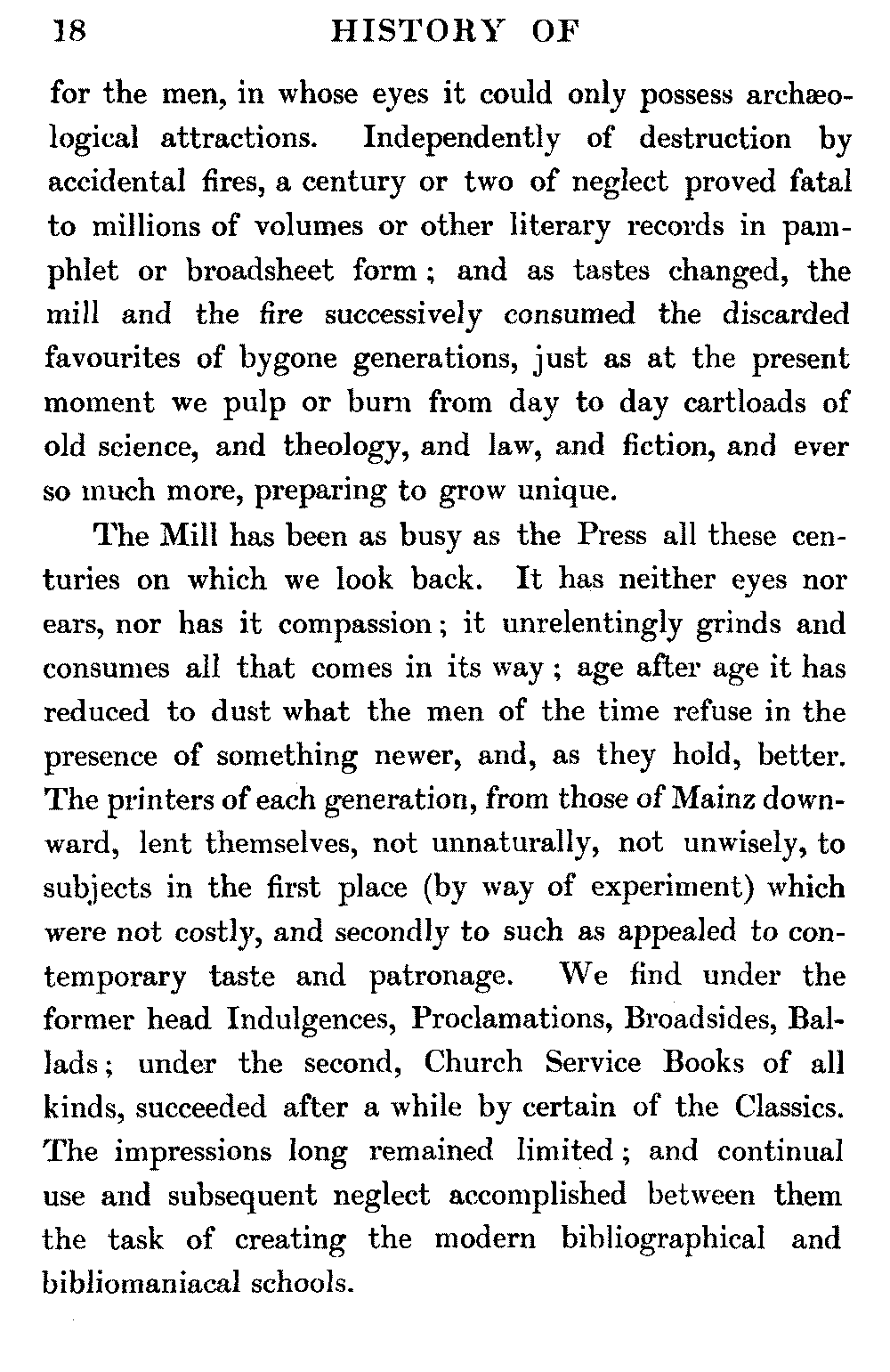 The Mill has been as busy as the Press all these centuries on which we look back. It has neither eyes nor ears, nor has it compassion; it unrelentingly grinds and consumes all that comes in its way; age after age it has reduced to dust what the men of the time refuse in the presence of something newer, and, as they hold, better. The printers of each generation, from those of Mainz downward, lent themselves, not unnaturally, not unwisely, to subjects in the first place (by way of experiment) which were not costly, and secondly to such as appealed to contemporary taste and patronage. We find under the former head Indulgences, Proclamations, Broadsides, Ballads; under the second, Church Service Books of all kinds, succeeded after a while by certain of the Classics. The impressions long remained limited; and continual use and subsequent neglect accomplished between them the task of creating the modern bibliographical and bibliomaniacal schools.