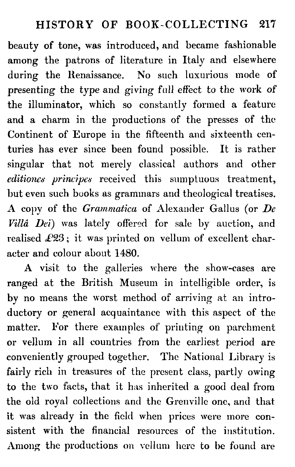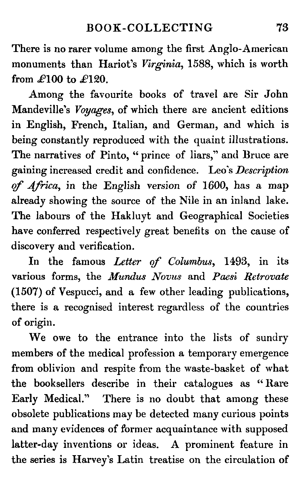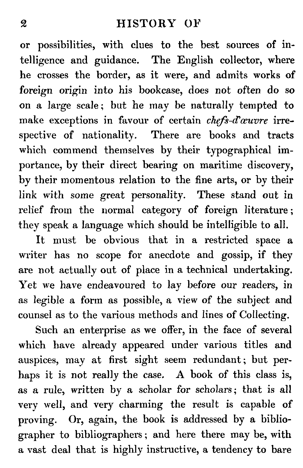 A Manual for the more immediate and especial use of English-speaking inquirers is bound to limit itself, in the first place, mainly to the literary products of the three kingdoms and the colonies; and, secondly, to a broad and general indication of the various paths which it is open to any one to pursue according to his tastes[2] or possibilities, with clues to the best sources of intelligence and guidance. The English collector, where he crosses the border, as it were, and admits works of foreign origin into his bookcase, does not often do so on a large scale; but he may be naturally tempted to make exceptions in favour of certain chefs-d'œuvre irrespective of nationality. There are books and tracts which commend themselves by their typographical importance, by their direct bearing on maritime discovery, by their momentous relation to the fine arts, or by their link with some great personality. These stand out in relief from the normal category of foreign literature; they speak a language which should be intelligible to all.