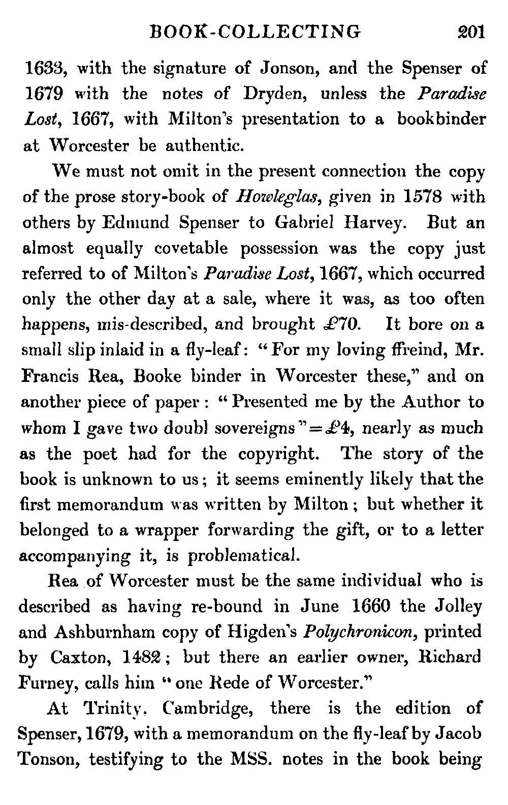 P. 200. Special Copies.—To the list given may be added the extraordinary volume of tracts formerly in the possession of Edmund Spenser and Gabriel Harvey, a MS. note in which throws an entirely new light on the earlier life of Spenser, as first pointed out by me after my purchase of the book at an auction, where its importance was overlooked.