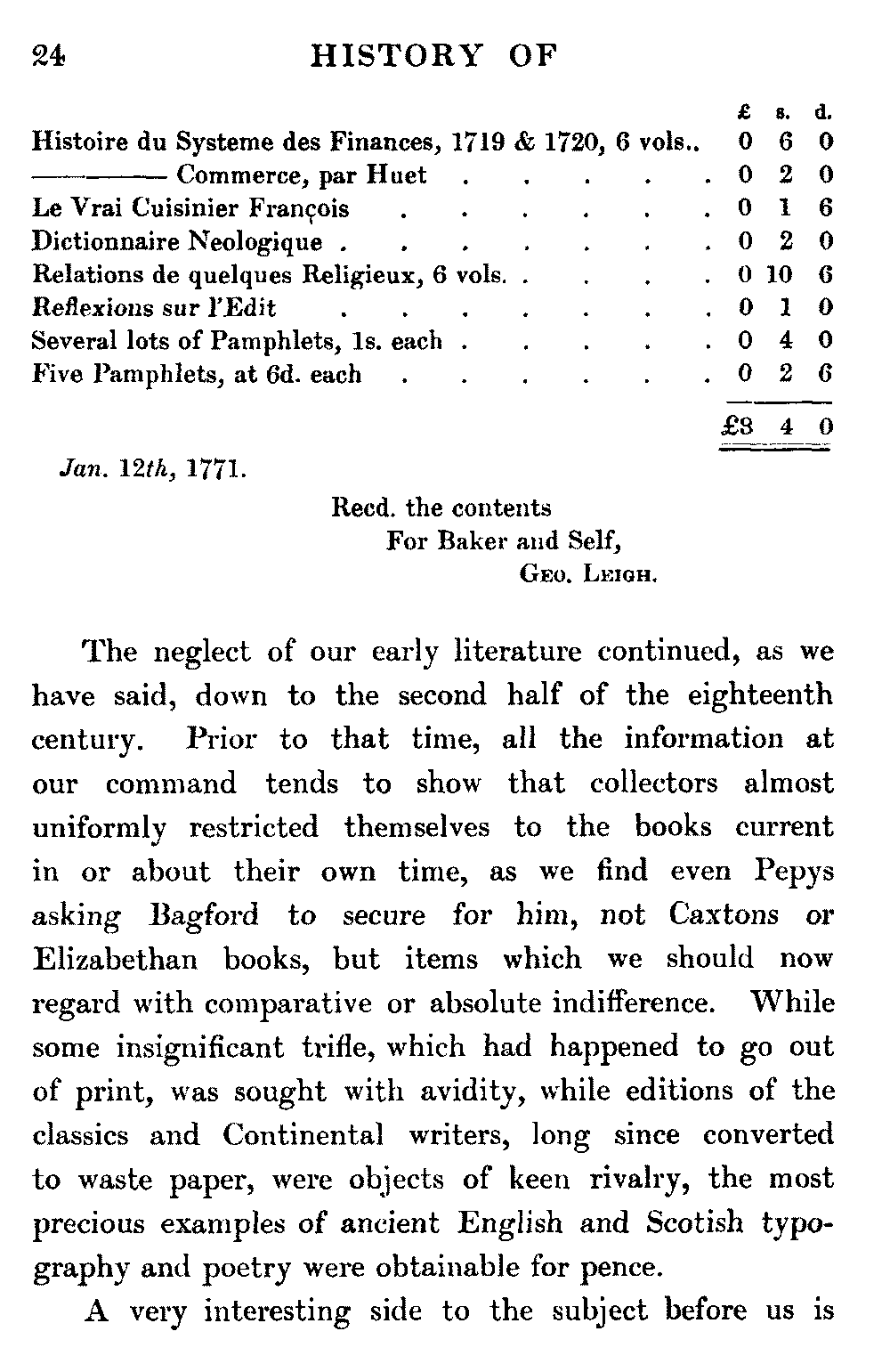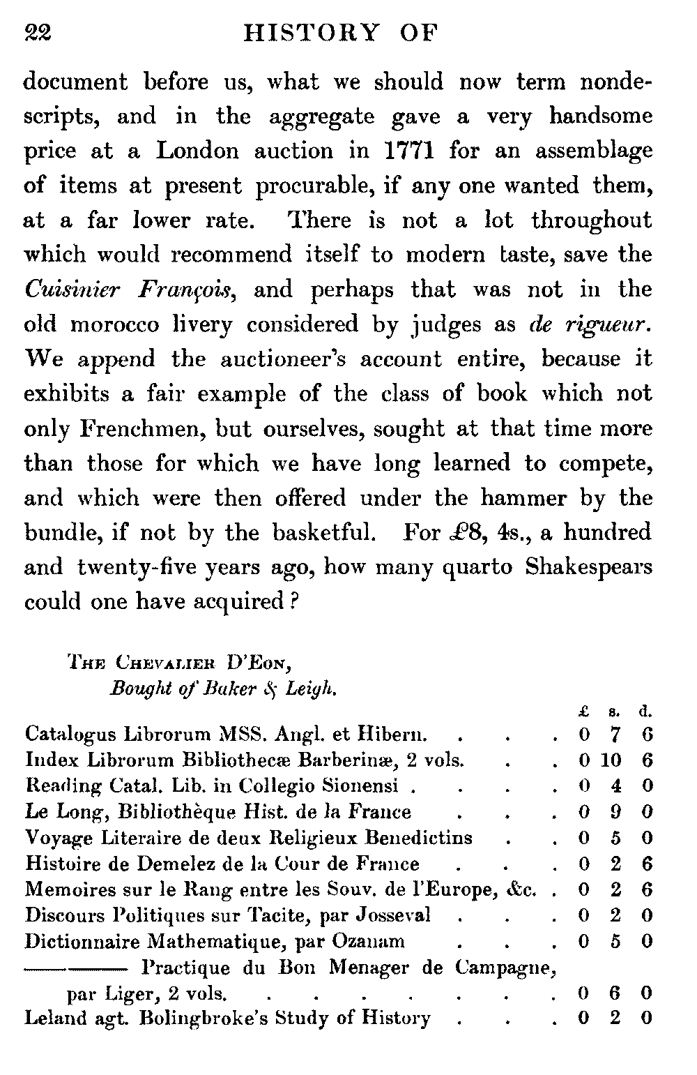 We do not know that the celebrated Chevalier D'Eon was singular in his views as a collector in the last century. He bought in chief measure, if we may judge from a[22] document before us, what we should now term nondescripts, and in the aggregate gave a very handsome price at a London auction in 1771 for an assemblage of items at present procurable, if any one wanted them, at a far lower rate. There is not a lot throughout which would recommend itself to modern taste, save the Cuisinier François, and perhaps that was not in the old morocco livery considered by judges as de rigueur. We append the auctioneer's account entire, because it exhibits a fair example of the class of book which not only Frenchmen, but ourselves, sought at that time more than those for which we have long learned to compete, and which were then offered under the hammer by the bundle, if not by the basketful. For £8, 4s., a hundred and twenty-five years ago, how many quarto Shakespears could one have acquired?