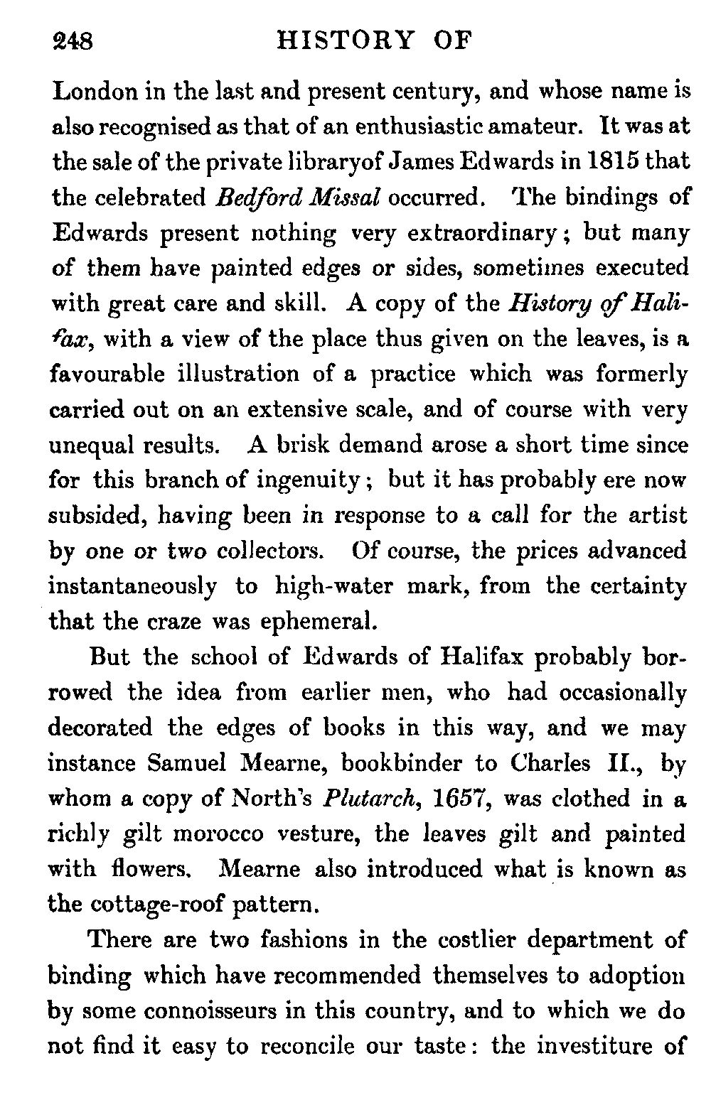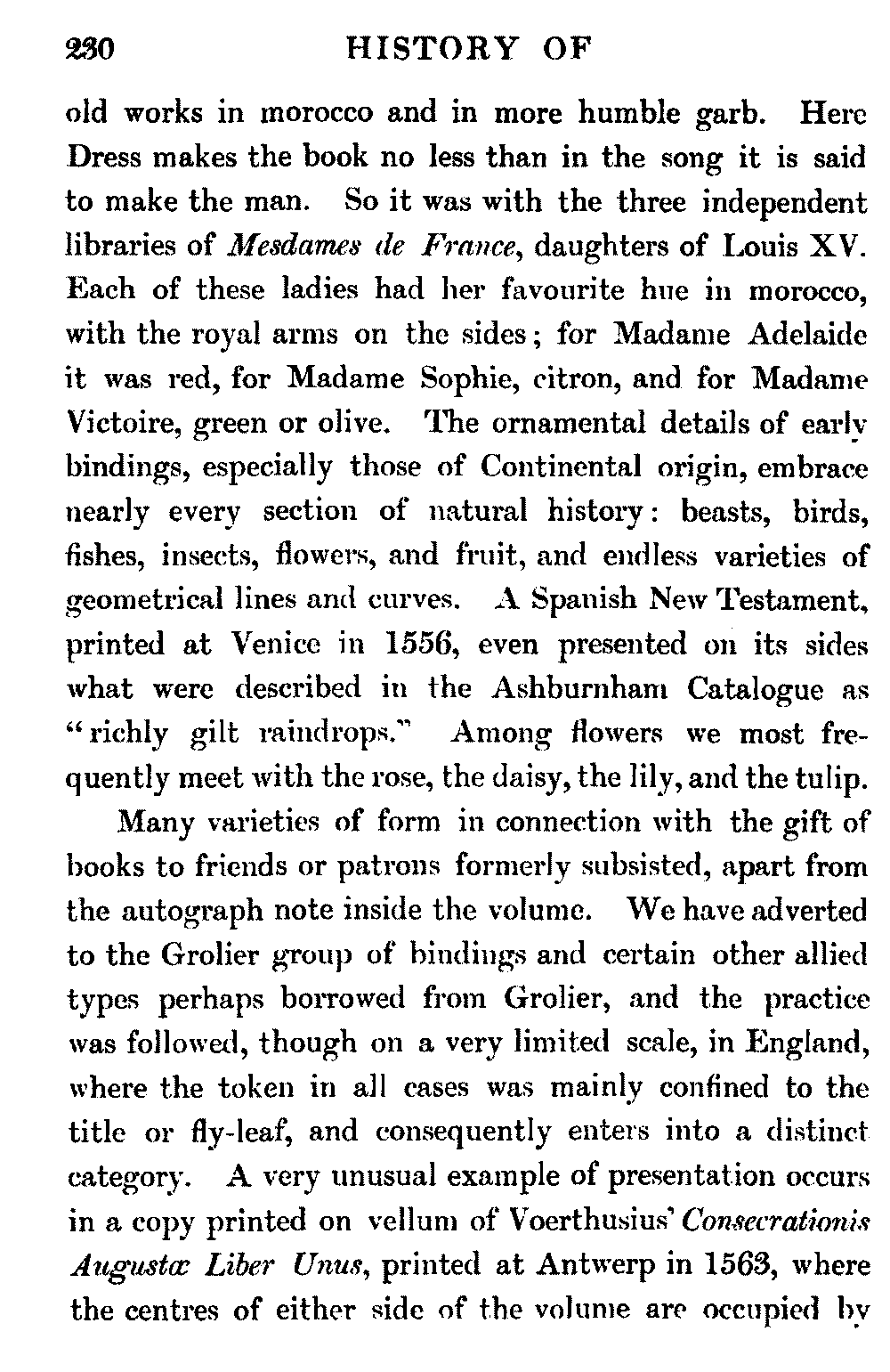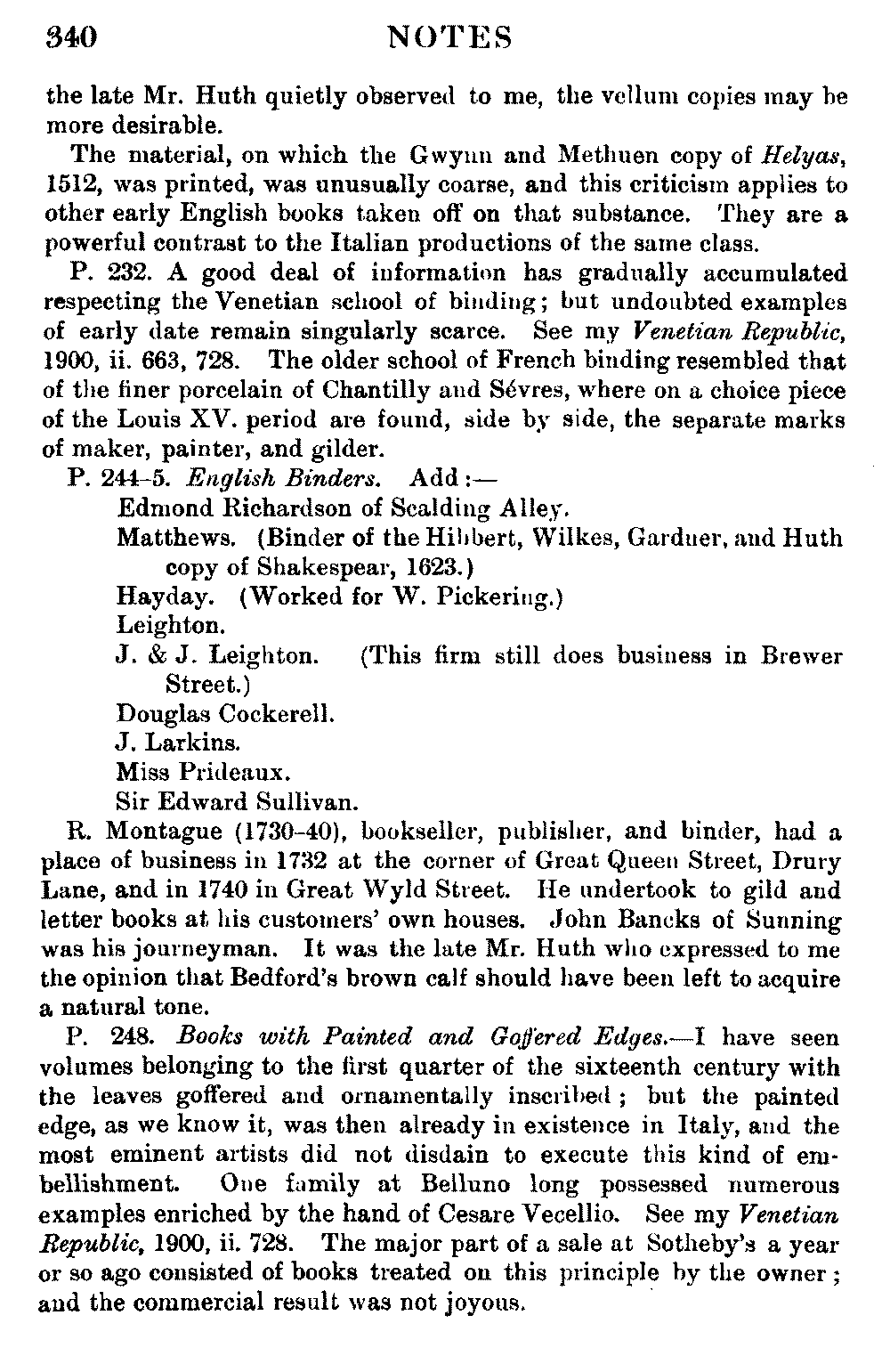 P. 248. Books with Painted and Goffered Edges.—I have seen volumes belonging to the first quarter of the sixteenth century with the leaves goffered and ornamentally inscribed; but the painted edge, as we know it, was then already in existence in Italy, and the most eminent artists did not disdain to execute this kind of embellishment. One family at Belluno long possessed numerous examples enriched by the hand of Cesare Vecellio. See my Venetian Republic, 1900, ii. 728. The major part of a sale at Sotheby's a year or so ago consisted of books treated on this principle by the owner; and the commercial result was not joyous.