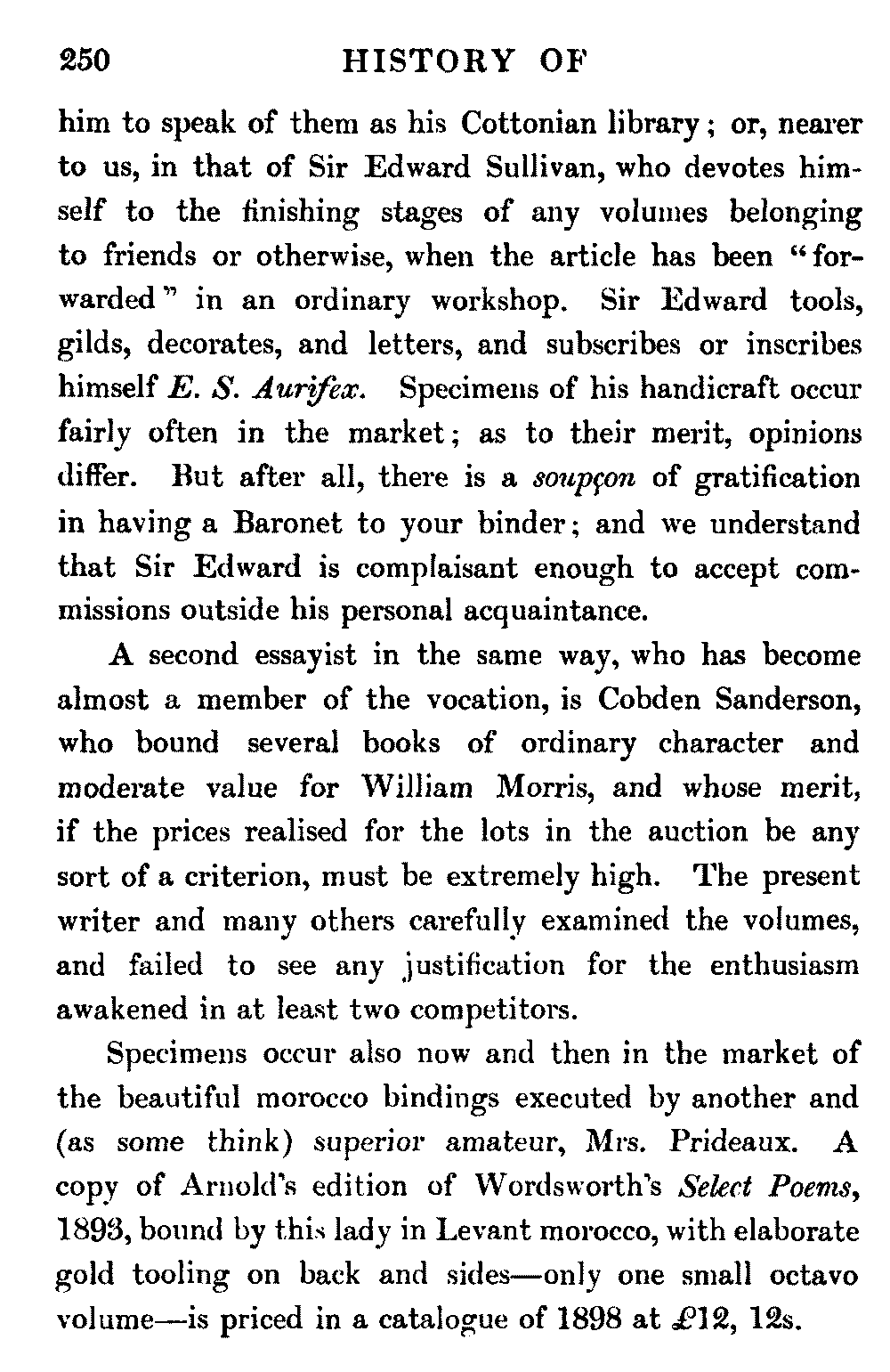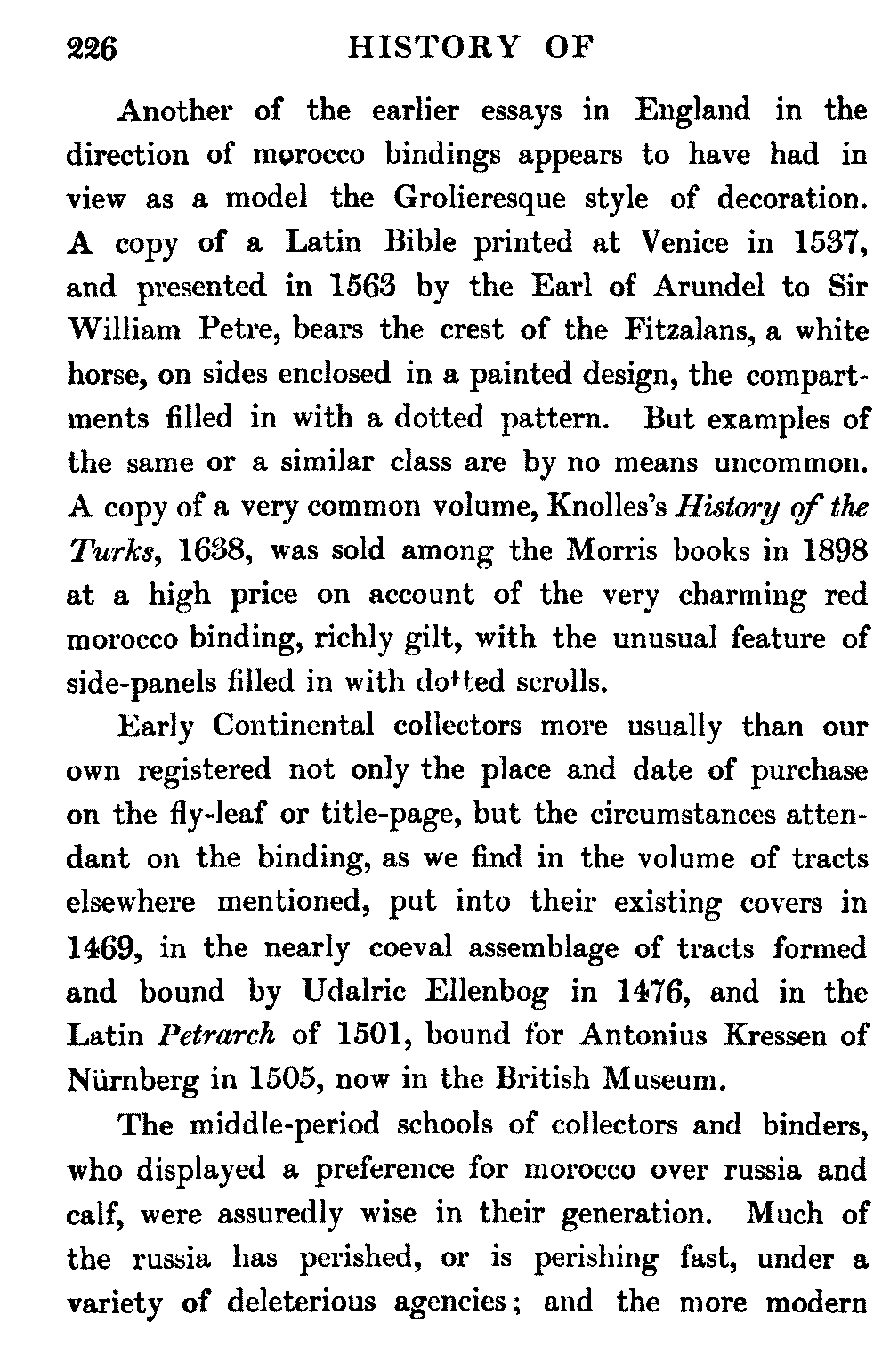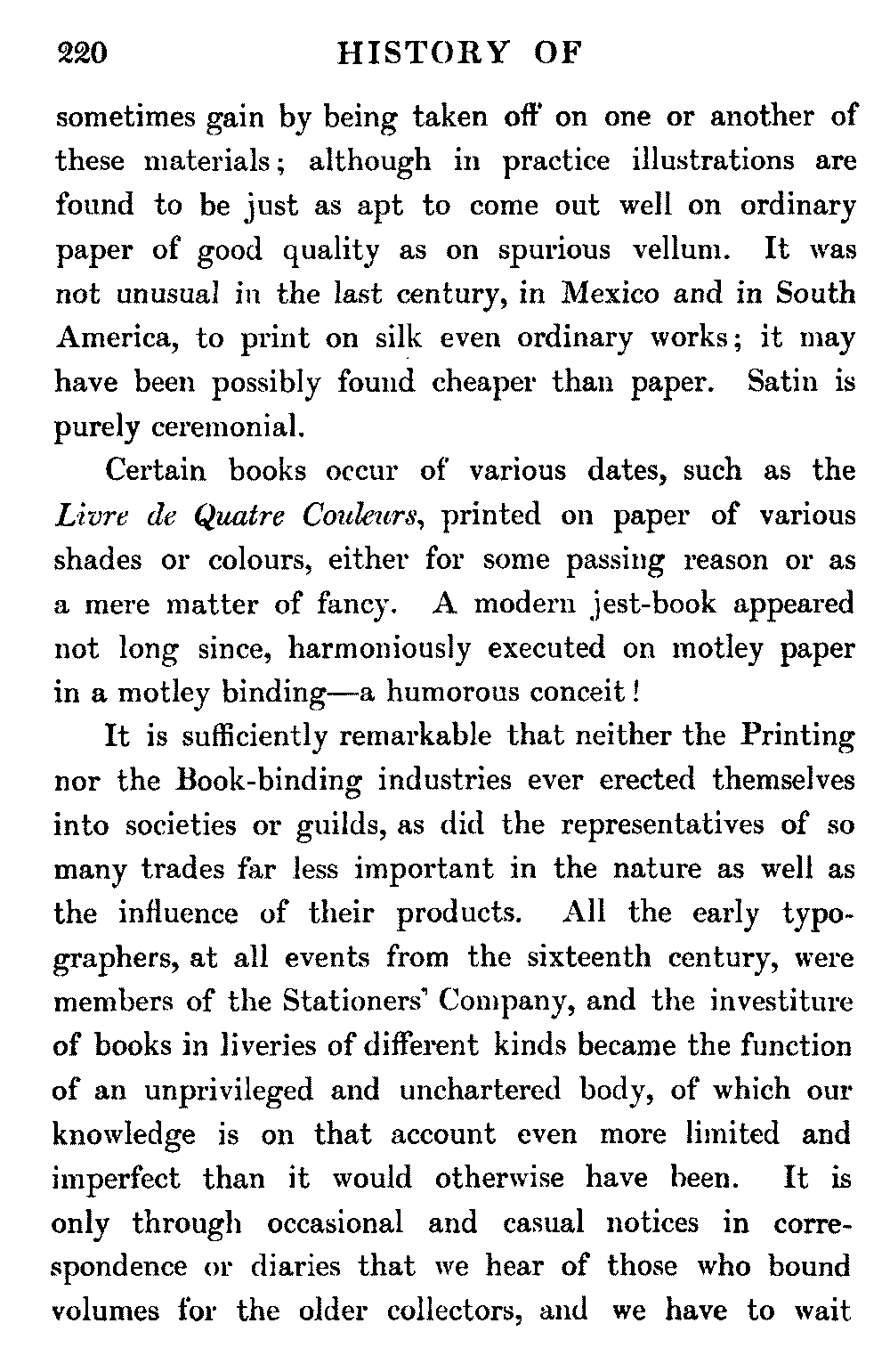P. 248. Books with Painted and Goffered Edges.—I have seen volumes belonging to the first quarter of the sixteenth century with the leaves goffered and ornamentally inscribed; but the painted edge, as we know it, was then already in existence in Italy, and the most eminent artists did not disdain to execute this kind of embellishment. One family at Belluno long possessed numerous examples enriched by the hand of Cesare Vecellio. See my Venetian Republic, 1900, ii. 728. The major part of a sale at Sotheby's a year or so ago consisted of books treated on this principle by the owner; and the commercial result was not joyous.
