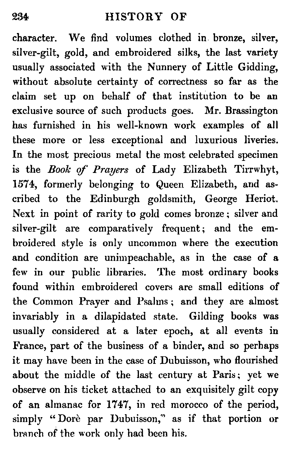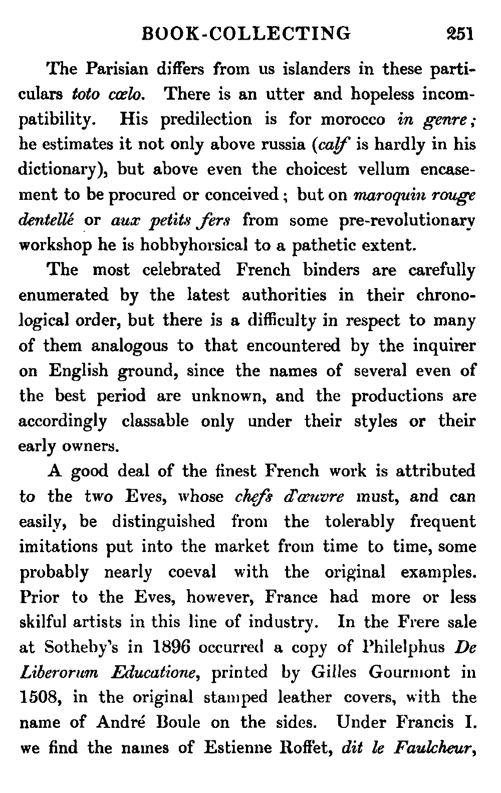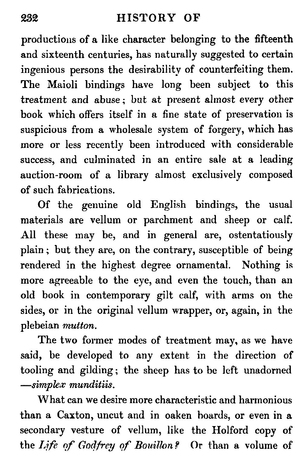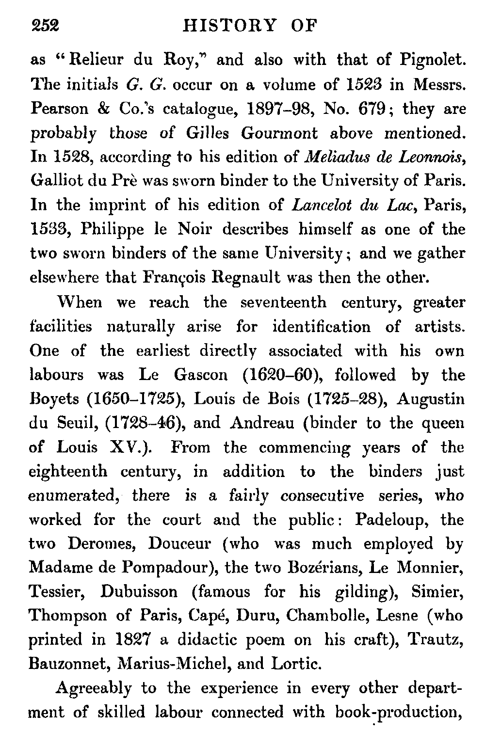 P. 232. A good deal of information has gradually accumulated respecting the Venetian school of binding; but undoubted examples of early date remain singularly scarce. See my Venetian Republic, 1900, ii. 663, 728. The older school of French binding resembled that of the finer porcelain of Chantilly and Sèvres, where on a choice piece of the Louis XV. period are found, side by side, the separate marks of maker, painter, and gilder.