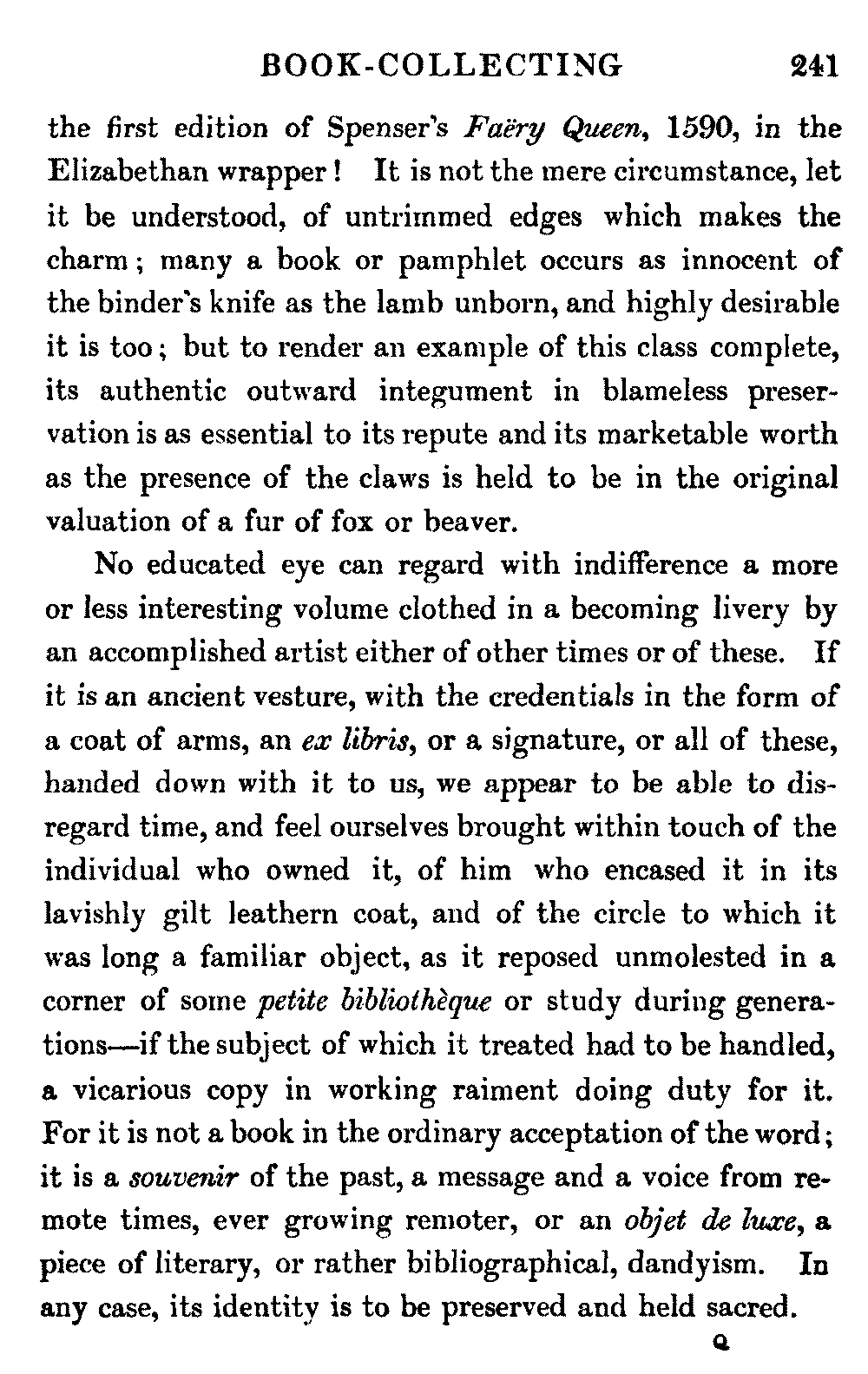 Several monographs by contemporary scholars on the inexhaustible theme of Book-Collecting have made their appearance during the last twenty years. All such undertakings have more or less their independent value and merit from the fact that each is apt to reflect and preserve the special experiences and predilections of the immediate author; and so it happens in the present case. A succession of Essays on the same subject is bound to traverse the same ground, yet no two of them, perhaps, work from the same seeing point, and there may be beyond the topic substantially little in common between them and the rest of the literature, which has steadily accumulated round this attractive and fruitful subject for bookman and artist.