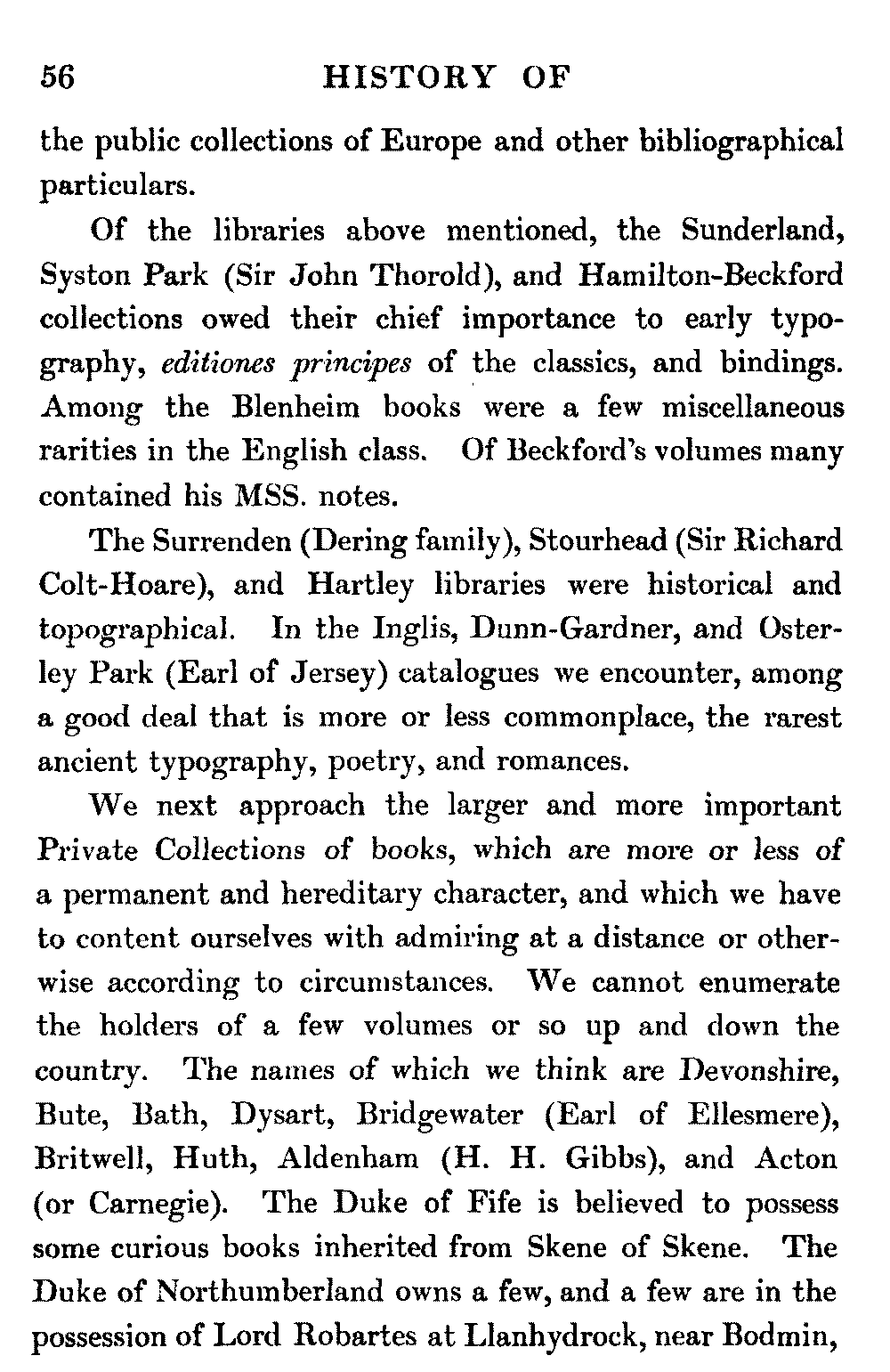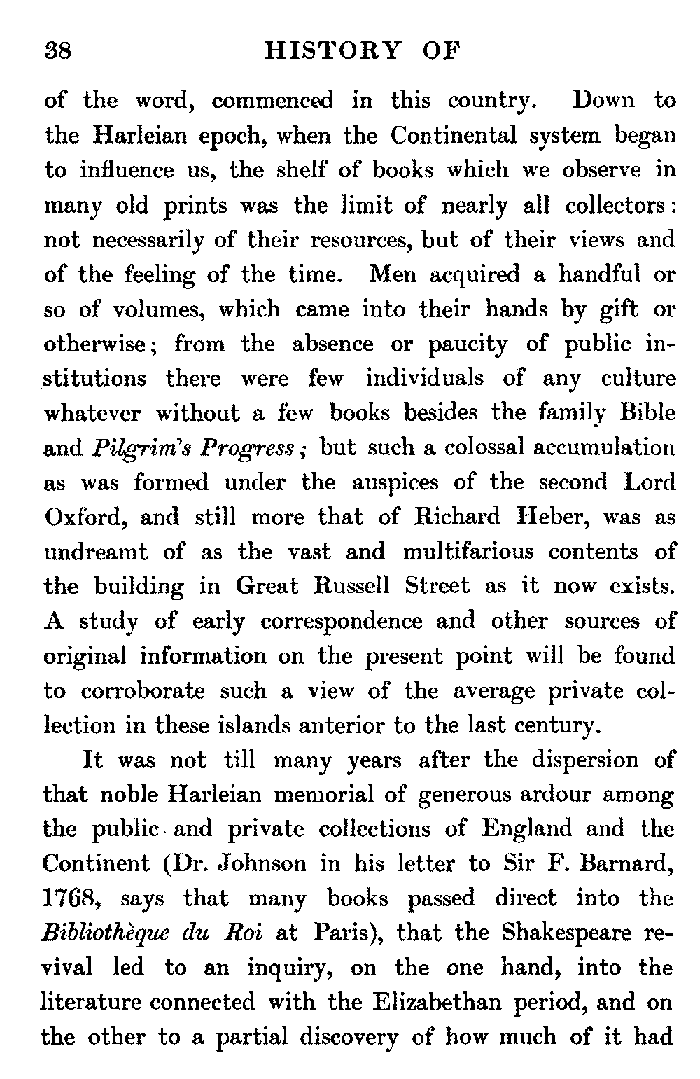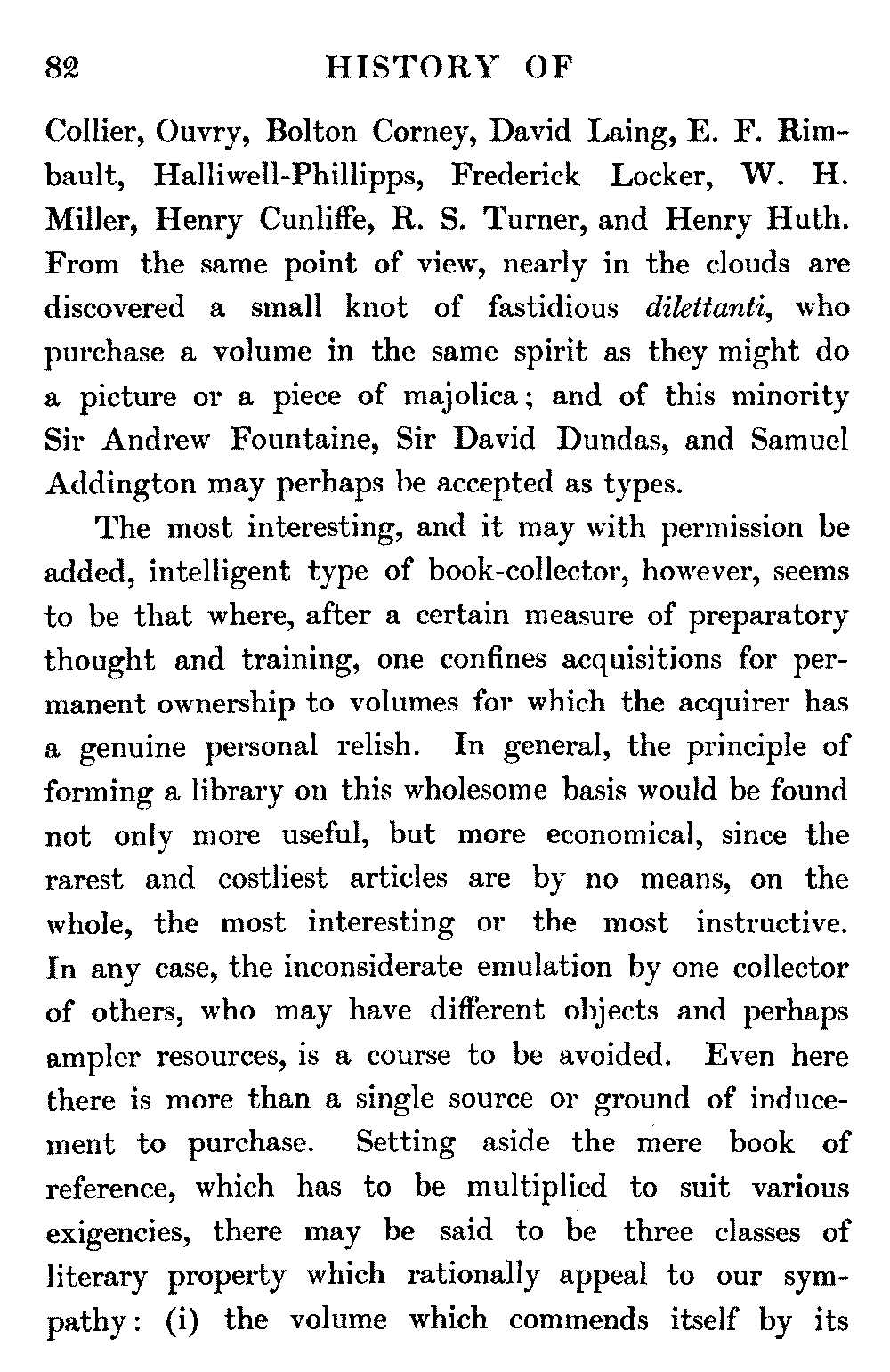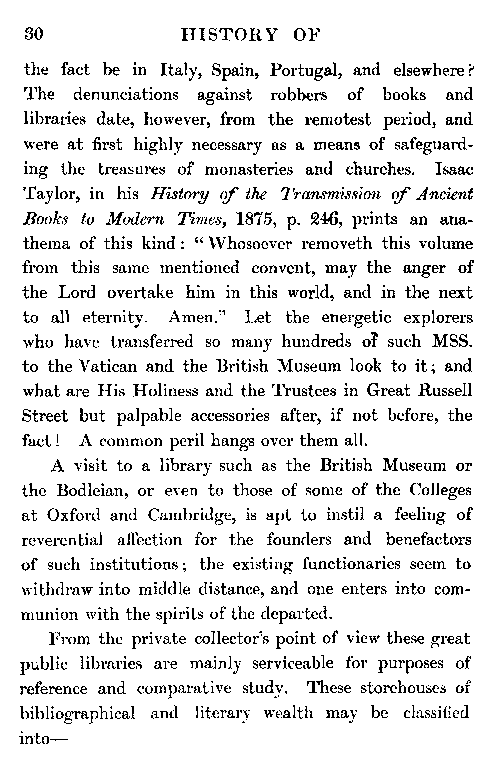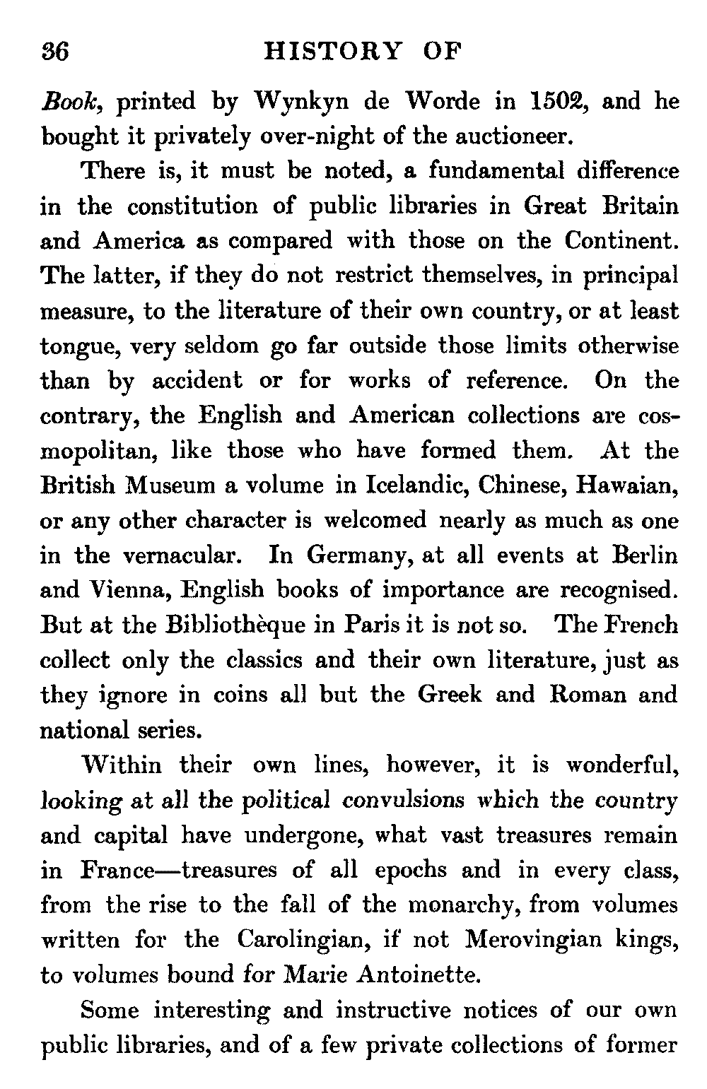 P. 37. Private Libraries.—In the case of private collections, we have to distinguish between those of an ancestral character, insensibly accumulated from generation to generation without any fixed or[337] preconcerted plan, and such as have been formed by or for wealthy individuals in the course of a single life, if not of a few years, on some general principle, with or without an eye to cost. Under either of these conditions the motive is usually personal, and the ultimate transfer in some instances to a public institution an accident or afterthought.