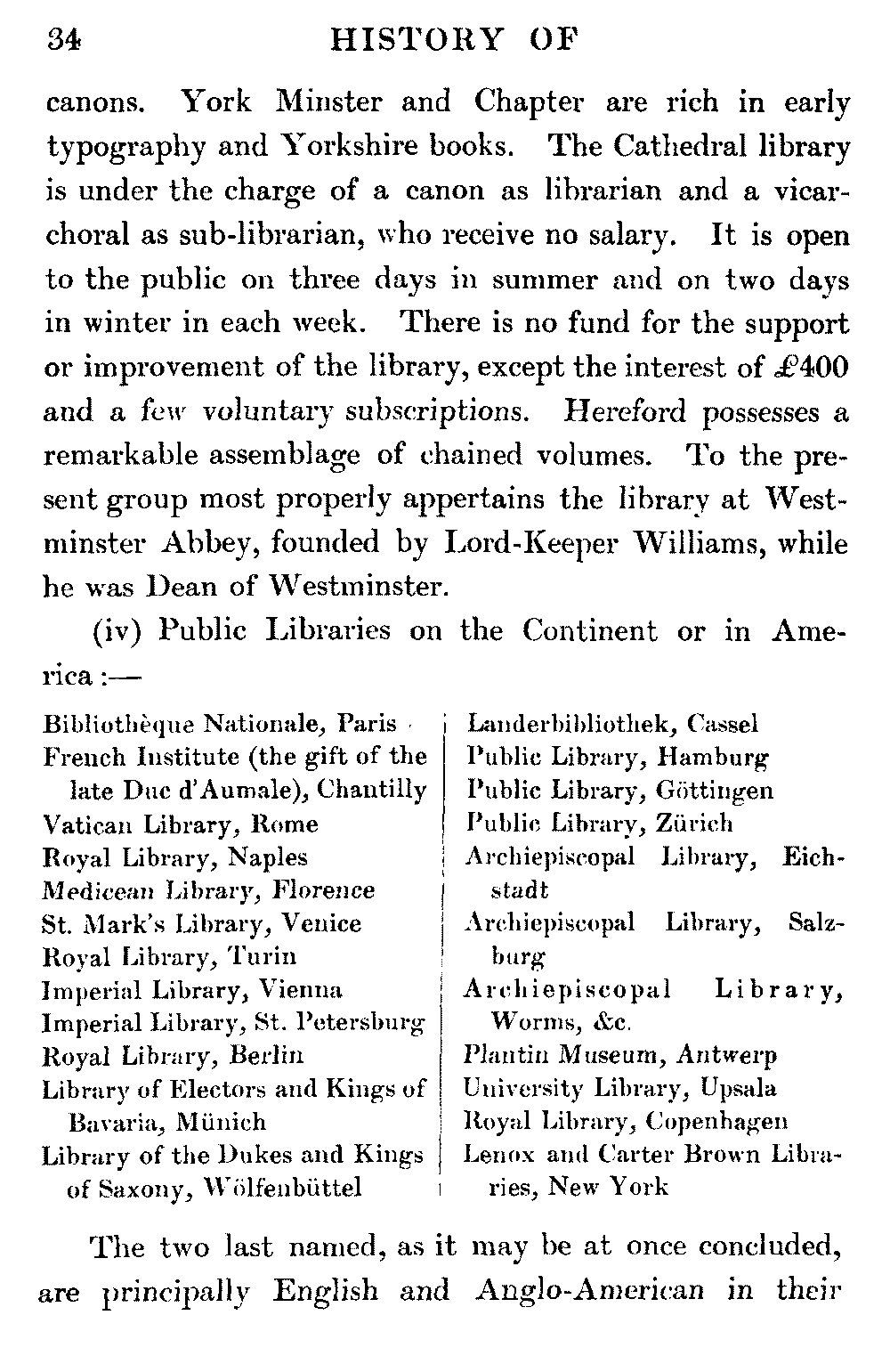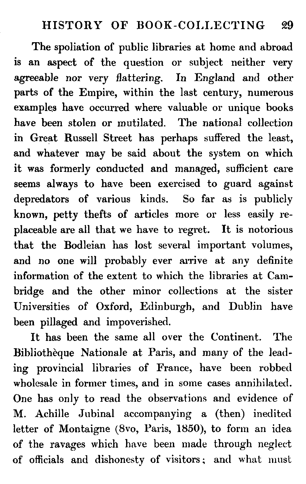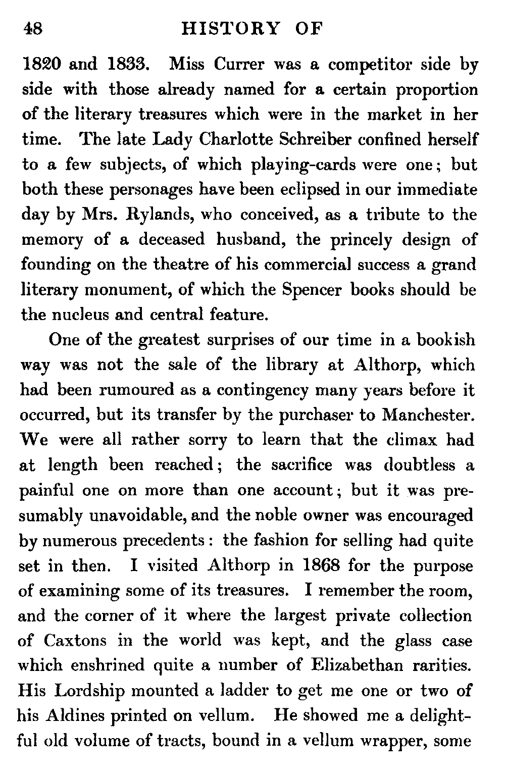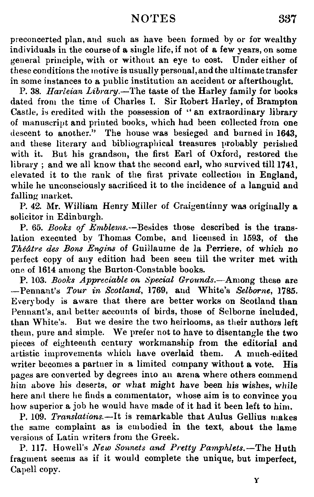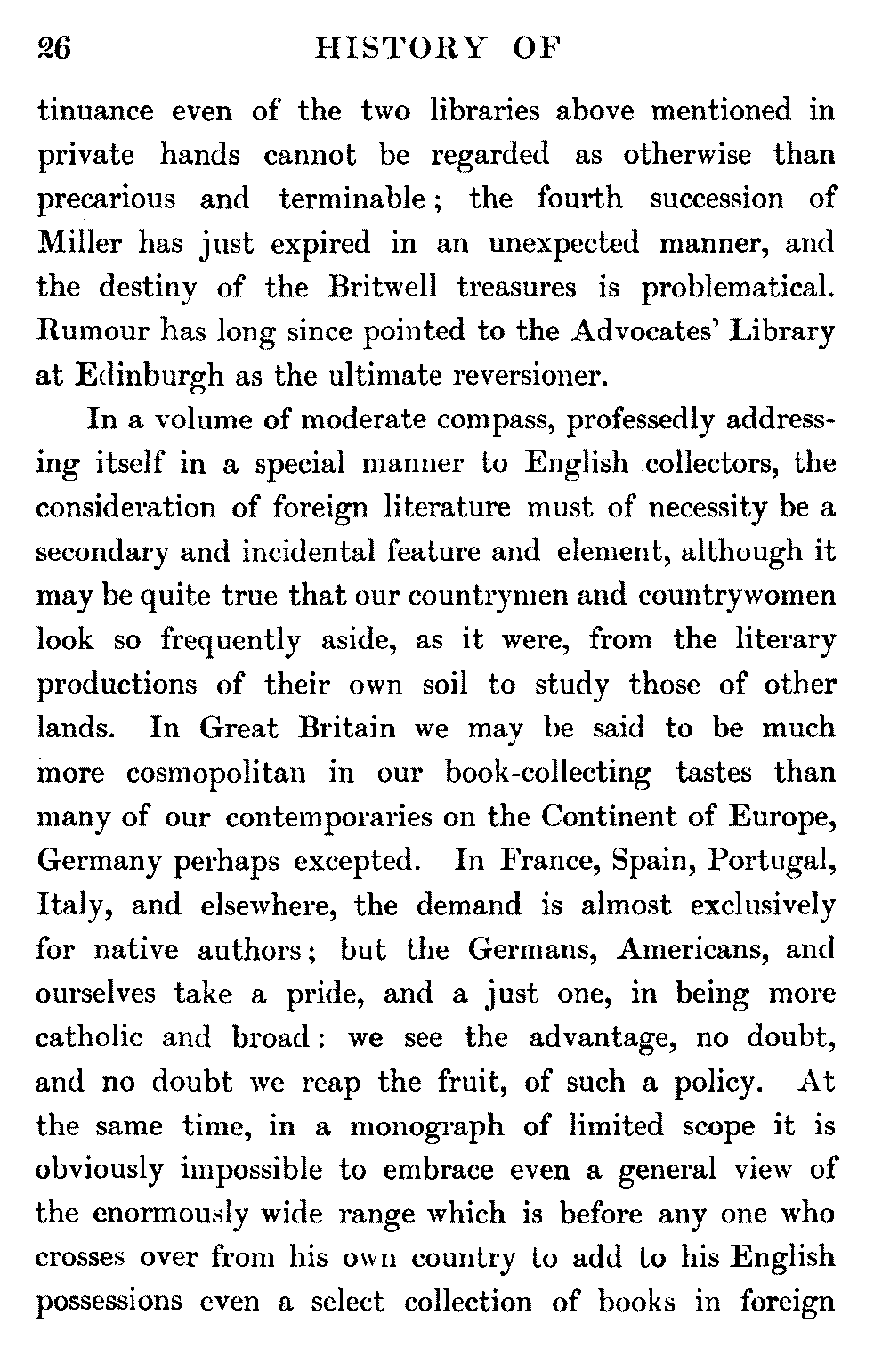 P. 37. Private Libraries.—In the case of private collections, we have to distinguish between those of an ancestral character, insensibly accumulated from generation to generation without any fixed or[337] preconcerted plan, and such as have been formed by or for wealthy individuals in the course of a single life, if not of a few years, on some general principle, with or without an eye to cost. Under either of these conditions the motive is usually personal, and the ultimate transfer in some instances to a public institution an accident or afterthought.