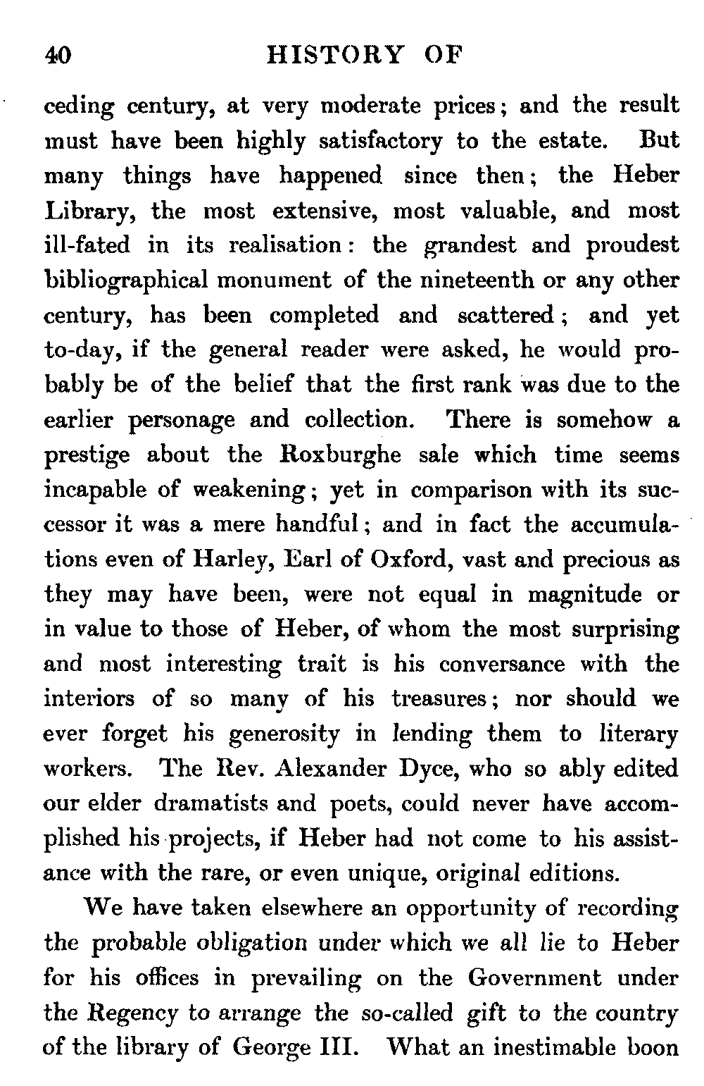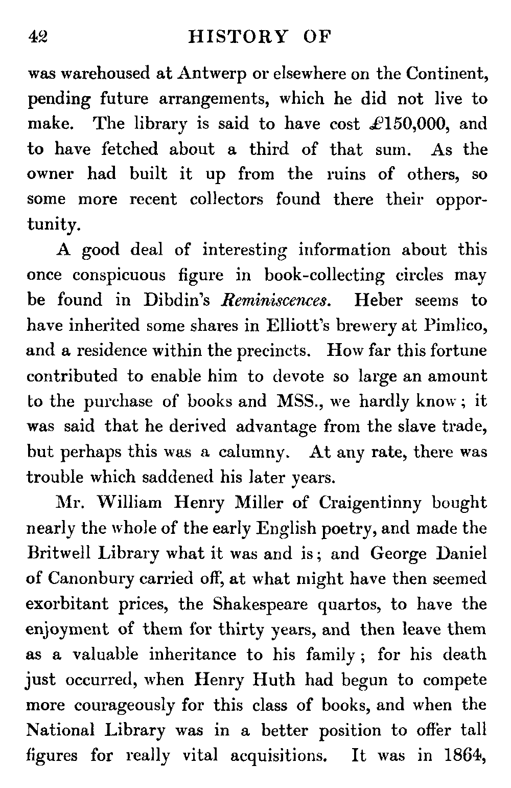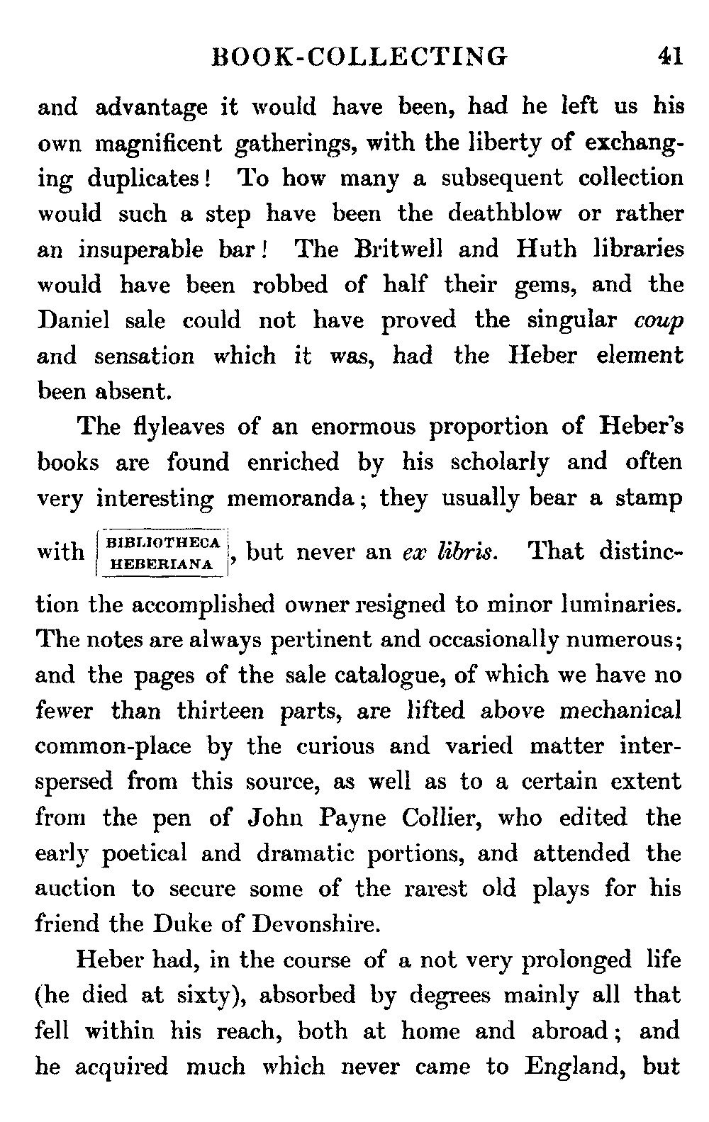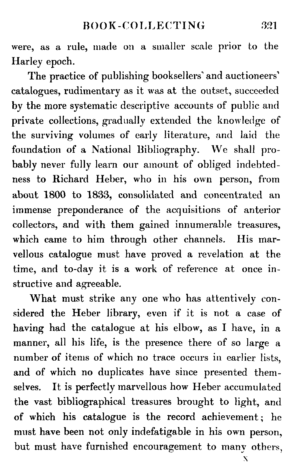 The practice of publishing booksellers' and auctioneers' catalogues, rudimentary as it was at the outset, succeeded by the more systematic descriptive accounts of public and private collections, gradually extended the knowledge of the surviving volumes of early literature, and laid the foundation of a National Bibliography. We shall probably never fully learn our amount of obliged indebtedness to Richard Heber, who in his own person, from about 1800 to 1833, consolidated and concentrated an immense preponderance of the acquisitions of anterior collectors, and with them gained innumerable treasures, which came to him through other channels. His marvellous catalogue must have proved a revelation at the time, and to-day it is a work of reference at once instructive and agreeable.