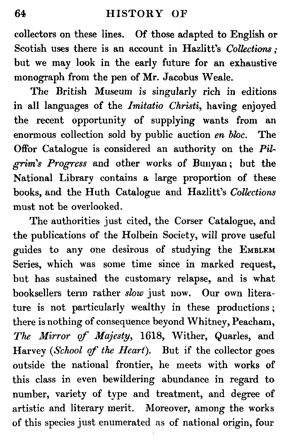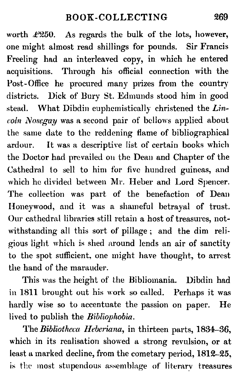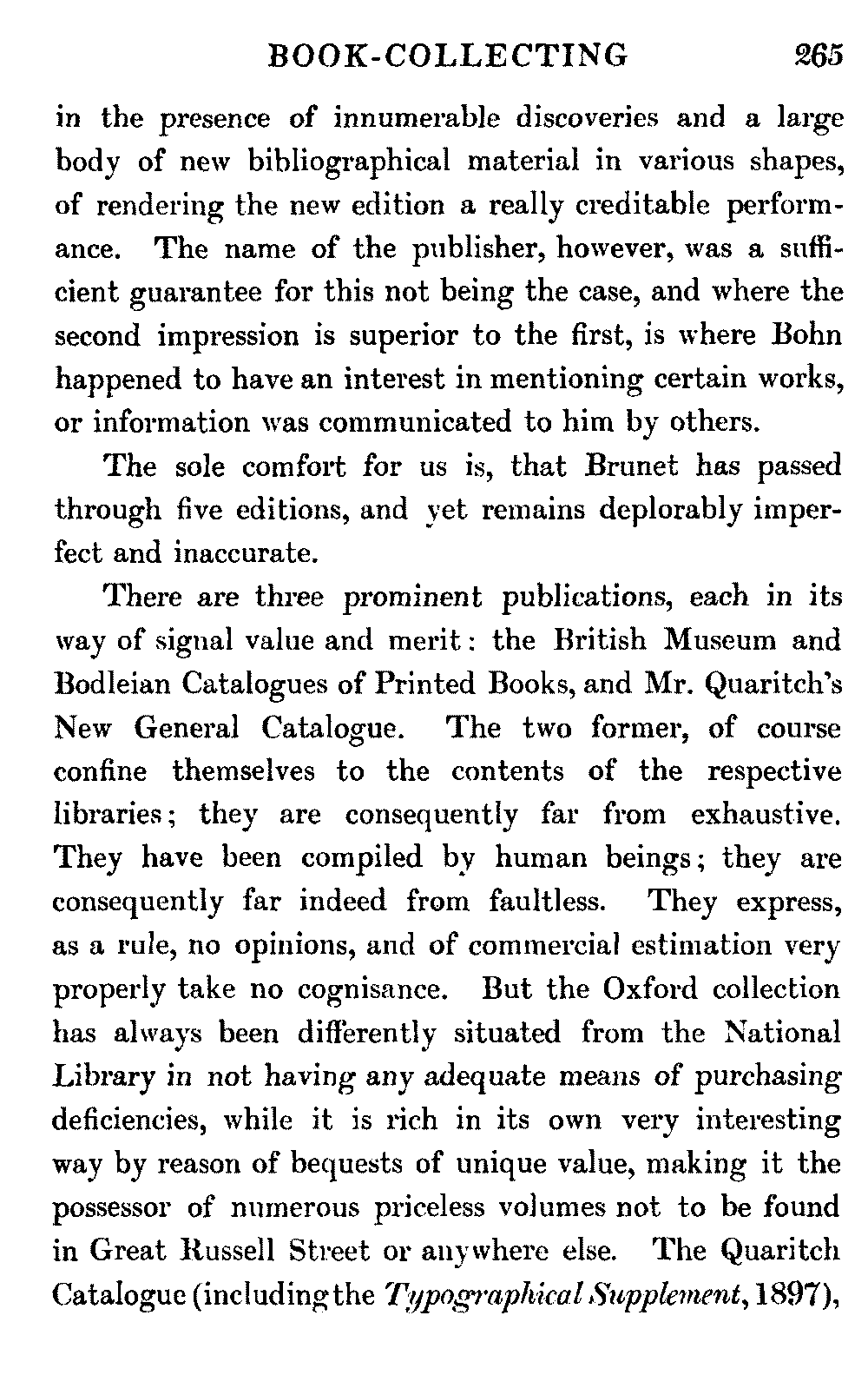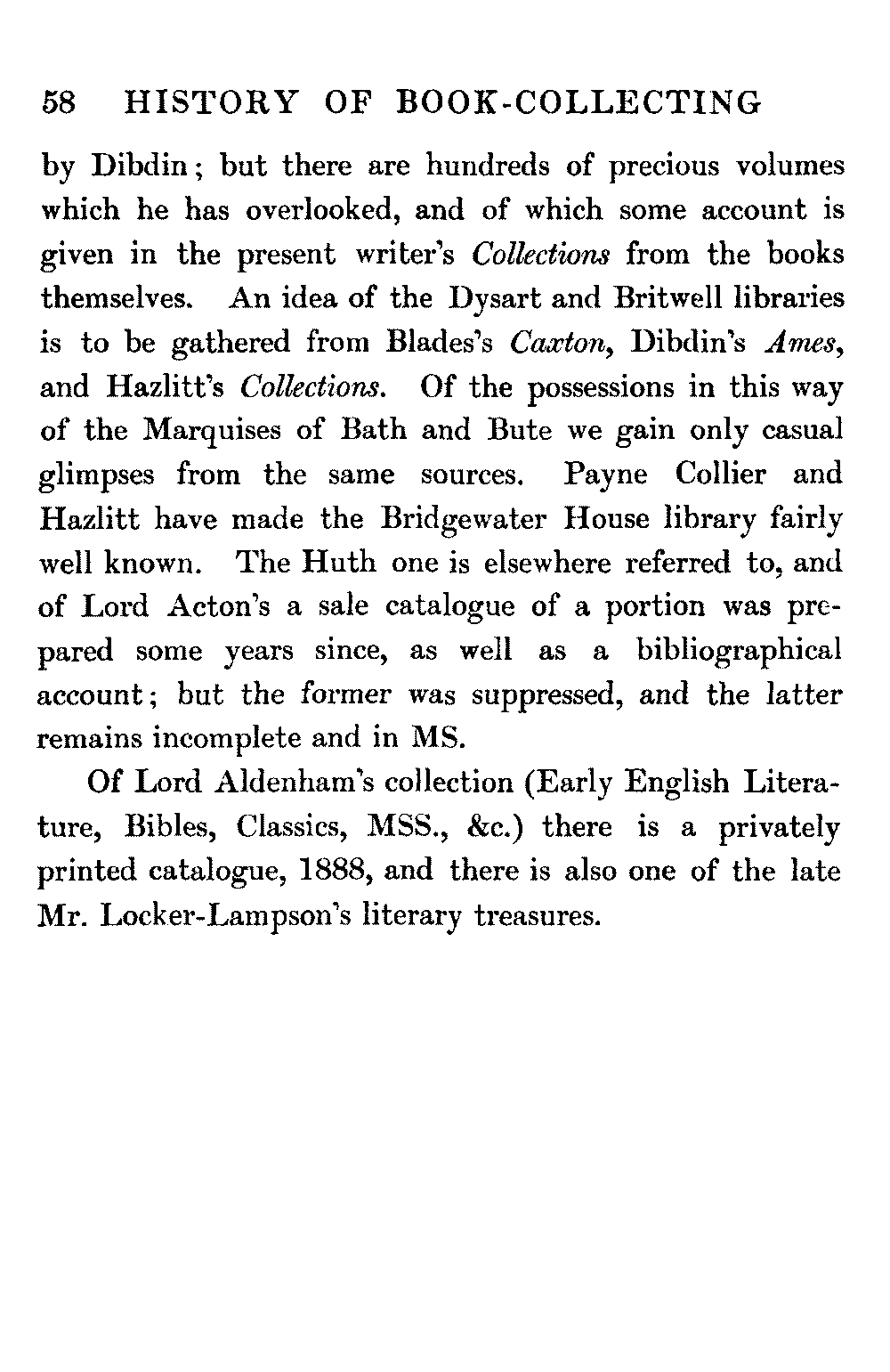 The practice of publishing booksellers' and auctioneers' catalogues, rudimentary as it was at the outset, succeeded by the more systematic descriptive accounts of public and private collections, gradually extended the knowledge of the surviving volumes of early literature, and laid the foundation of a National Bibliography. We shall probably never fully learn our amount of obliged indebtedness to Richard Heber, who in his own person, from about 1800 to 1833, consolidated and concentrated an immense preponderance of the acquisitions of anterior collectors, and with them gained innumerable treasures, which came to him through other channels. His marvellous catalogue must have proved a revelation at the time, and to-day it is a work of reference at once instructive and agreeable.