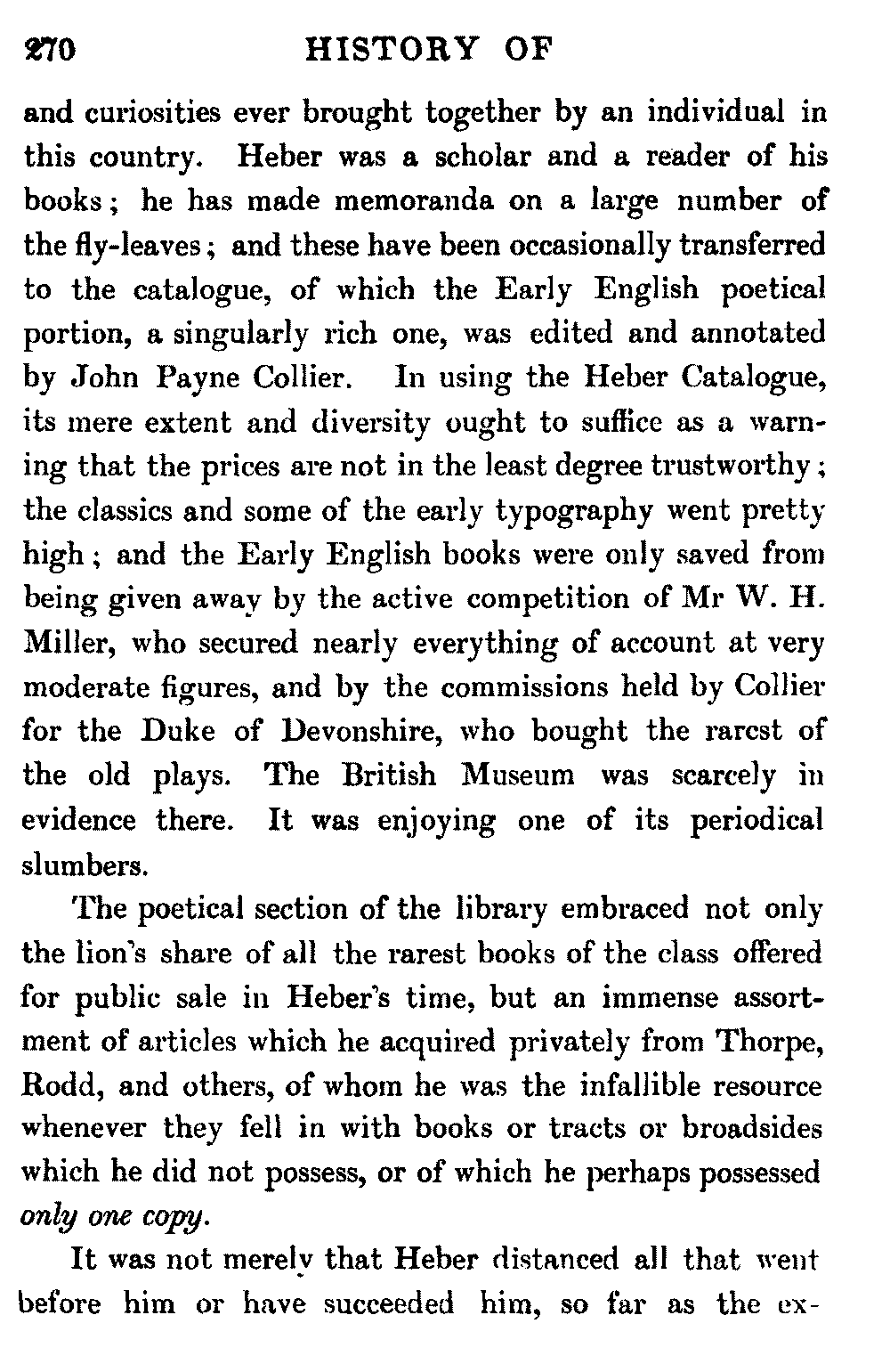 What must strike any one who has attentively considered the Heber library, even if it is not a case of having had the catalogue at his elbow, as I have, in a manner, all his life, is the presence there of so large a number of items of which no trace occurs in earlier lists, and of which no duplicates have since presented themselves. It is perfectly marvellous how Heber accumulated the vast bibliographical treasures brought to light, and of which his catalogue is the record achievement; he must have been not only indefatigable in his own person, but must have furnished encouragement to many others,[322] who met with rare books, to afford him the first refusal.