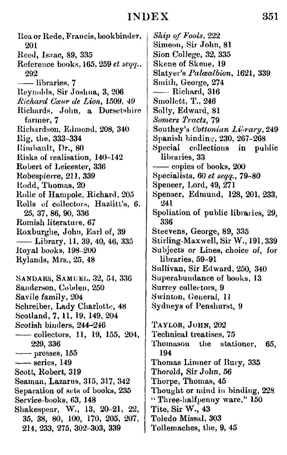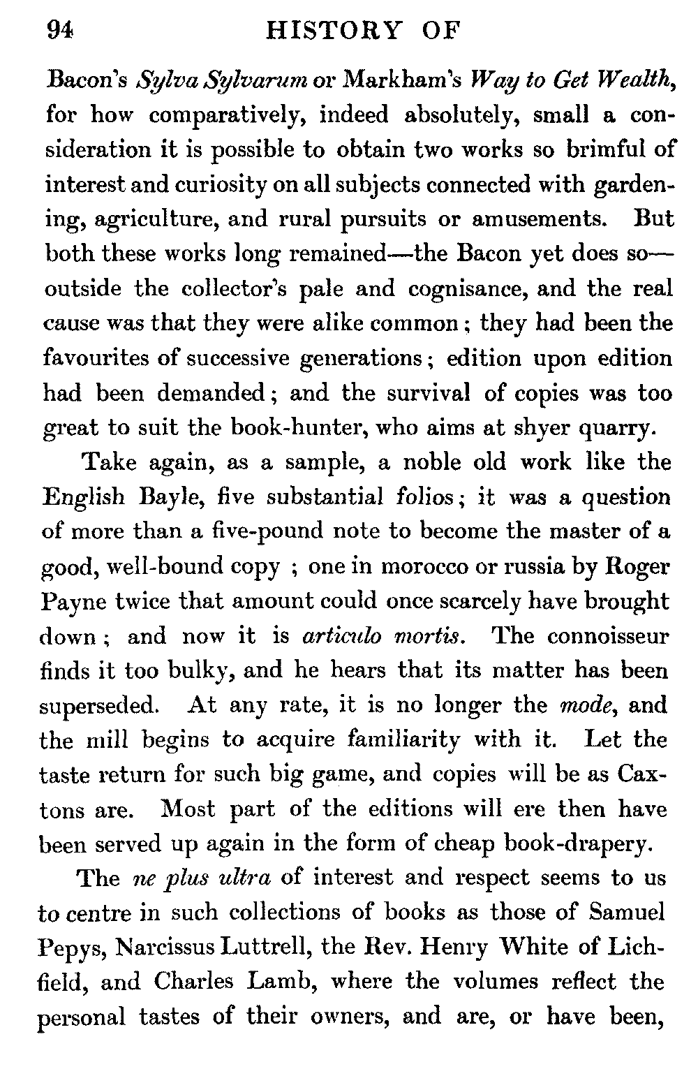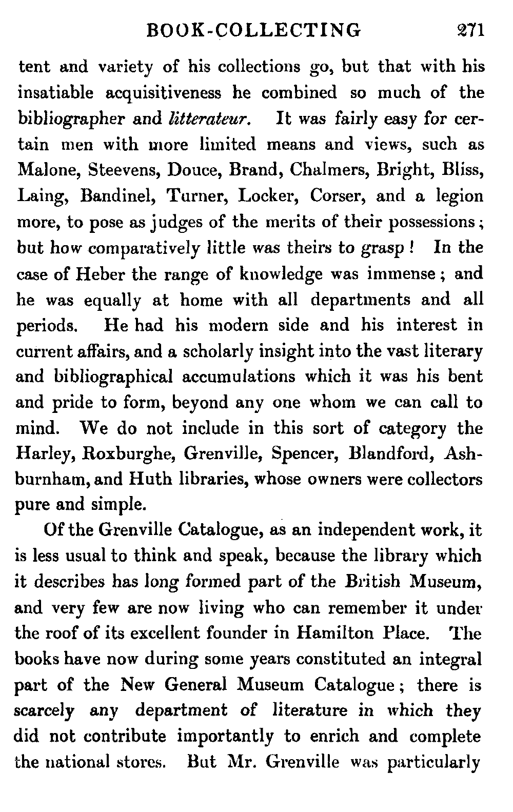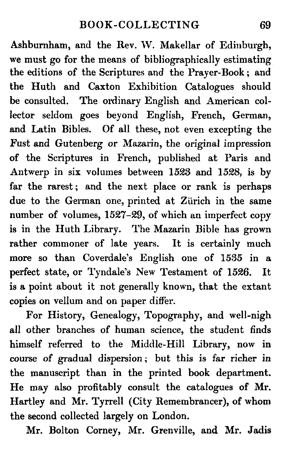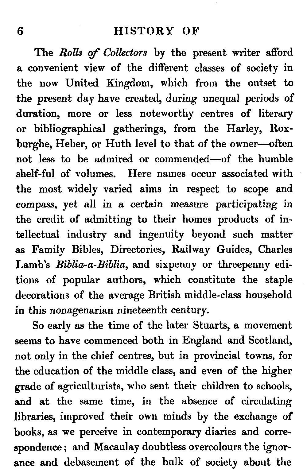 [6] The Rolls of Collectors by the present writer afford a convenient view of the different classes of society in the now United Kingdom, which from the outset to the present day have created, during unequal periods of duration, more or less noteworthy centres of literary or bibliographical gatherings, from the Harley, Roxburghe, Heber, or Huth level to that of the owner—often not less to be admired or commended—of the humble shelf-ful of volumes. Here names occur associated with the most widely varied aims in respect to scope and compass, yet all in a certain measure participating in the credit of admitting to their homes products of intellectual industry and ingenuity beyond such matter as Family Bibles, Directories, Railway Guides, Charles Lamb's Biblia-a-Biblia, and sixpenny or threepenny editions of popular authors, which constitute the staple decorations of the average British middle-class household in this nonagenarian nineteenth century.