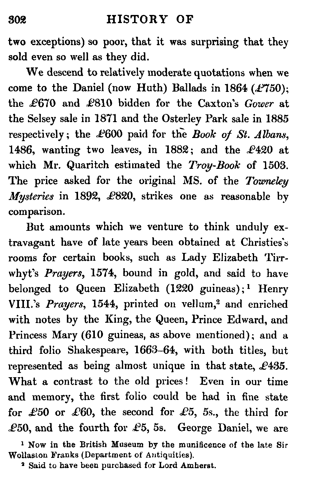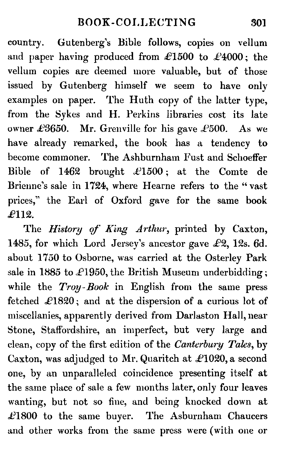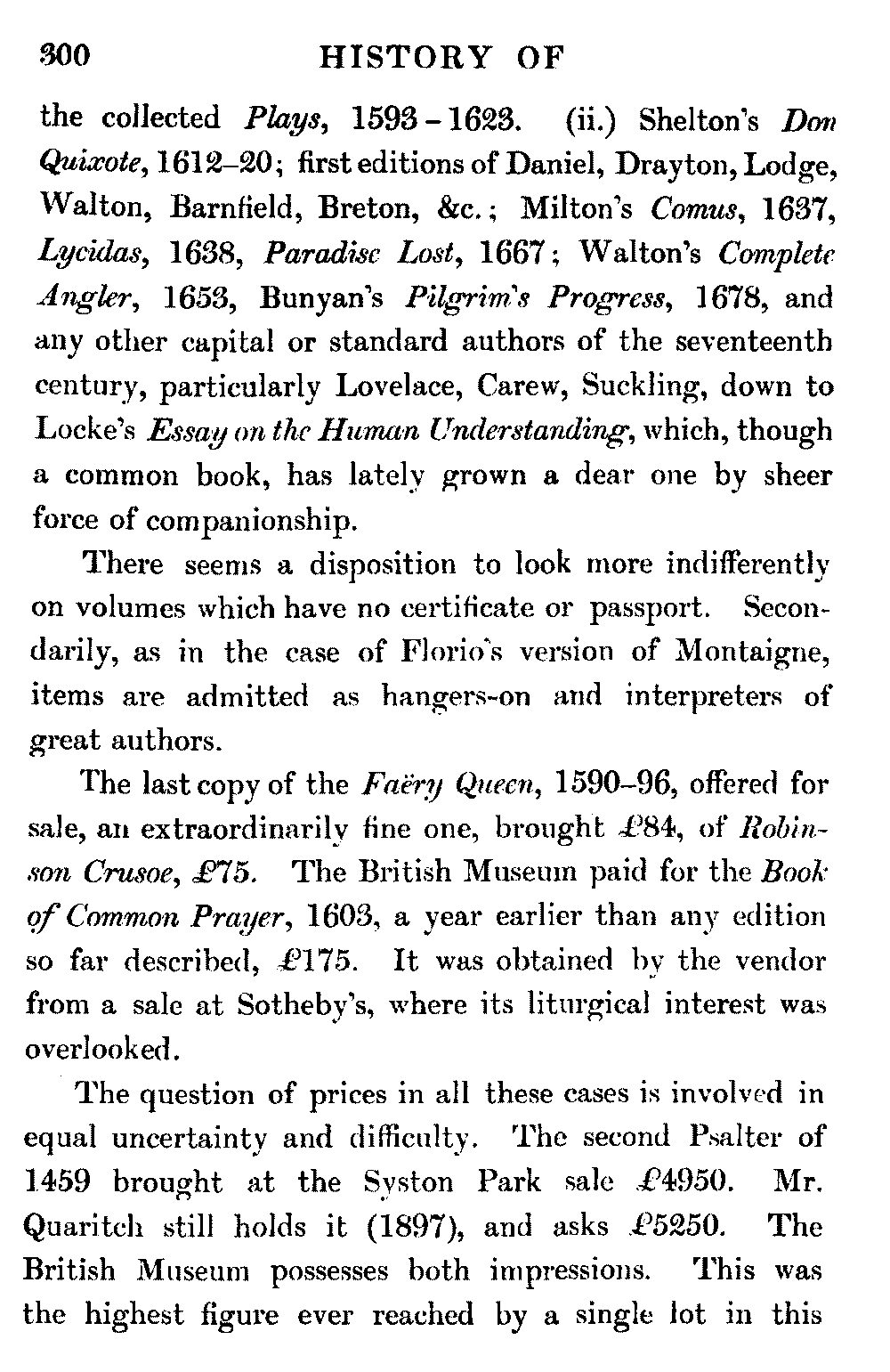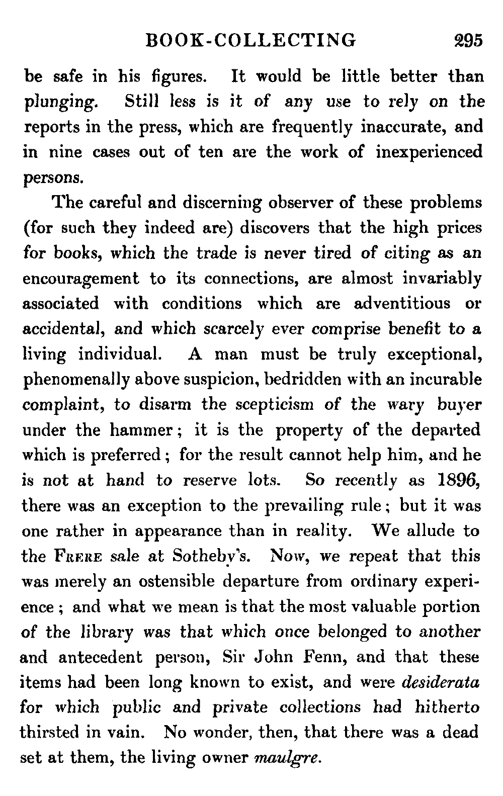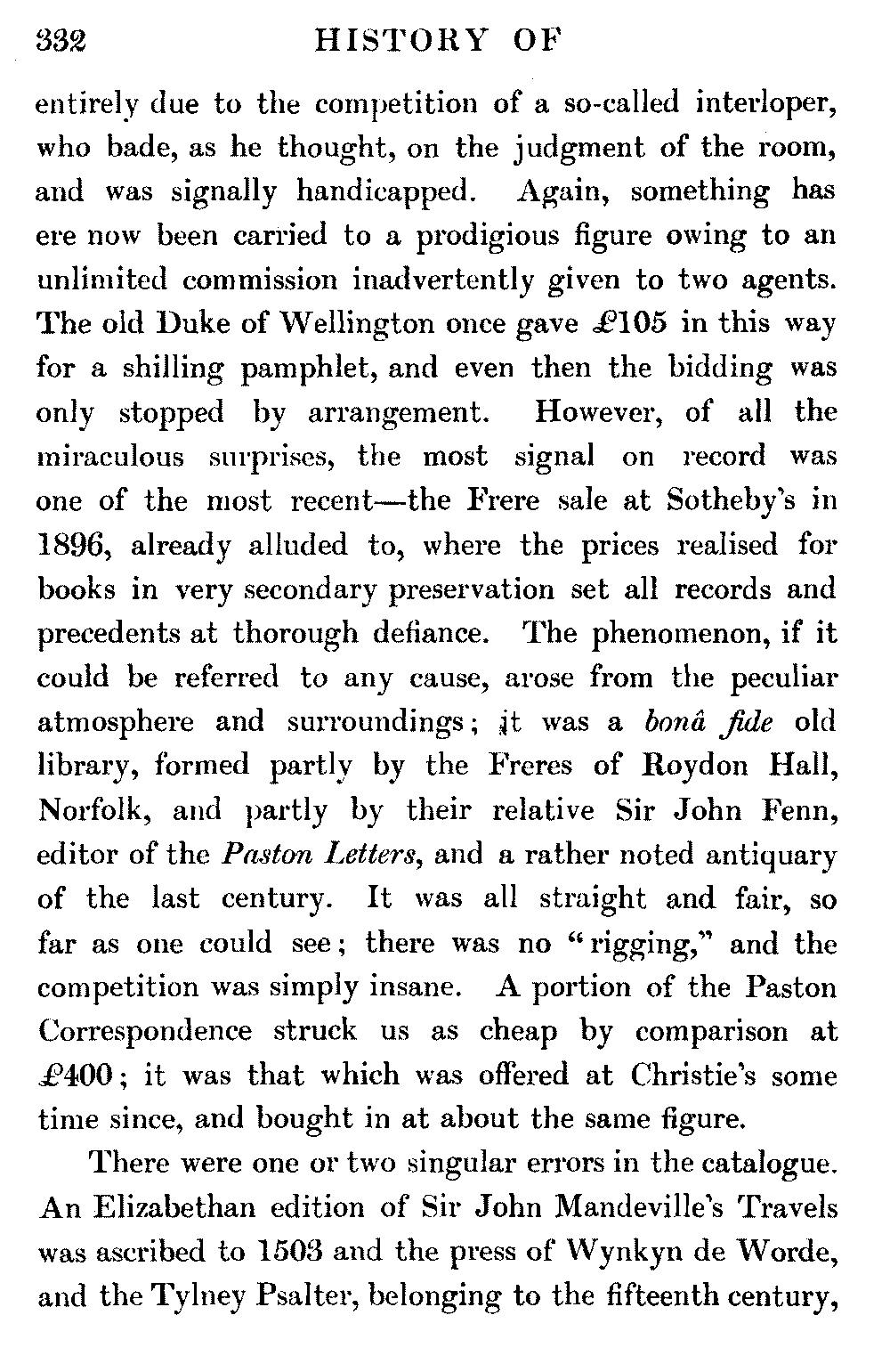 But to the artificial inflation of prices in our salerooms there is more than one side and one key. There was not so long since an instance at Christie's, and a second at Sotheby's, where the high quotations were[332] entirely due to the competition of a so-called interloper, who bade, as he thought, on the judgment of the room, and was signally handicapped. Again, something has ere now been carried to a prodigious figure owing to an unlimited commission inadvertently given to two agents. The old Duke of Wellington once gave £105 in this way for a shilling pamphlet, and even then the bidding was only stopped by arrangement. However, of all the miraculous surprises, the most signal on record was one of the most recent—the Frere sale at Sotheby's in 1896, already alluded to, where the prices realised for books in very secondary preservation set all records and precedents at thorough defiance. The phenomenon, if it could be referred to any cause, arose from the peculiar atmosphere and surroundings; it was a bonâ fide old library, formed partly by the Freres of Roydon Hall, Norfolk, and partly by their relative Sir John Fenn, editor of the Paston Letters, and a rather noted antiquary of the eighteenth century. It was all straight and fair, so far as one could see; there was no "rigging," and the competition was simply insane. A portion of the Paston Correspondence struck us as cheap by comparison at £400; it was that which was offered at Christie's some time since, and bought in at about the same figure.