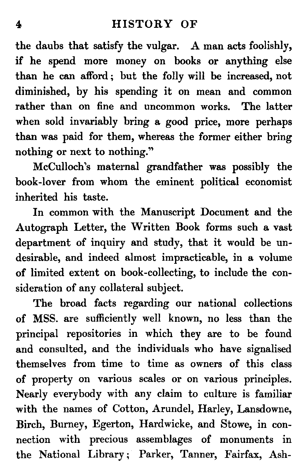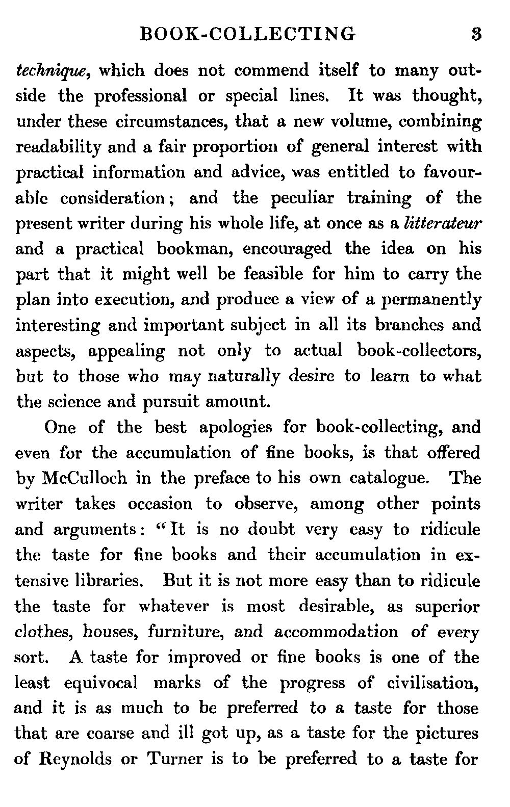 One of the best apologies for book-collecting, and even for the accumulation of fine books, is that offered by McCulloch in the preface to his own catalogue. The writer takes occasion to observe, among other points and arguments: "It is no doubt very easy to ridicule the taste for fine books and their accumulation in extensive libraries. But it is not more easy than to ridicule the taste for whatever is most desirable, as superior clothes, houses, furniture, and accommodation of every sort. A taste for improved or fine books is one of the least equivocal marks of the progress of civilisation, and it is as much to be preferred to a taste for those that are coarse and ill got up, as a taste for the pictures of Reynolds or Turner is to be preferred to a taste for[4] the daubs that satisfy the vulgar. A man acts foolishly, if he spend more money on books or anything else than he can afford; but the folly will be increased, not diminished, by his spending it on mean and common rather than on fine and uncommon works. The latter when sold invariably bring a good price, more perhaps than was paid for them, whereas the former either bring nothing or next to nothing."