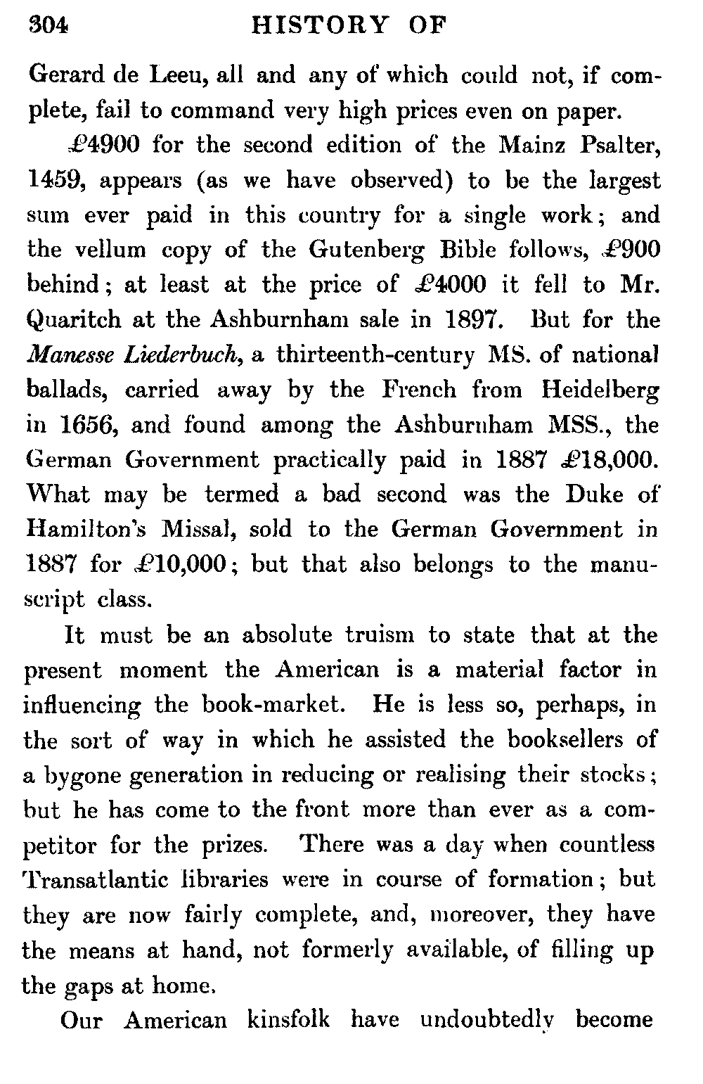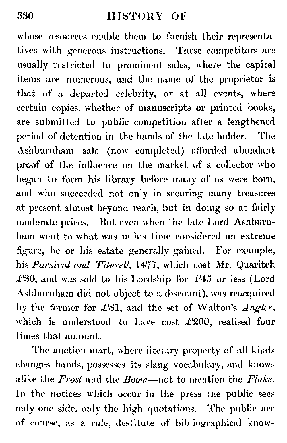 The characteristics and frequent surprises of auction figures largely proceed from the pressure brought to bear from without by bidders who are in the background, who often possess slight bibliographical knowledge, and[330] whose resources enable them to furnish their representatives with generous instructions. These competitors are usually restricted to prominent sales, where the capital items are numerous, and the name of the proprietor is that of a departed celebrity, or at all events, where certain copies, whether of manuscripts or printed books, are submitted to public competition after a lengthened period of detention in the hands of the late holder. The Ashburnham sale (now completed) afforded abundant proof of the influence on the market of a collector who began to form his library before many of us were born, and who succeeded not only in securing many treasures at present almost beyond reach, but in doing so at fairly moderate prices. But even when the late Lord Ashburnham went to what was in his time considered an extreme figure, he or his estate generally gained. For example, his Parzival and Titurell, 1477, which cost Mr. Quaritch £30, and was sold to his Lordship for £45 or less (Lord Ashburnham did not object to a discount), was reacquired by the former for £81, and the set of Walton's Angler, which is understood to have cost £200, realised four times that amount.