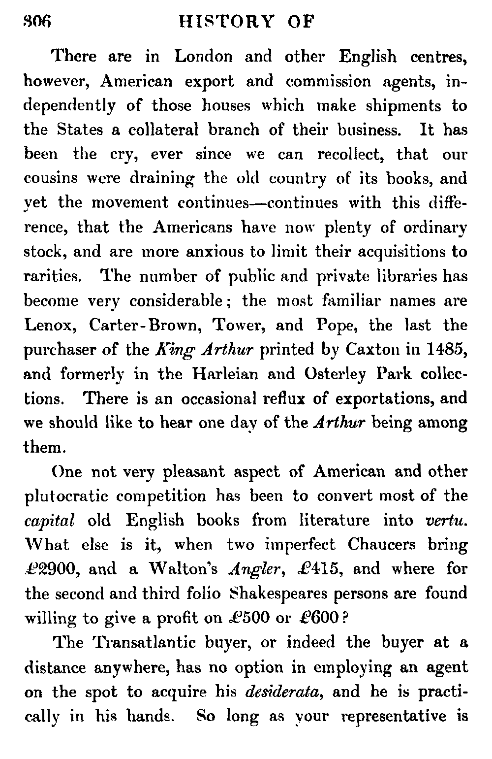 P. 307. Mr. Robert Hoe acquired the bulk or whole of Mr. Pope's books after his death, including the Caxton Arthur, 1485, and this gentleman continues to buy some of the most important items which occur for sale in London.