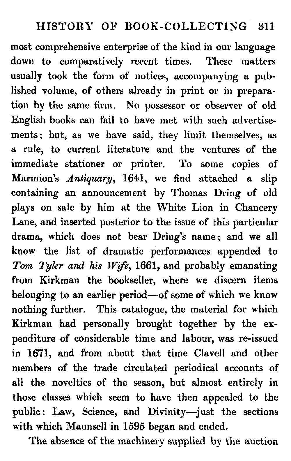 It has always been, and must always remain, a mystery whence the Harleian exemplars of a large number of unique or almost unique volumes belonging to the early vernacular literature of Great Britain were obtained. In some cases they are traceable to anterior owners and catalogues; but a considerable residue first come to the front here, and the explanation seems to be that the practice of registering unregarded trifles, as they were then deemed to be, in large parcels was necessarily fatal to individuality and to the survival of clues. To a certain extent the same disappointment awaits us in more recent days, till, in fact, the demand for old poetry, romances, and plays made the few extant[319] copies objects of interest to the trade sufficient to entitle them to prominence in their lists and in those published by the auctioneers. It may have been the catalogue of Joseph Ames, 1760, which was among the earliest to raise such items to the dignity of separate lots, thought by the purchasers at the time worth a shilling or two; but the noted sale of Mr. West in 1773 is entitled to rank as the foremost in those days, where the books and tracts, long since discovered to be represented by one or two accidental survivors, and grown dearer than gold a hundredfold, began to draw figures indicative of increased curiosity and appreciation.