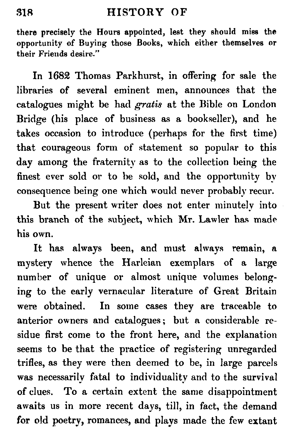 In 1682 Thomas Parkhurst, in offering for sale the libraries of several eminent men, announces that the catalogues might be had gratis at the Bible on London Bridge (his place of business as a bookseller), and he takes occasion to introduce (perhaps for the first time) that courageous form of statement so popular to this day among the fraternity as to the collection being the finest ever sold or to be sold, and the opportunity by consequence being one which would never probably recur.
