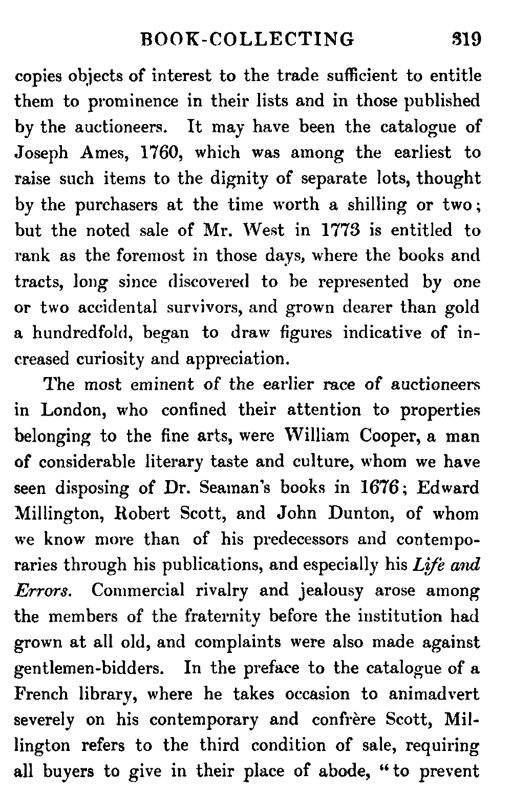 The most eminent of the earlier race of auctioneers in London, who confined their attention to properties belonging to the fine arts, were William Cooper, a man of considerable literary taste and culture, whom we have seen disposing of Dr. Seaman's books in 1676; Edward Millington, Robert Scott, and John Dunton, of whom we know more than of his predecessors and contemporaries through his publications, and especially his Life and Errors. Commercial rivalry and jealousy arose among the members of the fraternity before the institution had grown at all old, and complaints were also made against gentlemen-bidders. In the preface to the catalogue of a French library, where he takes occasion to animadvert severely on his contemporary and confrère Scott, Millington refers to the third condition of sale, requiring all buyers to give in their place of abode, "to prevent[320] the inconveniences that have more or less hitherto attended the Undertakers, and also the Purchasers, by reason that several persons, out of Vanity and Ostentation, have appeared and bought, to the damage and disappointment of the Parties they outbid, and have not been so kind to their own Reputation, or just to the Proprietors, as to pay for and fetch them away." This was in 1687.