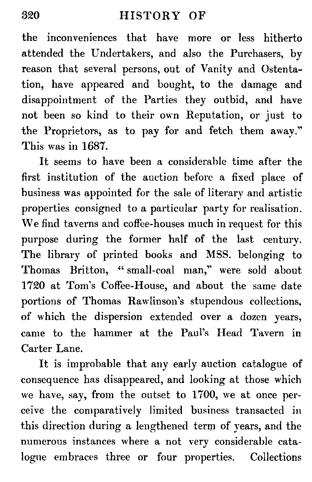 It seems to have been a considerable time after the first institution of the auction before a fixed place of business was appointed for the sale of literary and artistic properties consigned to a particular party for realisation. We find taverns and coffee-houses much in request for this purpose during the former half of the last century. The library of printed books and MSS. belonging to Thomas Britton, "small-coal man," were sold about 1720 at Tom's Coffee-House, and about the same date portions of Thomas Rawlinson's stupendous collections, of which the dispersion extended over a dozen years, came to the hammer at the Paul's Head Tavern in Carter Lane.