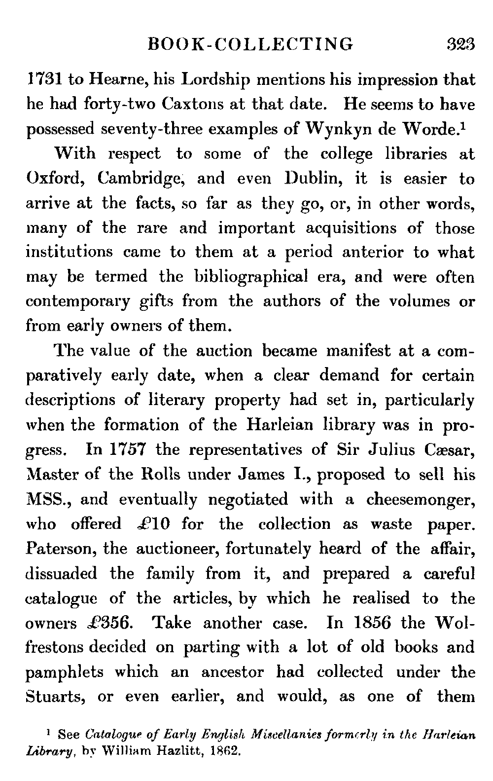 The value of the auction became manifest at a comparatively early date, when a clear demand for certain descriptions of literary property had set in, particularly when the formation of the Harleian library was in progress. In 1757 the representatives of Sir Julius Cæsar, Master of the Rolls under James I., proposed to sell his MSS., and eventually negotiated with a cheesemonger, who offered £10 for the collection as waste paper. Paterson, the auctioneer, fortunately heard of the affair, dissuaded the family from it, and prepared a careful catalogue of the articles, by which he realised to the owners £356. Take another case. In 1856 the Wolfrestons decided on parting with a lot of old books and pamphlets which an ancestor had collected under the Stuarts, or even earlier, and would, as one of them[324] informed us, have gladly accepted £30 for the whole. But they were sent to Sotheby's, and realised £750.
