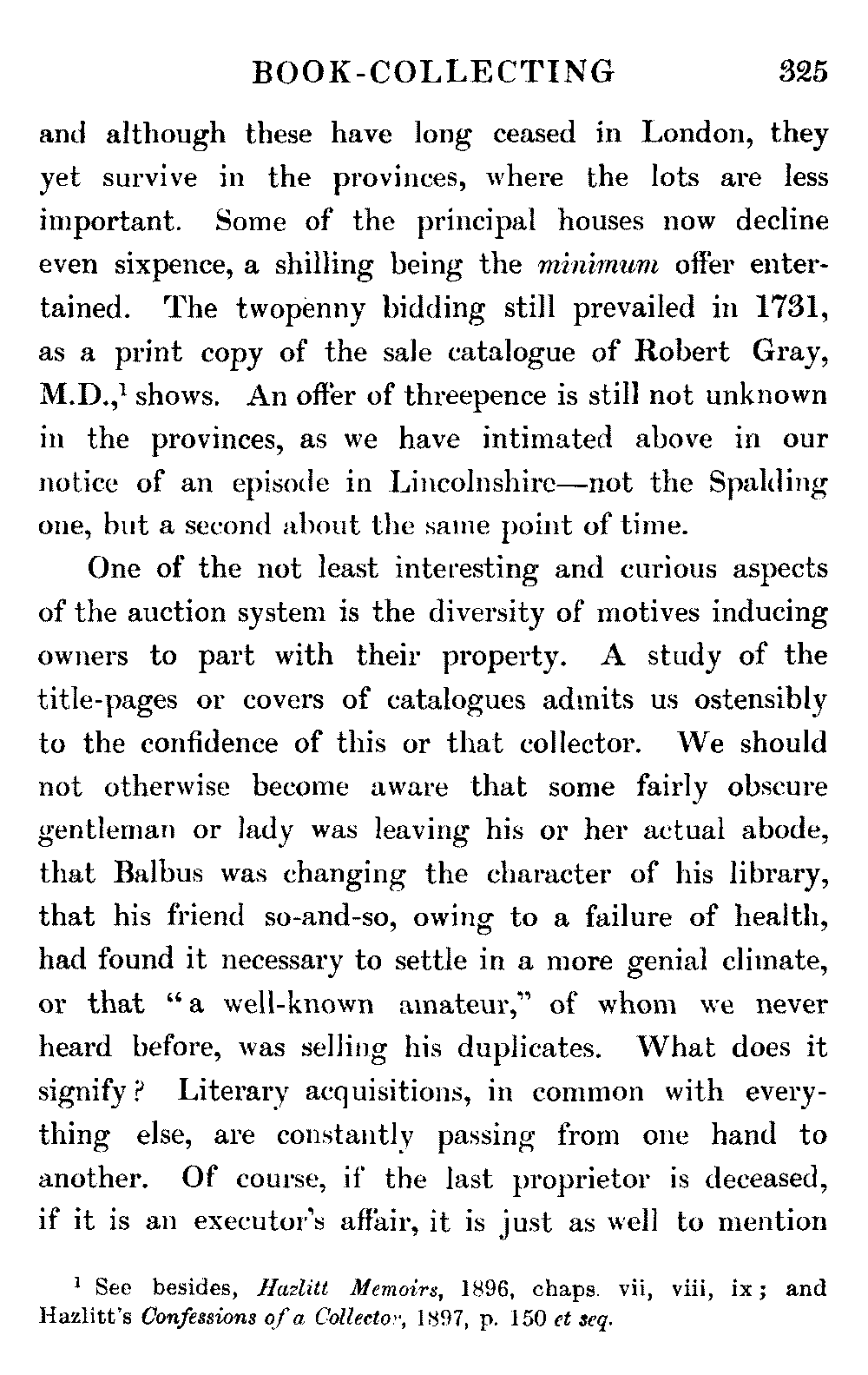 A point which merits a passing mention, however, is the history of the bidding at these scenes of competition. It has been remarked as a singular circumstance that in the seventeenth century penny biddings were usual; but it was the silver penny of those days, and we have to remember the higher purchasing value of money. Twopenny and threepenny advances succeeded,[325] and although these have long ceased in London, they yet survive in the provinces, where the lots are less important. Some of the principal houses now decline even sixpence, a shilling being the minimum offer entertained. The twopenny bidding still prevailed in 1731, as a priced copy of the sale catalogue of Robert Gray, M.D.,[9] shows. An offer of threepence is still not unknown in the provinces, as we have intimated above in our notice of an episode in Lincolnshire—not the Spalding one, but a second about the same point of time.