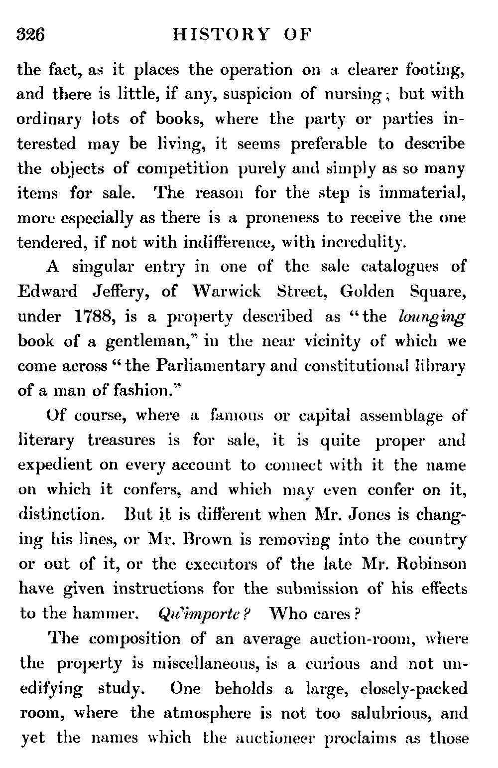 Of course, where a famous or capital assemblage of literary treasures is for sale, it is quite proper and expedient on every account to connect with it the name on which it confers, and which may even confer on it, distinction. But it is different when Mr. Jones is changing his lines, or Mr. Brown is removing into the country or out of it, or the executors of the late Mr. Robinson have given instructions for the submission of his effects to the hammer. Qu'importe? Who cares?