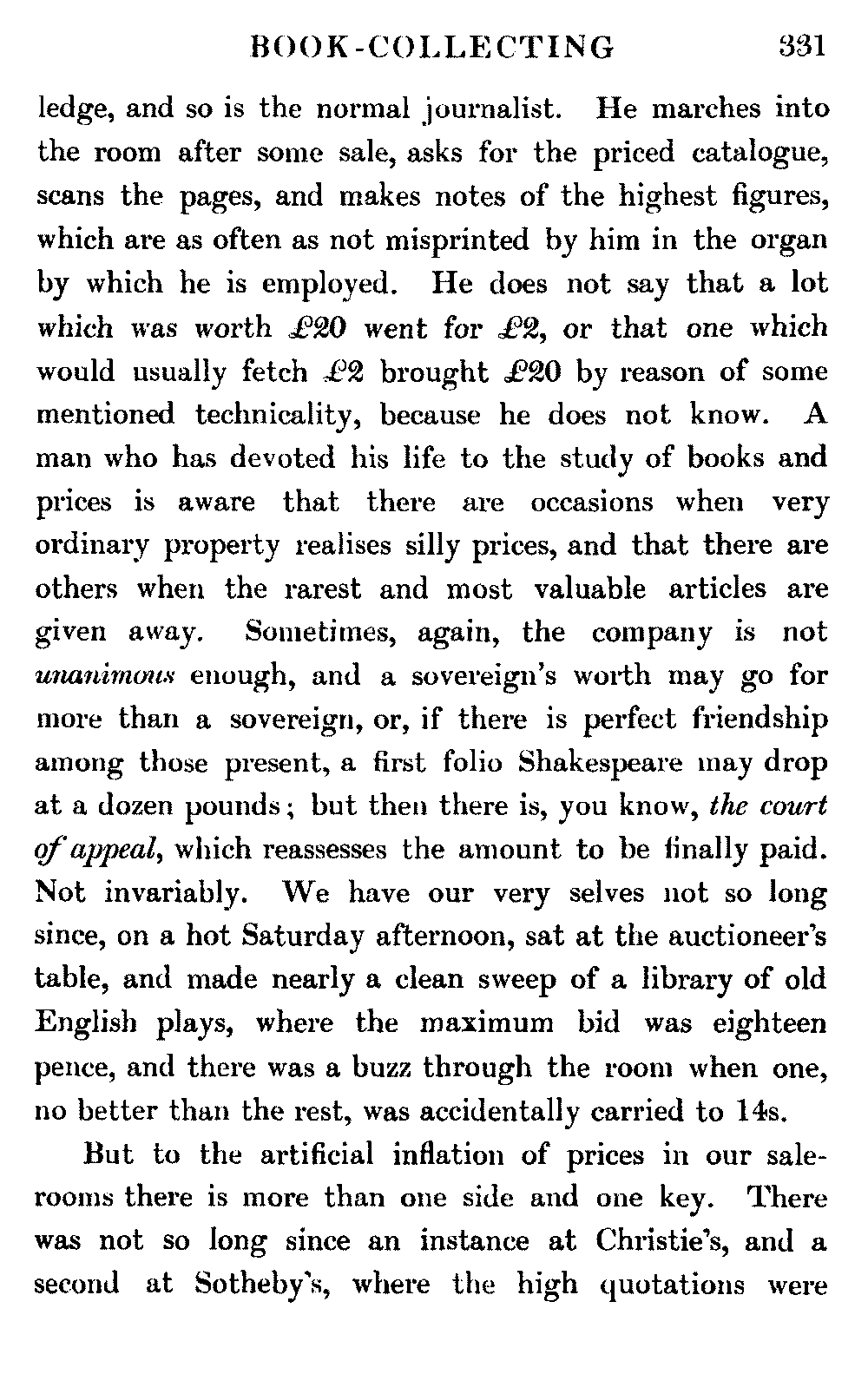 The auction mart, where literary property of all kinds changes hands, possesses its slang vocabulary, and knows alike the Frost and the Boom—not to mention the Fluke. In the notices which occur in the press the public sees only one side, only the high quotations. The public are of course, as a rule, destitute of bibliographical know[331]ledge, and so is the normal journalist. He marches into the room after some sale, asks for the priced catalogue, scans the pages, and makes notes of the highest figures, which are as often as not misprinted by him in the organ by which he is employed. He does not say that a lot which was worth £20 went for £2, or that one which would usually fetch £2, brought £20 by reason of some mentioned technicality, because he does not know. A man who has devoted his life to the study of books and prices is aware that there are occasions when very ordinary property realises silly prices, and that there are others when the rarest and most valuable articles are given away. Sometimes, again, the company is not unanimous enough, and a sovereign's worth may go for more than a sovereign, or, if there is perfect friendship among those present, a first folio Shakespeare may drop at a dozen pounds; but then there is, you know, the court of appeal, which reassesses the amount to be finally paid. Not invariably. We have our very selves not so long since, on a hot Saturday afternoon, sat at the auctioneer's table, and made nearly a clean sweep of a library of old English plays, where the maximum bid was eighteen pence, and there was a buzz through the room when one, no better than the rest, was accidentally carried to 14s.