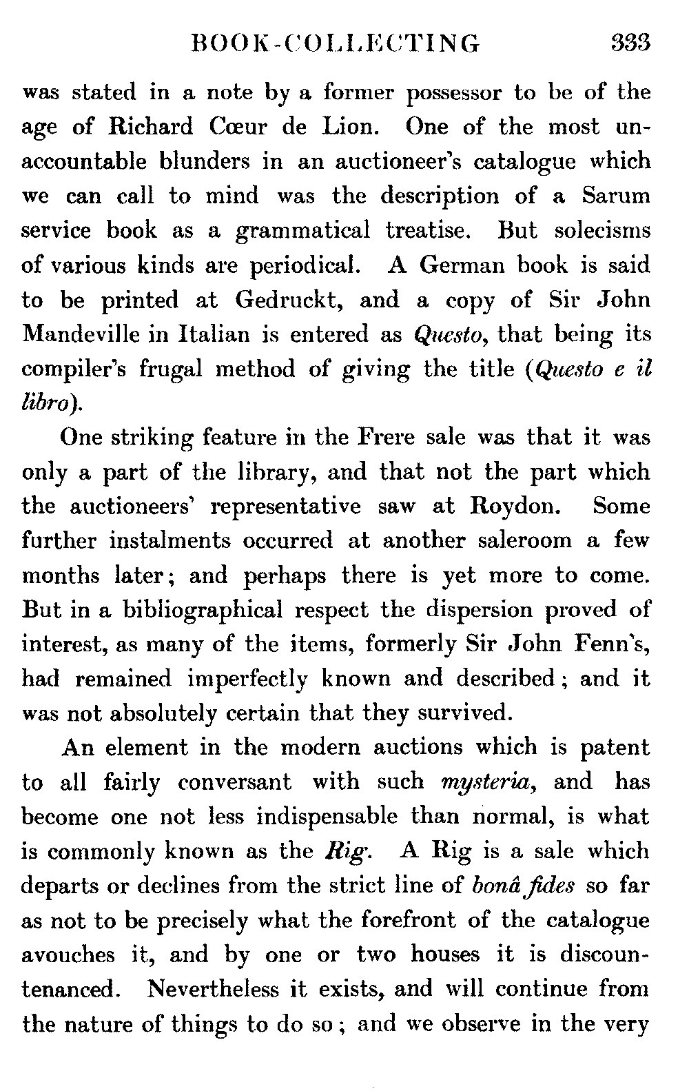 There were one or two singular errors in the catalogue. An Elizabethan edition of Sir John Mandeville's Travels was ascribed to 1503 and the press of Wynkyn de Worde, and the Tylney Psalter, belonging to the fifteenth century,[333] was stated in a note by a former possessor to be of the age of Richard Cœur de Lion. One of the most unaccountable blunders in an auctioneer's catalogue which we can call to mind was the description of a Sarum service book as a grammatical treatise. But solecisms of various kinds are periodical. A German book is said to be printed at Gedruckt, and a copy of Sir John Mandeville in Italian is entered as Questo, that being its compiler's frugal method of giving the title (Questo e il libro).