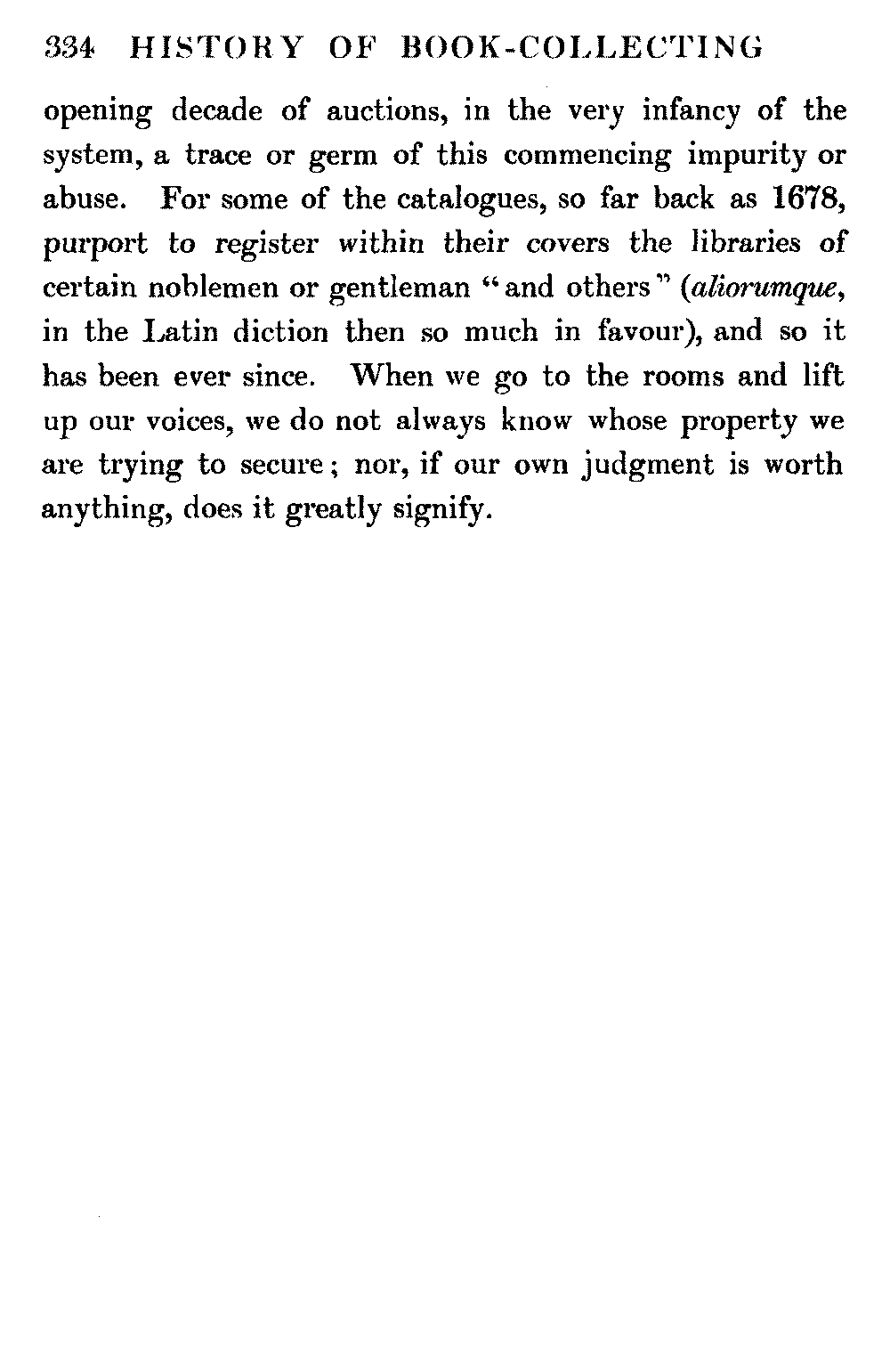 An element in the modern auctions which is patent to all fairly conversant with such mysteria, and has become one not less indispensable than normal, is what is commonly known as the Rig. A Rig is a sale which departs or declines from the strict line of bona fides so far as not to be precisely what the forefront of the catalogue avouches it, and by one or two houses it is discountenanced. Nevertheless it exists, and will continue from the nature of things to do so; and we observe in the very[334] opening decade of auctions, in the very infancy of the system, a trace or germ of this commencing impurity or abuse. For some of the catalogues, so far back as 1678, purport to register within their covers the libraries of certain noblemen or gentleman "and others" (aliorumque, in the Latin diction then so much in favour), and so it has been ever since. When we go to the rooms and lift up our voices, we do not always know whose property we are trying to secure; nor, if our own judgment is worth anything, does it greatly signify.