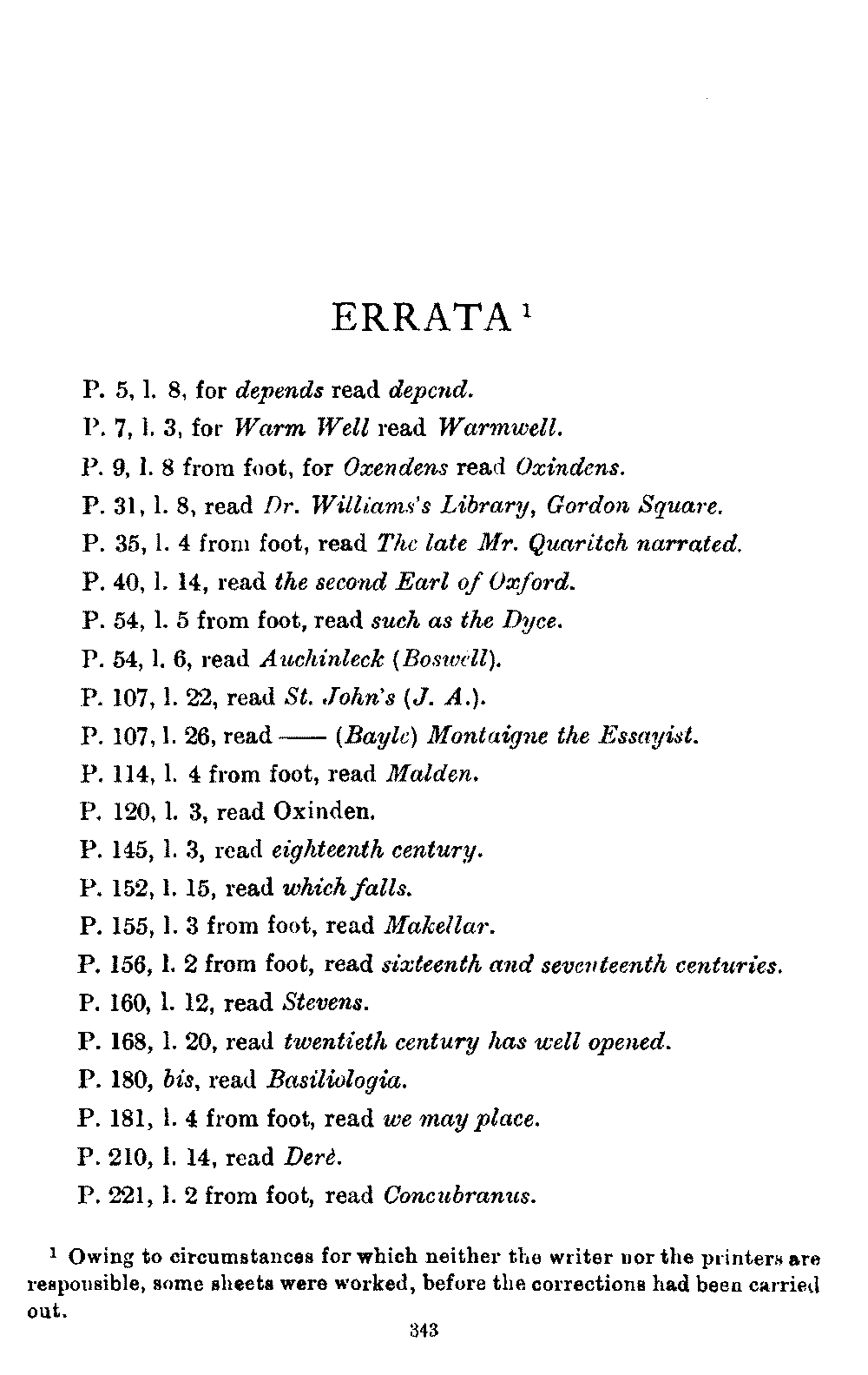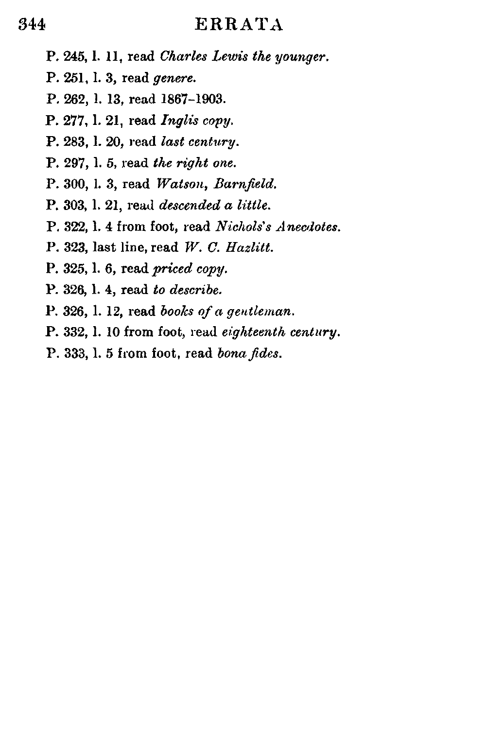 P. 263. The catalogue of the Early English Books in the British Museum was mainly the work of Mr. Eccles, a late member of the staff. A new, enlarged, and much improved edition by Mr. Pollard is in progress.