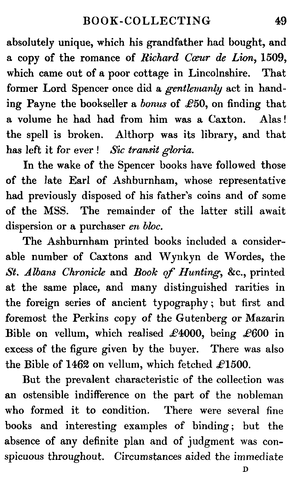 To watch carefully and studiously a big sale such as[328] that of the Ashburnham library, of which two out of three portions are now scattered, is a bibliographical, if not a commercial, education in little. We attended in person throughout, and observed with interest and profit the curious working, unappreciable to those not practically versed in books, and acquainted with the result only through paragraphs in the newspapers. A spectator with some preparatory training could see how and why certain lots fetched such and such abnormal figures; and a leading agency in this direction was the unfortunate employment—unfortunate for himself, not for the owner or the auctioneer—by a leading buyer of an agent who had to win his purchases from men stronger than himself. Thus the Caxton's Jason, instead of bringing perhaps £1000, ran up to more than twice that sum, while, if it was re-sold under different conditions, it might not even reach the lower amount. Still more striking were the offers for such things as the first English edition of More's Utopia (£51), a volume which has repeatedly sold for a couple of guineas; while, on the other hand, a handsomely bound copy of Bourrienne's Memoires in ten volumes went for 11s., and other ordinary works in proportion.