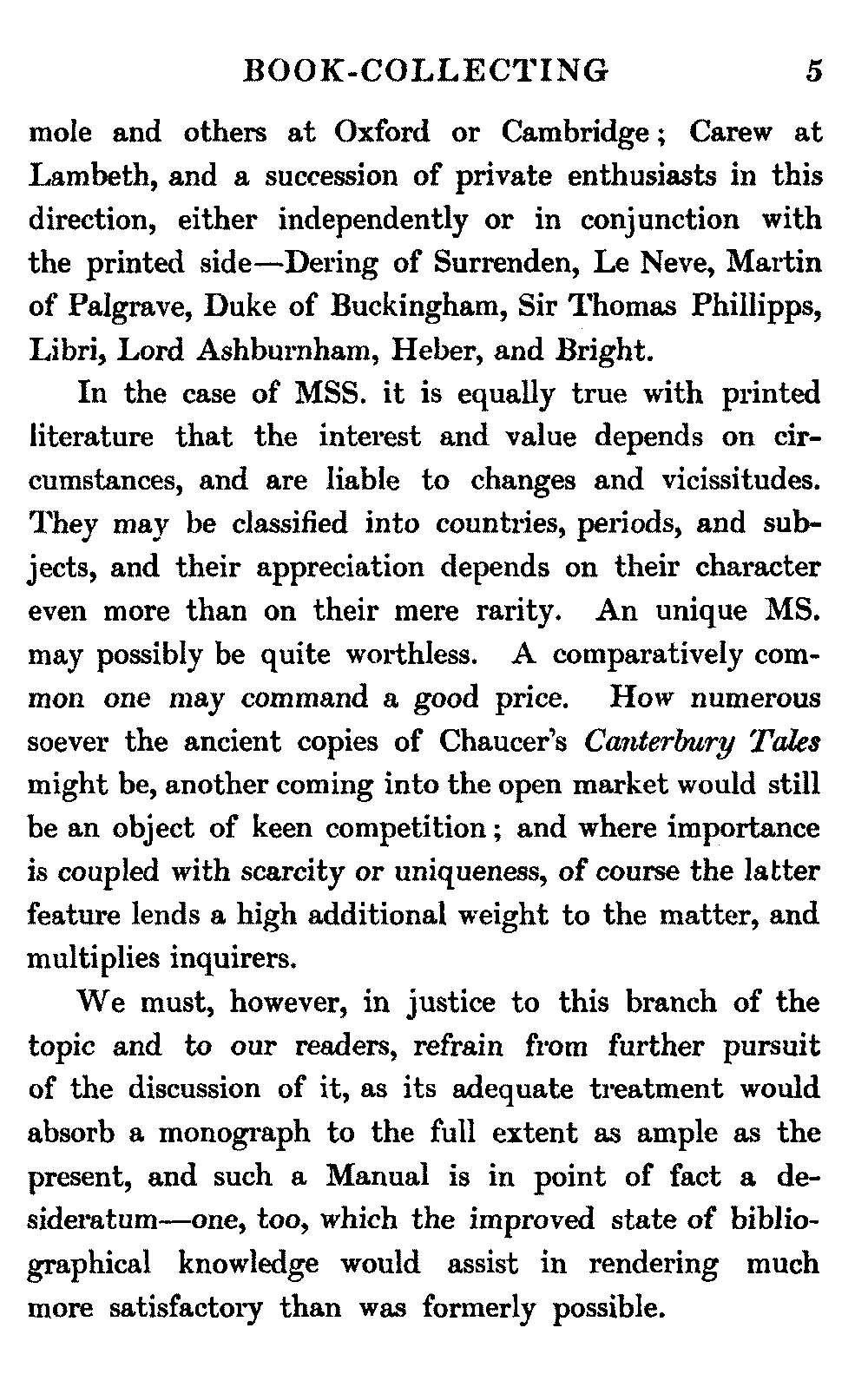 In the case of MSS. it is equally true with printed literature that the interest and value depend on circumstances, and are liable to changes and vicissitudes. They may be classified into countries, periods, and subjects, and their appreciation depends on their character even more than on their mere rarity. An unique MS. may possibly be quite worthless. A comparatively common one may command a good price. How numerous soever the ancient copies of Chaucer's Canterbury Tales might be, another coming into the open market would still be an object of keen competition; and where importance is coupled with scarcity or uniqueness, of course the latter feature lends a high additional weight to the matter, and multiplies inquirers.