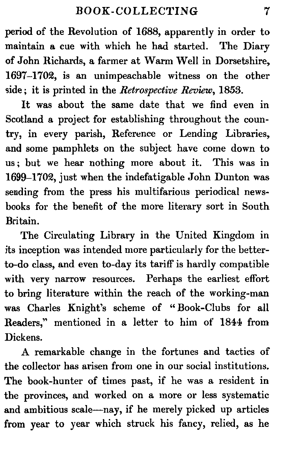 It was about the same date that we find even in Scotland a project for establishing throughout the country, in every parish, Reference or Lending Libraries, and some pamphlets on the subject have come down to us; but we hear nothing more about it. This was in 1699-1702, just when the indefatigable John Dunton was sending from the press his multifarious periodical news-books for the benefit of the more literary sort in South Britain.
