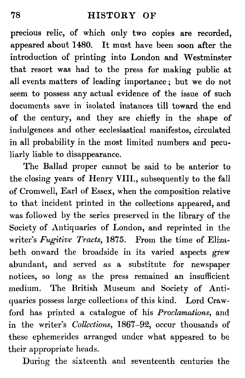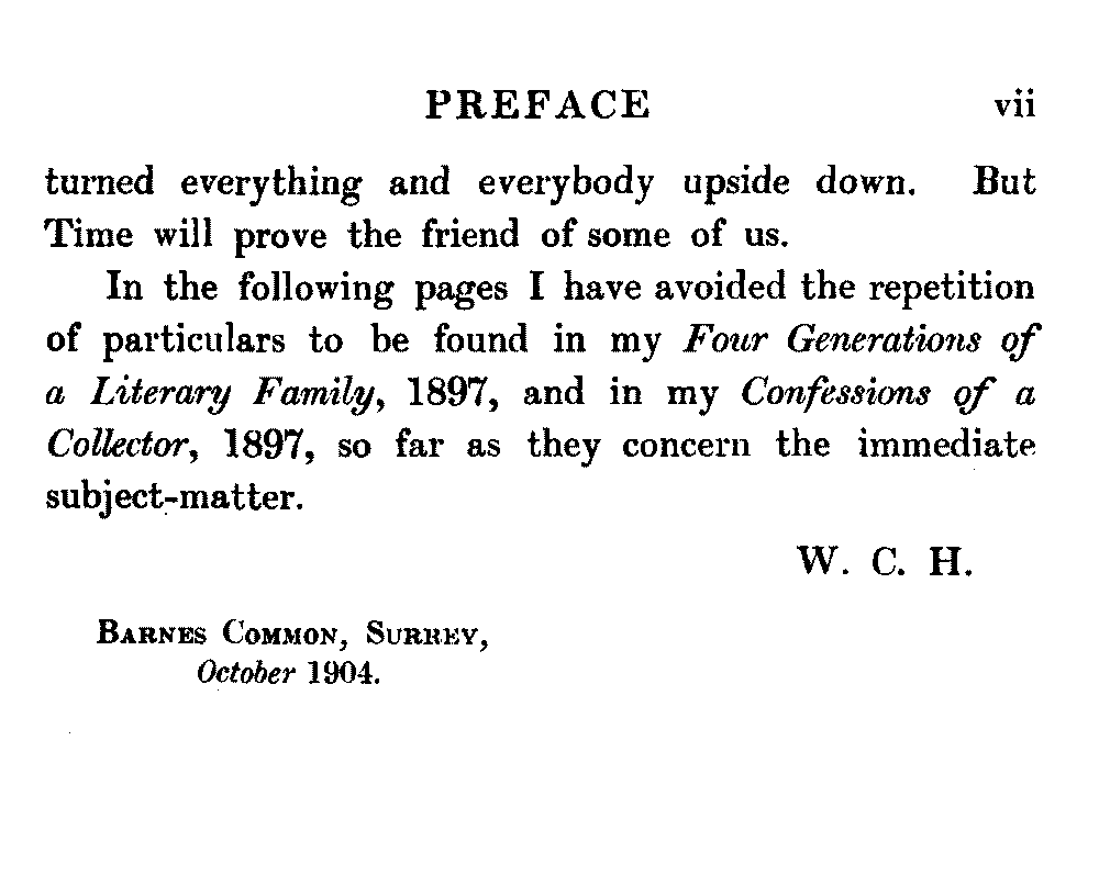 During a very long course of years I have had occasion to study books in all their branches, in almost all tongues, of almost all periods, personally and closely. No early English volumes, while I have been on the track, have, if I could help it, escaped my scrutiny; and I have not let them pass from my hands without noting every particular which seemed to me important and interesting in a historical, literary, biographical, and bibliographical respect. The result of these protracted[vi] and laborious investigations is partly manifest in my Bibliographical Collections, 1867-1903, extending to eight octavo volumes; but a good deal of matter remained, which could not be utilised in that series or in my other miscellaneous contributions to belles lettres.
