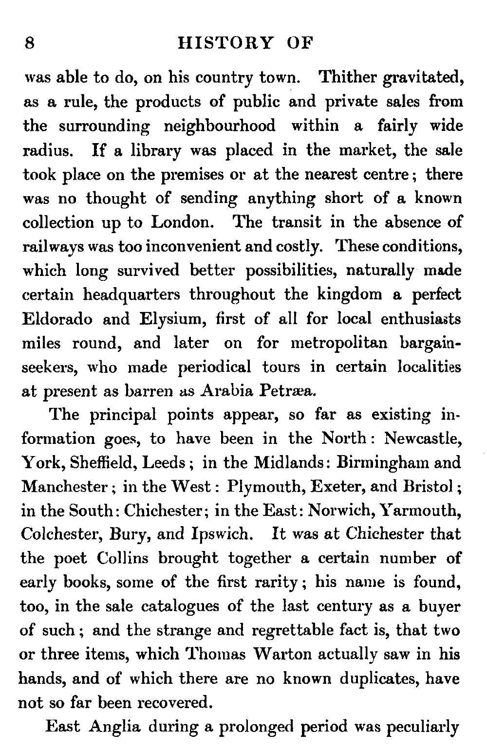 The principal points appear, so far as existing information goes, to have been in the North: Newcastle, York, Sheffield, Leeds; in the Midlands: Birmingham and Manchester; in the West: Plymouth, Exeter, and Bristol; in the South: Chichester; in the East: Norwich, Yarmouth, Colchester, Bury, and Ipswich. It was at Chichester that the poet Collins brought together a certain number of early books, some of the first rarity; his name is found, too, in the sale catalogues of the last century as a buyer of such; and the strange and regrettable fact is, that two or three items, which Thomas Warton actually saw in his hands, and of which there are no known duplicates, have not so far been recovered.