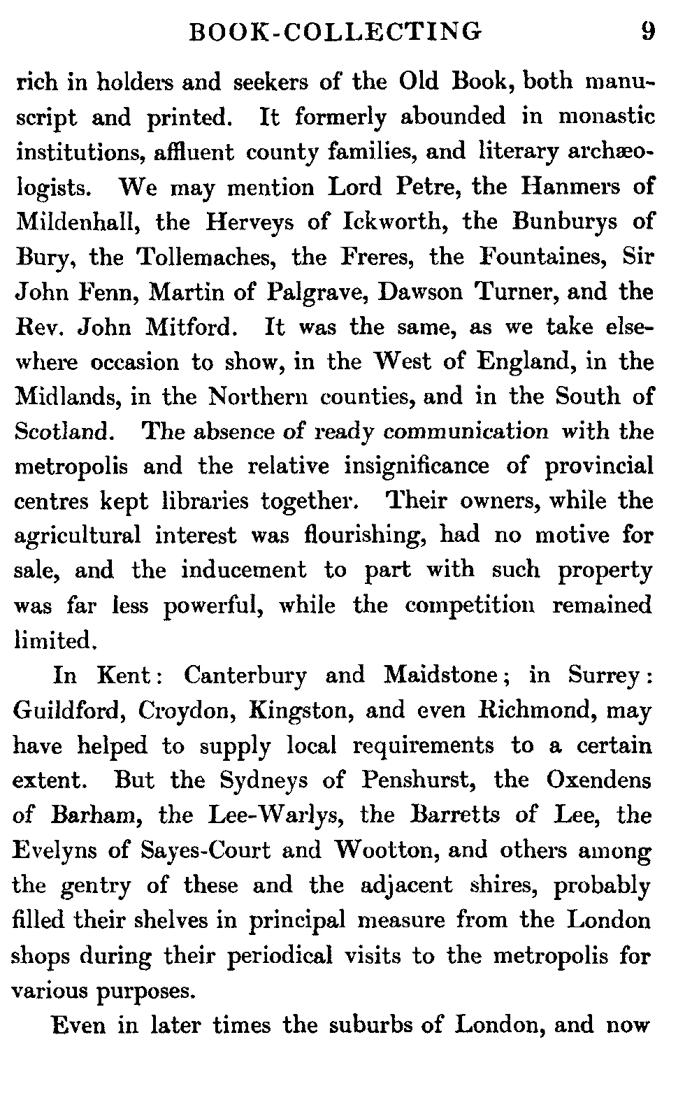 East Anglia during a prolonged period was peculiarly[9] rich in holders and seekers of the Old Book, both manuscript and printed. It formerly abounded in monastic institutions, affluent county families, and literary archæologists. We may mention Lord Petre, the Hanmers of Mildenhall, the Herveys of Ickworth, the Bunburys of Bury, the Tollemaches, the Freres, the Fountaines, Sir John Fenn, Martin of Palgrave, Dawson Turner, and the Rev. John Mitford. It was the same, as we take elsewhere occasion to show, in the West of England, in the Midlands, in the Northern counties, and in the South of Scotland. The absence of ready communication with the metropolis and the relative insignificance of provincial centres kept libraries together. Their owners, while the agricultural interest was flourishing, had no motive for sale, and the inducement to part with such property was far less powerful, while the competition remained limited.