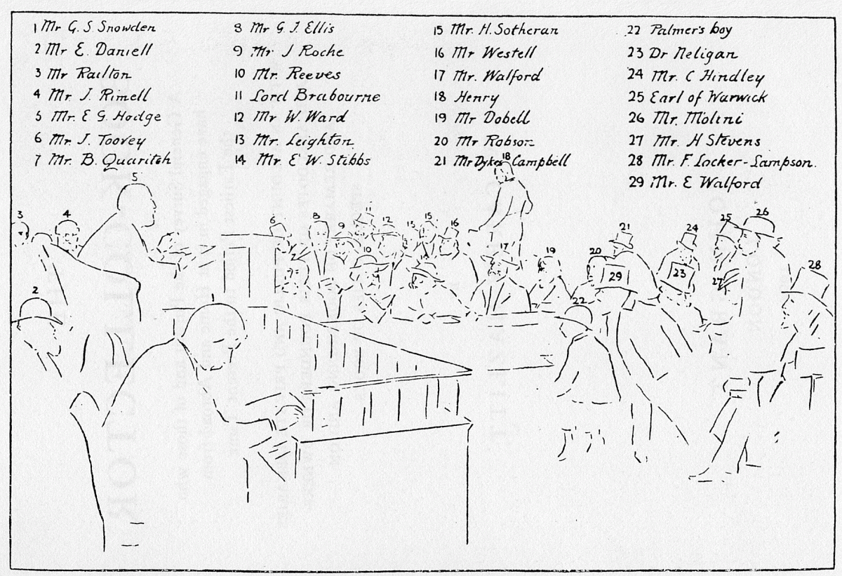 The composition of an average auction-room, where the property is miscellaneous, is a curious and not unedifying study. One beholds a large, closely-packed room, where the atmosphere is not too salubrious, and yet the names which the auctioneer proclaims as those[327] of the buyers are not numerous, are not even in all cases the names of persons present. The reason is that booksellers or their representatives often attend sales for the sake of watching the market or of noting the prices, and are on the spot when a lot occurs which suits them, or for which they have a commission. It is not perhaps too much to say that if the company should be reduced by 75 per cent. the quotations would remain unaltered, for a certain proportion are dummies beyond a moderate figure, and a certain proportion never open their mouths. The latter are spectators, or proprietors, or individuals whose biddings are given from the rostrum by proxy. An experienced dealer will probably guess for whom the salesman or his clerk is acting, and will be guided by such a hint in his own course of proceeding.