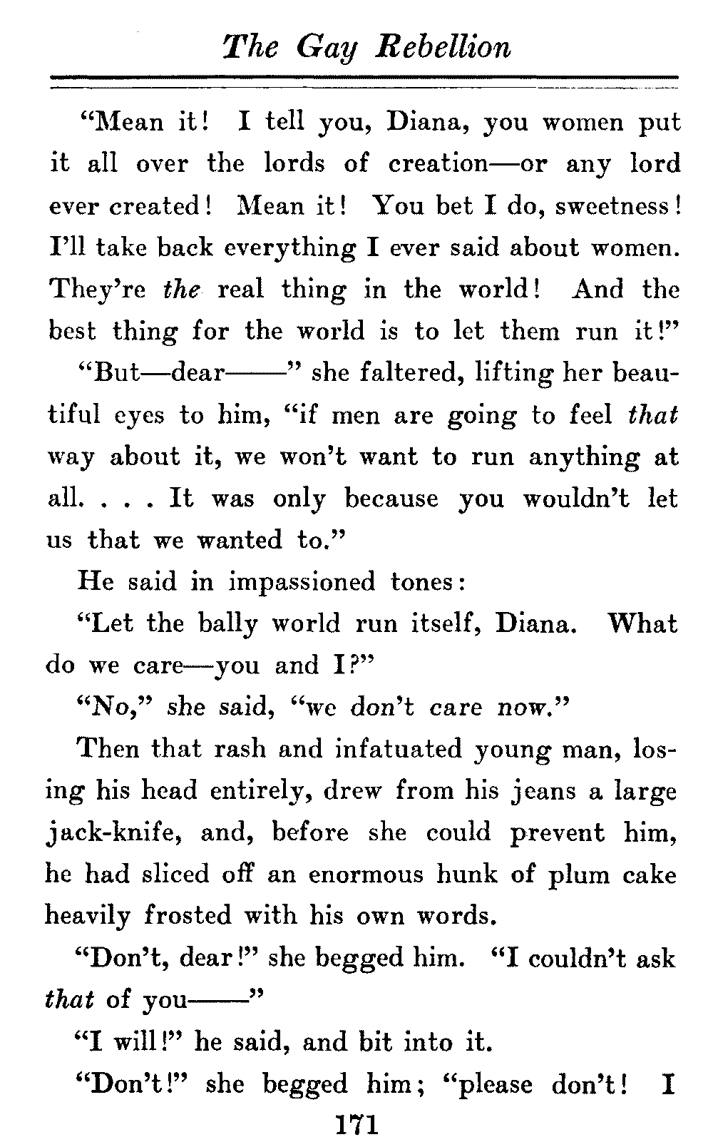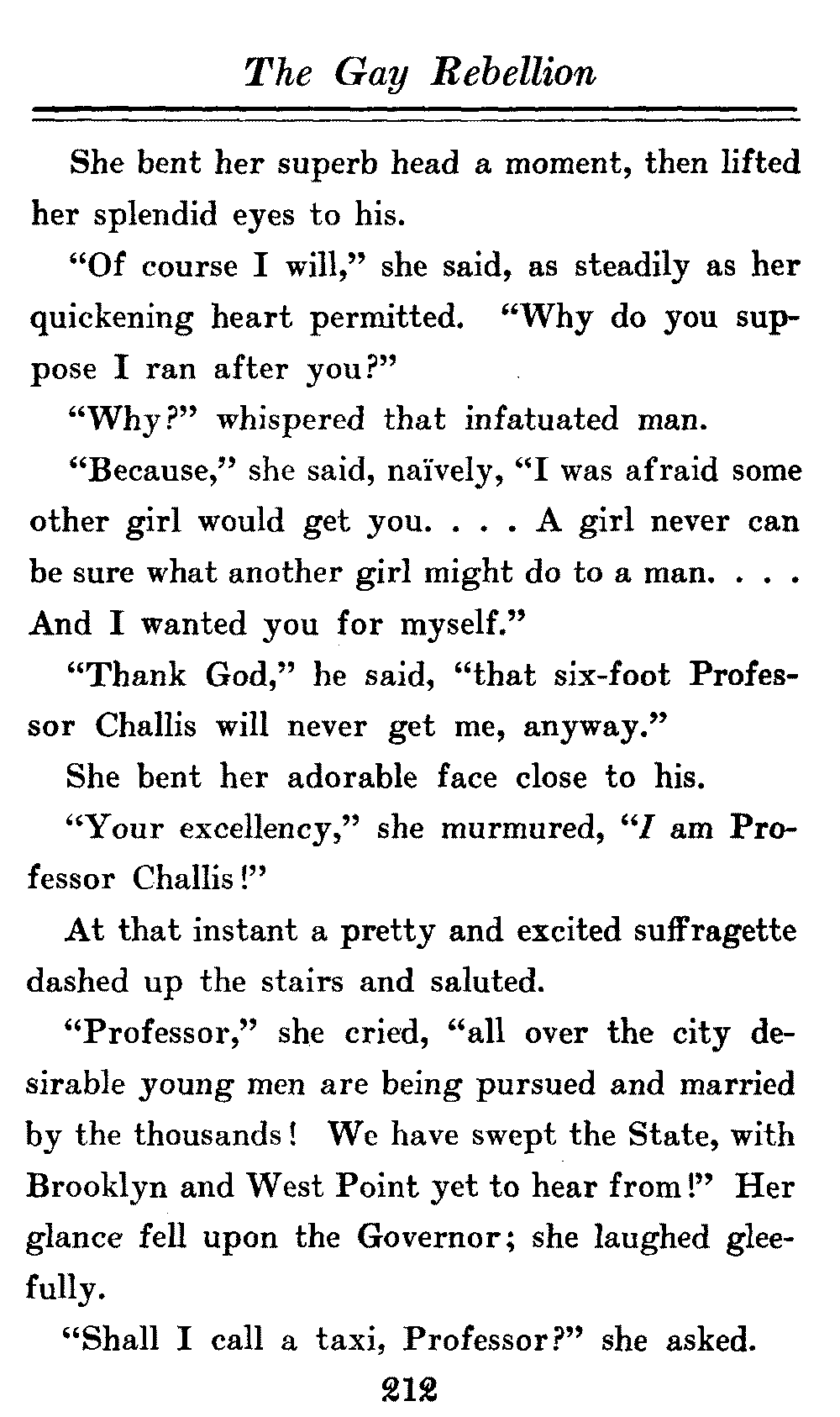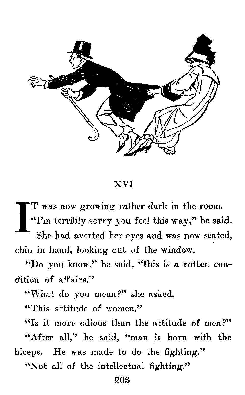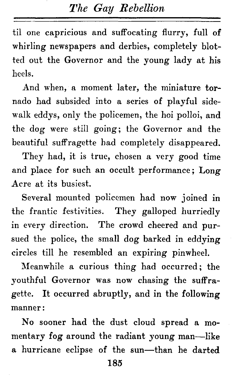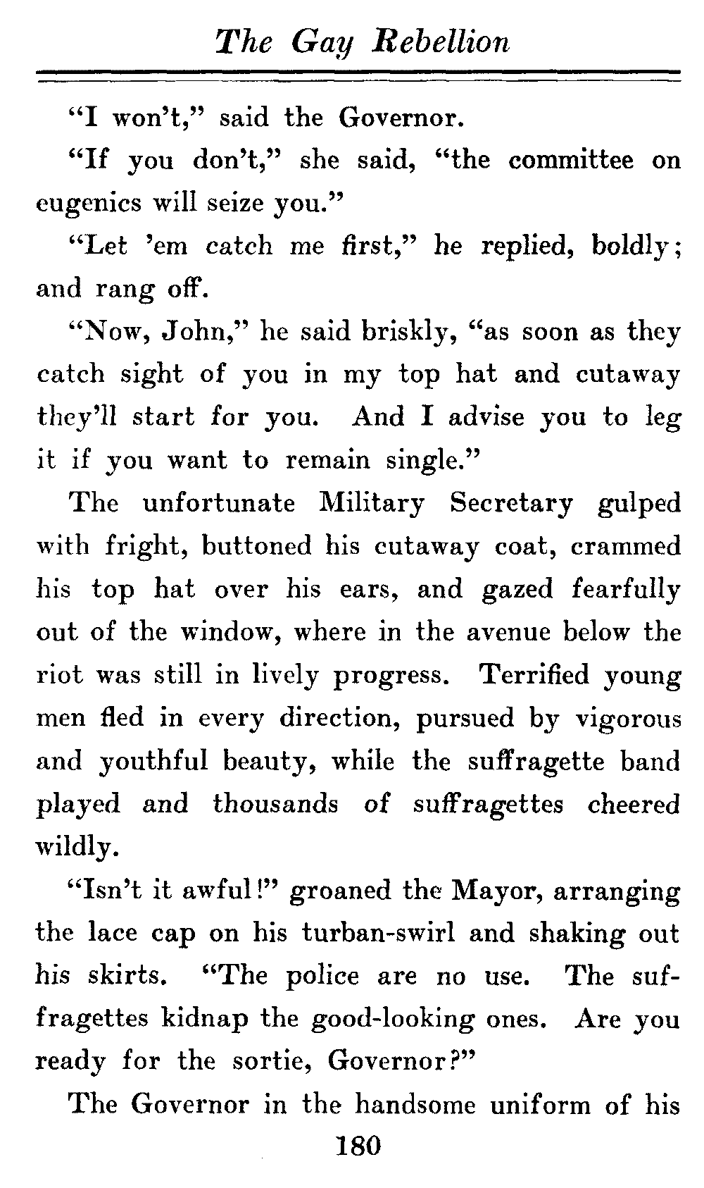 Even Augustus Melnor, owner and editor of that greatest of New York daily newspapers, the Morning Star, continued to pay overwhelming attention to his personal appearance, confident that the great feminine revolt was on its last shapely legs, and that once more womankind would be kind to any kind of mankind, and flirt and frivol and marry, and provide progeny, and rock the cradle as in the good old days of yore.