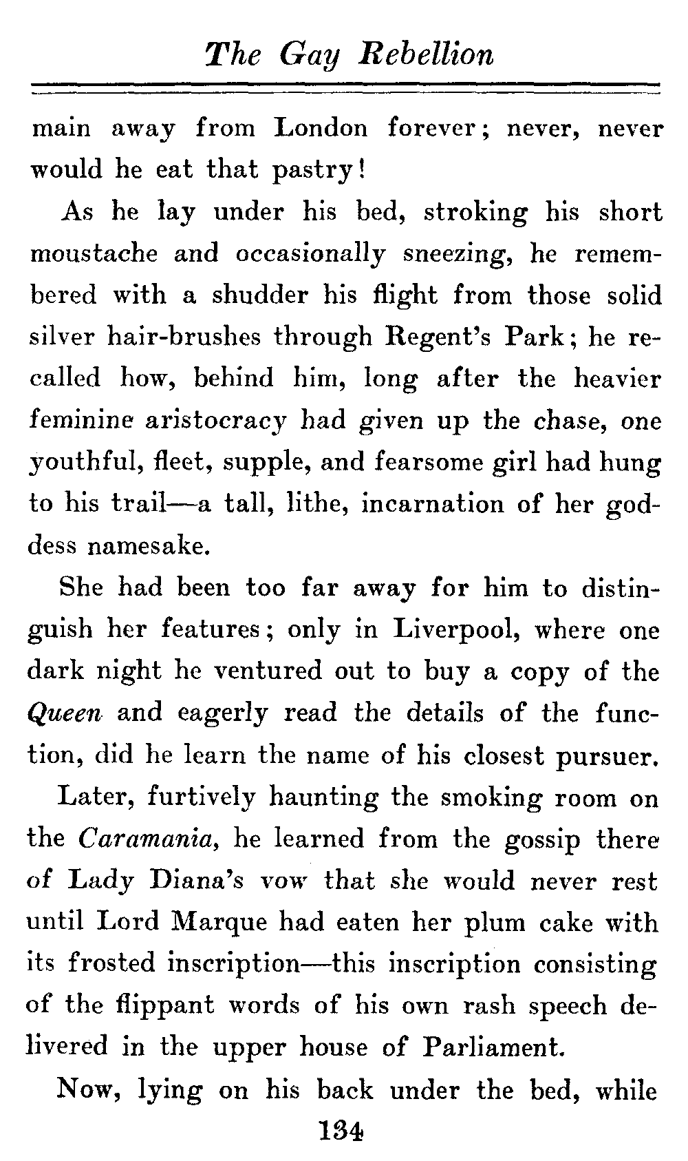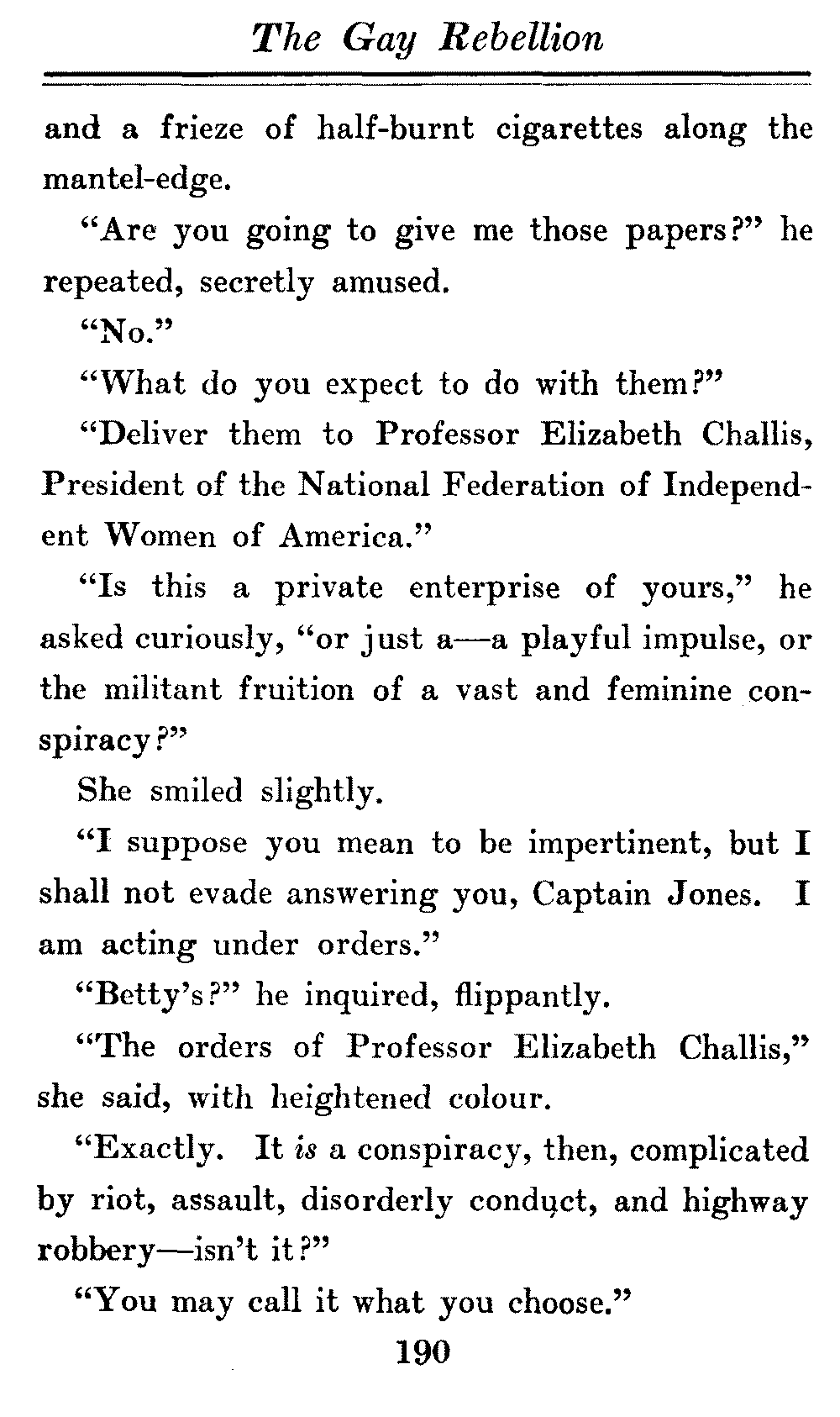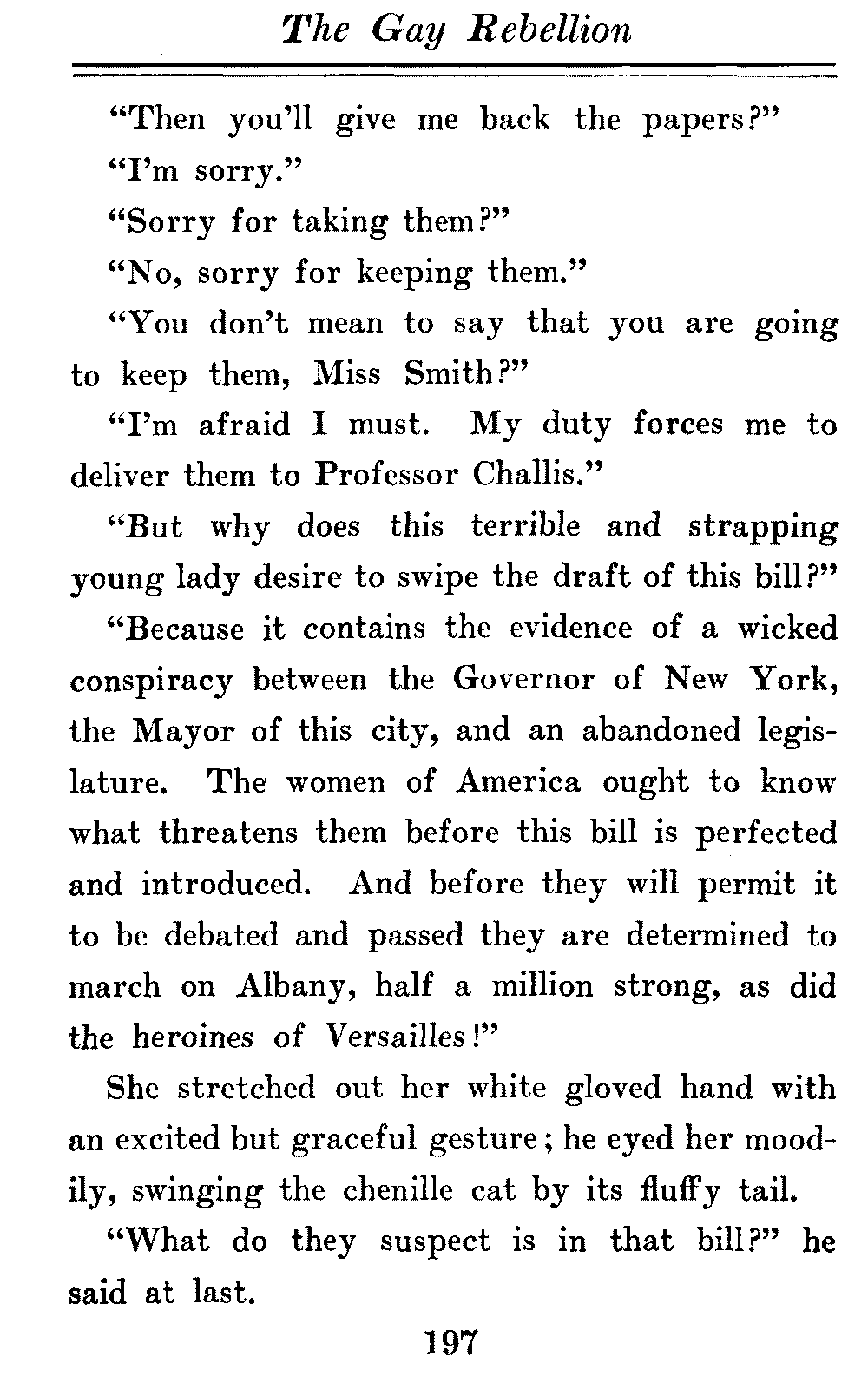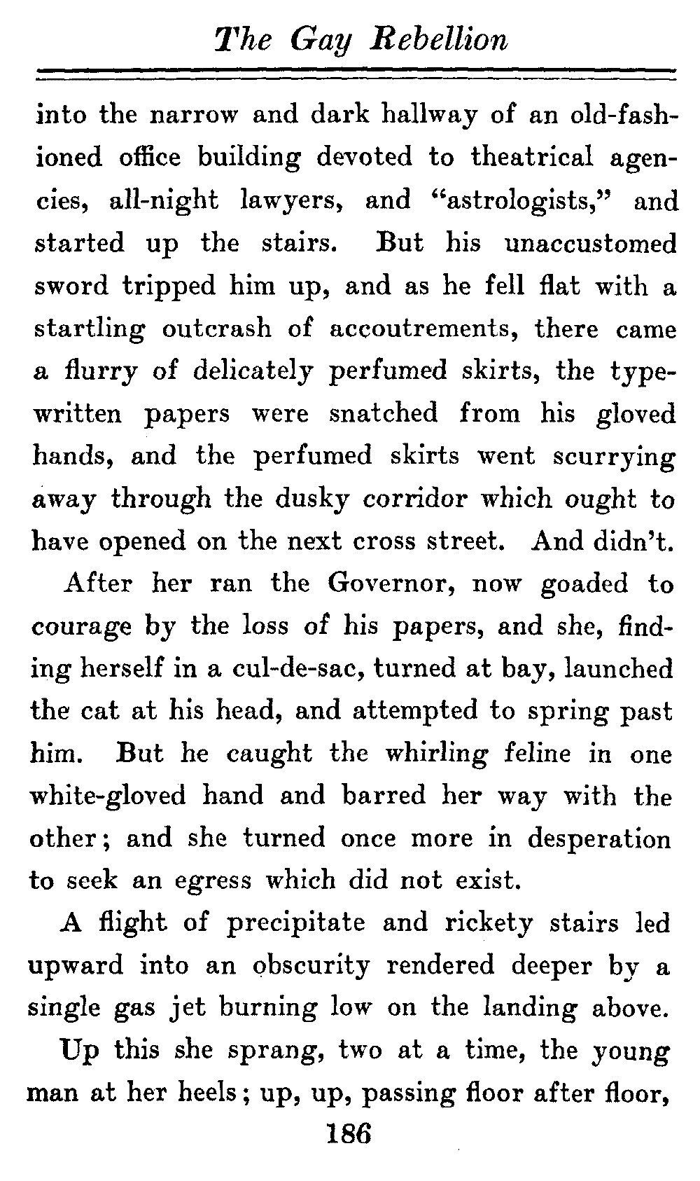 Even Augustus Melnor, owner and editor of that greatest of New York daily newspapers, the Morning Star, continued to pay overwhelming attention to his personal appearance, confident that the great feminine revolt was on its last shapely legs, and that once more womankind would be kind to any kind of mankind, and flirt and frivol and marry, and provide progeny, and rock the cradle as in the good old days of yore.
